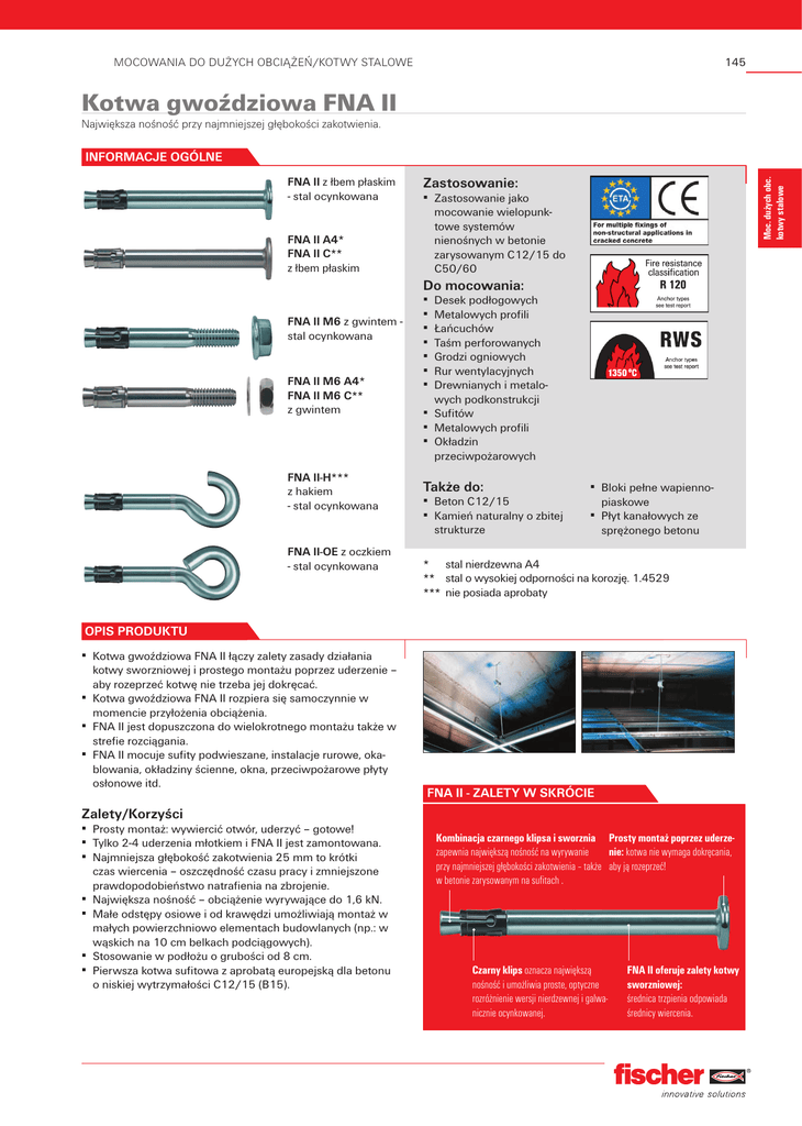 145 MOCOWANIA DO DUŻYCH OBCIĄŻEŃ/KOTWY STALOWE Kotwa gwoździowa FNA II Największa nośność przy najmniejszej głębokości zakotwienia. INFORMACJE OGÓLNE FNA II A4* FNA II C** z łbem płaskim Zastosowanie: Moc. dużych obc. kotwy stalowe FNA II z łbem płaskim - stal ocynkowana ▪ Zastosowanie jako mocowanie wielopunktowe systemów nienośnych w betonie zarysowanym C12/15 do C50/60 Do mocowania: FNA II M6 z gwintem stal ocynkowana FNA II M6 A4* FNA II M6 C** z gwintem FNA II-H*** z hakiem - stal ocynkowana FNA II-OE z oczkiem - stal ocynkowana ▪ Desek podłogowych ▪ Metalowych profili ▪ Łańcuchów ▪ Taśm perforowanych ▪ Grodzi ogniowych ▪ Rur wentylacyjnych ▪ Drewnianych i metalo wych podkonstrukcji ▪ Sufitów ▪ Metalowych profili ▪ Okładzin przeciwpożarowych Także do: ▪ Beton C12/15 ▪ Kamień naturalny o zbitej strukturze ▪ Bloki pełne wapiennopiaskowe ▪ Płyt kanałowych ze sprężonego betonu * stal nierdzewna A4 ** stal o wysokiej odporności na korozję. 1.4529 *** nie posiada aprobaty OPIS PRODUKTU ▪ Kotwa gwoździowa FNA II łączy zalety zasady działania kotwy sworzniowej i prostego montażu poprzez uderzenie – aby rozeprzeć kotwę nie trzeba jej dokręcać. ▪ Kotwa gwoździowa FNA II rozpiera się samoczynnie w momencie przyłożenia obciążenia. ▪ FNA II jest dopuszczona do wielokrotnego montażu także w strefie rozciągania. ▪ FNA II mocuje sufity podwieszane, instalacje rurowe, okablowania, okładziny ścienne, okna, przeciwpożarowe płyty osłonowe itd. FNA II - ZALETY W SKRÓCIE Zalety/Korzyści ▪ Prosty montaż: wywiercić otwór, uderzyć – gotowe! ▪ Tylko 2-4 uderzenia młotkiem i FNA II jest zamontowana. ▪ Najmniejsza głębokość zakotwienia 25 mm to krótki czas wiercenia – oszczędność czasu pracy i zmniejszone prawdopodobieństwo natrafienia na zbrojenie. ▪ Największa nośność – obciążenie wyrywające do 1,6 kN. ▪ Małe odstępy osiowe i od krawędzi umożliwiają montaż w małych powierzchniowo elementach budowlanych (np.: w wąskich na 10 cm belkach podciągowych). ▪ Stosowanie w podłożu o grubości od 8 cm. ▪ Pierwsza kotwa sufitowa z aprobatą europejską dla betonu o niskiej wytrzymałości C12/15 (B15). Kombinacja czarnego klipsa i sworznia Prosty montaż poprzez uderzezapewnia największą nośność na wyrywanie nie: kotwa nie wymaga dokręcania, przy najmniejszej głębokości zakotwienia – także aby ją rozeprzeć! w betonie zarysowanym na sufitach . Czarny klips oznacza największą nośność i umożliwia proste, optyczne rozróżnienie wersji nierdzewnej i galwanicznie ocynkowanej. FNA II oferuje zalety kotwy sworzniowej: średnica trzpienia odpowiada średnicy wiercenia. 146 MOCOWANIA DO DUŻYCH OBCIĄŻEŃ/KOTWY STALOWE Kotwa gwoździowa FNA II z łbem płaskim Moc. dużych obc. kotwy stalowe MONTAŻ Instalacja Montaż wstępny ▪ Preferowany montaż przelotowy ▪ Montaż wstępny Montaż przelotowy DANE TECHNICZNE Kotwa gwoździowa FNA II z łbem płaskim - stal ocynkowana Typ Nr Art. Aprobata Wiertło-∅ Min. głęb.przy montażu przelot Efekt.głębokość kotwienia ■ ETA d0 [mm] td [mm] hef [mm] 6 6 6 6 6 6 6 6 6 6 6 6 6 6 6 6 6 40 45 70 90 115 140 160 45 70 90 45 60 70 90 115 140 160 25 30 30 30 30 30 30 30 30 30 30 30 30 30 30 30 30 FNA II 6 x 25/5 FNA II 6 x 30/5 FNA II 6 x 30/30 FNA II 6 x 30/50 FNA II 6 x 30/75 FNA II 6 x 30/100 FNA II 6 x 30/120 1) 044121 1) 044115 044116 044117 044118 044119 044120 ■ FNA II 6 x 30/5 A4 FNA II 6 x 30/30 A4 FNA II 6 x 30/50 A4 044122 044123 2) 046024 ■ FNA II 6 x30/5 C FNA II 6 x30/20 FNA II 6 x30/30 C FNA II 6 x 30/50 C FNA II 6 x 30/75 C FNA II 6 x 30/100 C FNA II 6 x 30/120 C 044124 506147 044125 500569 500573 500574 500575 ■ 2) 2) 2) 2) Kotwa gwoździowa FNA II A4 lub FNA II C z łbem płaskim - stal nierdzewna oraz stal o podwyższonej odporności na korozję 1.4529 ■ ■ ■ ■ ■ ■ ■ ■ ■ ■ ■ ■ ■ ■ Długość całkowita Maks. długość użytkowa Średnica łba Ilość w opak. l [mm] t fix [mm] [Ø mm] szt. 35 40 65 85 110 135 155 40 65 85 40 55 65 85 110 135 155 5 5 30 50 75 100 120 5 30 50 5 20 30 50 75 100 120 13 13 13 13 13 13 13 13 13 13 13 13 13 13 13 13 13 100 100 50 50 50 50 50 100 50 50 25 50 25 50 50 50 50 1) z sześciokątem w obrębie łba, aby zabezpieczyć przed przekręcaniem kotwy w otworze np.: przy montażu odciągów z drutu lub taśmy perforowanej, i z wgłębieniem centrującym na łbie dla osadzaka FNA-S 2) dostawa na żądanie Kotwa gwoździowa FNA II z Kotwa gwoździowa FNA II A4 lub gwintem - stal ocynkowana FNA II C z gwintem - stal nierdzewna A4, stal o podwyższonej odporności na korozję np. 1.4529 Typ FNA II 6 x 25 M6/5 FNA II 6 x 30 M6/5 FNA II 6 x 30 M6/10 FNA II 6 x 30 M6 x 43 FNA II 6 x 30 M8/5 Nr Art. 044111 044109 046022 1) 044110 044114 FNA II 6 x 30 M6/5 A4 044112 FNA II 6 x 30 M6/5 C 044113 Aprobata Wiertło-∅ Min.głeb.otw. przy montażu przelot Min. głęb. kotwienia Długość całkowita Maks. długość użytkowa Gwint Rozmiar klucza ■ ETA d0 [mm] td [mm] hef [mm] l t fix [mm] M SW [mm] 6 6 6 6 6 6 6 40 45 45 40 45 45 45 25 30 30 30 30 30 30 45 50 55 43 50 50 50 5 5 10 5 5 5 M6 M6 M6 M6 M8 M6 M6 10 10 10 13 10 10 ■ ■ ■ ■ ■ ■ ■ Moment Ilość w opak. dokr.przy zakotwieniu [Nm] szt. 4 4 4 4 4 4 4 100 100 100 100 50 50 25 1) bez podkładki np. do mocowania obejm MOCOWANIA Szczeg. infor. dotyczące podstaw montażu, rodzajów obciążeń, sposobów zakotwień oraz przyg. otworów znajdują się na str. 14. STANDARDY Inf. na temat wymagań prawnych dotyczących mocowań znajdują się na str. 20 pod hasłem APROBATY. 147 MOCOWANIA DO DUŻYCH OBCIĄŻEŃ/KOTWY STALOWE Kotwa gwoździowa FNA II Kotwa gwoździowa FNA II-H z hakiem - stal ocynkowana Typ FNA II 6 x 25 H FNA II 6 x 25 OE Nr Art. Aprobata Wiertło-∅ ■ ETA d0 [mm] 6 6 044126 044127 ■ Kotwa gwoździowa FNA II-OE z oczkiem - stal ocynkowana Min. głębokość