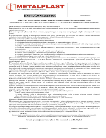 KARTA GWARANCYJNA (pieczątka sprzedawcy) METALPLAST LESZCZYŃSKA FABRYKA OKIEN ROBERT WITKIEWICZ Z SIEDZIBĄ UL. MAGAZYNOWA 4, 64-100 LESZNO, UDZIELA GWARANCJI NA PRODUKOWANĄ PRZEZ SIEBIE STOLARKĘ BUDOWLANĄ NA ZASADACH I WARUNKACH OKREŚLONYCH W NINIEJSZEJ UMOWIE: 1. Karta gwarancyjna stanowi bezwzględnie obowiązujący strony załącznik do faktury nr ..................................... z dnia ........................................................... . 2. Okres gwarancyjny liczy się od chwili przejęcia towaru przez klienta od producenta lub jego partnera handlowego. Po upływie gwarancji gwarant świadczy odpłatnie usługi serwisowe. 3. Producent odpowiada tylko za wady stolarki powstałe z przyczyn tkwiących w samej rzeczy lub wynikających z błędów technologicznych w czasie produkcji. 4. Gwarancja niniejsza obejmuje w okresie jej obowiązywania: wady ukryte, które nie mogły być dostrzeżone przy zakupie; właściwe funkcjonowanie mechanizmów i okuć stolarki; właściwe i trwałe połączenie elementów stolarki i ich niezawodne funkcjonowanie. 5. Gwarancja nie obejmuje wyrobów, które uległy uszkodzeniu na skutek: a) nieprawidłowego transportu towaru wykonanego przez Nabywcę, b) uszkodzeń wynikających z niewłaściwego montażu wykonywanego we własnym zakresie przez Nabywcę, c) samodzielnej wymiany szyb, uszkodzenie listew, nieprawidłowego rozmieszczona podkładek dystansowych wokół szyby i innych przeróbek niezgodnych z przeznaczeniem stolarki okiennej, d) niewłaściwej eksploatacji - niedrożności otworów odwadniająco - odpowietrzających, konserwacji i mycia nieodpowiednimi środkami, braku konserwacji okuć, e) mechanicznych uszkodzeń pakietów szybowych – pęknięć, zarysowań, zgnieceń, f) uszkodzeń stolarki wynikających z błędów konstrukcyjnych budynku, złej wentylacji, g) wyroszenia, przemarzania i konsekwencji w/w zjawisk związanych z niewłaściwymi warunkami klimatycznymi wewnątrz pomieszczeń, h) uszkodzeń dokonanych przez osoby trzecie oraz wskutek zdarzeń losowych. 6. Producent udziela gwarancji na okres 5 lat na trwałość koloru profili skrzydeł i ościeżnic, okucia okienne Winkhaus, szczelność pakietów szybowych, oraz 3-letniego okresu gwarancyjnego na uszczelki i 1 rok na okucia drzwiowe i samozamykacze. Gwarant odpowiada z tytułu udzielonej gwarancji do wysokości wartości zakupionej stolarki. 7. W przypadkach zgłoszenia reklamacji objętych warunkiem gwarancyjnym określonym w pkt. 4, reklamujący zobowiązuje się pokryć koszty obsługi przez serwis wg obowiązującego cennika, o ile reklamacja zostanie odrzucona z winy nieprawidłowej zabudowy lub nieprawidłowego dostosowania wyrobu do warunków w jakich jest używany. Klientowi przysługuje prawo odwołania się do producenta, który w przypadkach braku możliwości uznania roszczeń, może skorzystać za zgodą klienta z opinii biegłych rzeczoznawców budowlanych, których opinii strony zobowiązują się podporządkować. Koszty zaangażowania biegłych, koszty ekspertyzy, jak również koszty producenta w pełni pokrywa strona, której stanowisko jest bezzasadne. 8. Reklamacja nie stanowi powodu do wstrzymania płatności za stolarkę okienną. Towar nie opłacony nie podlega reklamacji. 9. Reklamacje wad jawnych takich jak: ilość sztuk niezgodnych z zamówieniem, uszkodzenia szkła, zarysowania, muszą być natychmiast przy odbiorze pisemnie stwierdzone. Wady nieistotne produktu, które pozostają niewidoczne po zamontowaniu i nie mają wpływu na jego wartość użytkową np. zarysowania, wgniecenia zewnętrznych stron ościeżnic, nie podlegają reklamacji. 10. Reklamacje wad i usterek stolarki należy zgłosić w formie pisemnej w terminie 7 dni od daty ich ujawnienia w siedzibie gwaranta lub autoryzowanego przedstawiciela. Warunkiem jej przyjęcia jest okazanie karty gwarancyjnej i opłaconej faktury za stolarkę. W zgłoszeniu reklamacyjnym należy podać nr faktury lub umowy, przez kogo był wykonany montaż i opis stwierdzonej wady. Reklamacje stolarki budowlanej nie opłaconej przez nabywcę nie będą przyjmowane i realizowane. 11. Serwis gwarancyjny zapewnia bezpłatne usunięcie wszelkich wad produkcyjnych i materiałowych w terminie 30 dni od daty zgłoszenia (termin może jedynie ulec opóźnieniu z przyczyn niezależnych od producenta). Nabywca jest zobowiązany umożliwić gwarantowi sprawdzenie przyczyn zgłoszonej reklamacji, w przeciwnym wypadku termin wykonania napraw gwarancyjnych ulegnie zmianie. 12. W przypadku gdy wady nie da się usunąć a wyrób nadal nadaje się do eksploatacji użytkownik ma prawo do: - zwrotu wartości równoważącej obniżenie jakości wyrobu, - wymiany wadliwego wyrobu na pełnowartościowy wraz z wbudowaniem nowego wyrobu w otworze okiennym, robotami związanymi z doprowadzeniem obok okna do stanu przed wymianą - całkowicie na koszt producenta. Klient przy wymianie okna nie ma prawa żądać wykonania innej konstrukcji, niż wyrób reklamowany. 13. Wadliwa wymieniona stolarka lub jej części stanowią własność gwaranta. 14. Producent nie odpowiada za prawidłowość pomiaru otworu okna, podziału funkcji i rodzaju oszklenia podanych przez klienta (z wyjątkiem wykonania pomiarów przez METALPLAST lub dealera). Ryzyko z tym związane ponosi Kupujący. W przypadku kształtów specjalnych (np. okna łukowe) kupujący jest zobowiązany dostarczyć szablon (lub szkic) sporządzony przez niego i potwierdzony jego podpisem. 15. Producent nie zapewnia transportu towaru do klienta w przypadku montażu wykonywanego we własnym zakresie przez Nabywcę. Kupujący zobowiązany jest do odbioru okien podczas godzin pracy zakładu po wcześniejszym uzgodnieniu terminu odbioru. Jednocześnie powinien posiadać odpowiednie środki w celu zabezpieczenia towaru przed uszkodzeniem podczas transportu. Okna powinny być transportowane w pozycji pionowej. 16. Gwarancja nie wyłącza, nie ogranicza, ani nie zawie