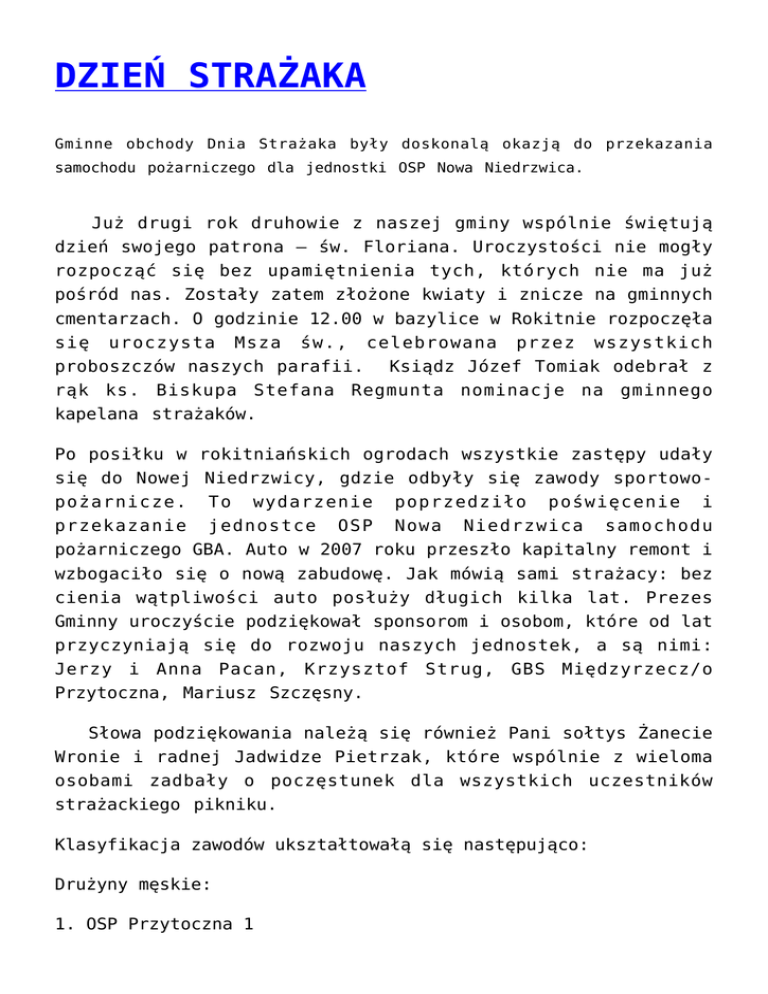 DZIEŃ STRAŻAKA Gminne obchody Dnia Strażaka były doskonalą okazją do przekazania samochodu pożarniczego dla jednostki OSP Nowa Niedrzwica. Już drugi rok druhowie z naszej gminy wspólnie świętują dzień swojego patrona – św. Floriana. Uroczystości nie mogły rozpocząć się bez upamiętnienia tych, których nie ma już pośród nas. Zostały zatem złożone kwiaty i znicze na gminnych cmentarzach. O godzinie 12.00 w bazylice w Rokitnie rozpoczęła się uroczysta Msza św., celebrowana przez wszystkich proboszczów naszych parafii. Ksiądz Józef Tomiak odebrał z rąk ks. Biskupa Stefana Regmunta nominacje na gminnego kapelana strażaków. Po posiłku w rokitniańskich ogrodach wszystkie zastępy udały się do Nowej Niedrzwicy, gdzie odbyły się zawody sportowopożarnicze. To wydarzenie poprzedziło poświęcenie i przekazanie jednostce OSP Nowa Niedrzwica samochodu pożarniczego GBA. Auto w 2007 roku przeszło kapitalny remont i wzbogaciło się o nową zabudowę. Jak mówią sami strażacy: bez cienia wątpliwości auto posłuży długich kilka lat. Prezes Gminny uroczyście podziękował sponsorom i osobom, które od lat przyczyniają się do rozwoju naszych jednostek, a są nimi: Jerzy i Anna Pacan, Krzysztof Strug, GBS Międzyrzecz/o Przytoczna, Mariusz Szczęsny. Słowa podziękowania należą się również Pani sołtys Żanecie Wronie i radnej Jadwidze Pietrzak, które wspólnie z wieloma osobami zadbały o poczęstunek dla wszystkich uczestników strażackiego pikniku. Klasyfikacja zawodów ukształtowałą się następująco: Drużyny męskie: 1. OSP Przytoczna 1 2. OSP Goraj 1 3. OSP Goraj 2 4. OSP Rokitno 5. OSP Przytoczna 2 6. OSP Nowa Niedrzwica MDP 1. OSP Nowa Niedrzwica 2. OSP Przytoczna Wśród pań Przytoczna. th_img_0785 th_img_0795 bezkonkurencyjne okazały się druhny z OSP th_img_0798 th_img_0801 th_img_0805 th_img_0814 th_img_0821 th_img_0822 th_img_0828 th_img_0830 th_img_0843 th_img_0849 th_img_0863 th_img_0866 th_img_0868 th_img_0891 th_img_0892 th_img_0894 th_img_0896 th_img_0897 th_img_0898 th_img_0899 th_img_0900 th_img_0901 th_img_0902 th_img_0903 th_img_0913 th_img_0914 th_img_0922 th_img_0923 th_img_0925 th_img_0942 th_img_1006 th_img_1018 th_img_1027 th_img_1029 th_img_1030 th_img_1031 th_img_1043 th_img_1051 th_img_1059 th_img_1063 th_img_1077 th_img_1084 th_img_1091 th_img_1093 th_img_1103 th_img_1109 th_img_1112 th_img_1118 th_img_1133 th_img_1154 th_img_1160 th_img_1167 th_img_1170 th_img_1178 th_img_1181 th_img_1195 th_img_1209 th_img_1223 th_img_1227 th_img_1229 th_img_1232 th_img_1243 th_img_1249 th_img_1250 th_img_1251 th_img_1252 th_img_1253 th_img_1254 th_img_1255 th_img_1256 th_img_1272 th_img_1275 th_img_1281 th_img_1291 foto: Piotr Jeske
