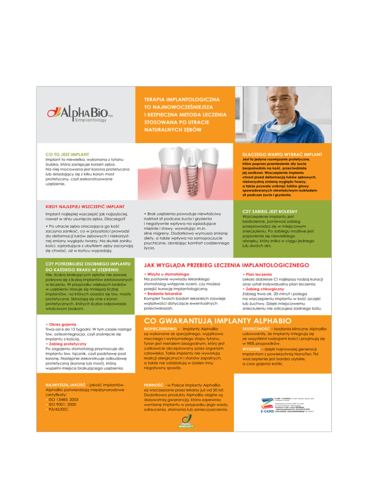 Terapia implantologiczna to najnowocześniejsza i bezpieczna metoda leczenia stosowana po utracie naturalnych zębów Dlaczego warto wybrać implant CO TO JEST IMPLANT Jest to jedyne rozwiązanie protetyczne, które poprzez przeniesienie siły żucia bezpośrednio na kość, przeciwdziała jej zanikowi. Wszczepienie implantu chroni przed deformacją łuków zębowych, niekorzystną zmianą wyglądu twarzy, a także pozwala uniknąć bólów głowy spowodowanych niewłaściwym rozkładem sił podczas żucia i gryzienia. Implant to niewielka, wykonana z tytanu śrubka, która zastępuje korzeń zęba. Na niej mocowana jest korona protetyczna lub składający się z kilku koron most protetyczny, czyli zrekonstruowane uzębienie. Kiedy najlepiej wszczepić implant Implant najlepiej wszczepić jak najszybciej, nawet w dniu usunięcia zęba. Dlaczego? • Po utracie zęba otaczająca go kość zaczyna zanikać, co w przyszłości prowadzi do deformacji łuków zębowych i niekorzystnej zmiany wyglądu twarzy. Na skutek zaniku kości, sąsiadujące z ubytkiem zęby zaczynają się chwiać, aż w końcu wypadają. CZY POTRZEBUJESZ OSOBNEGO IMPLANTU DO KAŻDEGO BRAKU W UZĘBIENIU Nie, liczba brakujących zębów nie zawsze pokrywa się z liczbą implantów zastosowanych w leczeniu. W przypadku większych braków w uzębieniu stosuje się mniejszą liczbę implantów, na których osadza się tzw. mosty protetyczne. Składają się one z koron protetycznych, których liczba odpowiada właściwym brakom. • Okres gojenia Trwa od 6 do 12 tygodni. W tym czasie nastąpi tzw. osteointegracja, czyli zrośnięcie się implantu z kością. • Zabieg protetyczny Po zagojeniu stomatolog przymocuje do implantu tzw. łącznik, czyli podstawę pod koronę. Następnie zrekonstruuje odbudowę protetyczną (koronę lub most), którą wypełni miejsce brakującego uzębienia. Najwyższą jakość – jakość implantów AlphaBio potwierdzają międzynarodowe certyfikaty: • ISO 13485: 2003 • ISO 9001: 2000 • 93/42/EEC • Brak uzębienia powoduje niewłaściwy rozkład sił podczas żucia i gryzienia i negatywnie wpływa na sąsiadujące mięśnie i stawy, wywołując m.in. silne migreny. Dodatkowo wymusza zmianę diety, a także wpływa na samopoczucie psychiczne, obniżając komfort codziennego życia. Czy zabieg jest bolesny Wszczepienie implantu jest bezbolesne, ponieważ zabieg przeprowadza się w miejscowym znieczuleniu. Po zabiegu możliwe jest pojawienie się niewielkiego obrzęku, który znika w ciągu jednego lub dwóch dni. JAK WYGLĄDA PRZEBIEG LECZENIA IMPLANTOLOGICZNEGO • Wizyta u stomatologa Na postawie wywiadu lekarskiego stomatolog wstępnie oceni, czy możesz przejść kurację implantologiczną. • Badania lekarskie Komplet Twoich badań lekarskich rozwieje wątpliwości dotyczące ewentualnych przeciwskazań. • Plan leczenia Lekarz dobierze Ci najlepszy rodzaj kuracji oraz ustali indywidualny plan leczenia. • Zabieg chirurgiczny Zabieg trwa ok. 20 minut i polega na wszczepieniu implantu w kość szczęki lub żuchwy. Dzięki miejscowemu znieczuleniu nie odczujesz żadnego bólu. Co gwarantują implanty AlphaBio Bezpieczeństwo – Implanty AlphaBio są wykonane ze specjalnego, wyjątkowo mocnego i wytrzymałego stopu tytanu. Tytan jest metalem biozgodnym, który jest całkowicie akceptowany przez organizm człowieka. Takie implanty nie wywołują reakcji alergicznych i stanów zapalnych, a także nie oddziałują w żaden inny negatywny sposób. PEWNOŚĆ - w Polsce implanty AlphaBio są wszczepiane przez lekarzy już od 20 lat. Dodatkowo produkty AlphaBio objęte są dożywotnią gwarancją, która zapewnia wymianę implantu w przypadku jego wady, odrzucenia, złamania lub zanieczyszczenia. Skuteczność – badania kliniczne AlphaBio udowodniły, że implanty integrują się ze wszystkimi rodzajami kości i przyjmują się w 98% przypadków. Wygodę – dzięki najnowszej generacji implantom z powierzchnią NanoTec TM wszczepienie jest bardzo szybkie, a czas gojenia krótki. Z-CARD® i PocketMedia® to znaki towarowe używane przez Z Industries na licencji. Wyprodukowano na licencji Z-CARD® Ltd. London tel. +44 (0) 20 7924 5147 www.zcard.com Dystrybucja Z-CARD® w Polsce: ROTOMedia® - wyłączny przedstawiciel Tel. +48 (22) 825 67 05/09 www.zcard.pl www.pocketmedia.pl No. PL044/12