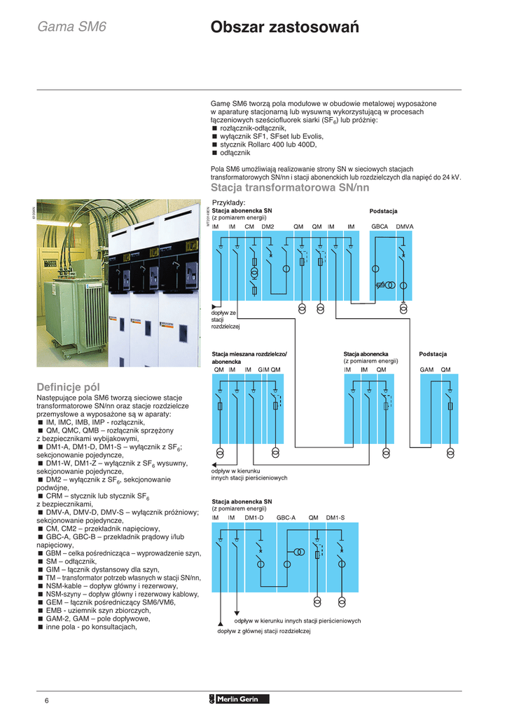 Obszar zastosowaƒ Gama SM6 Gam´ SM6 tworzà pola modu∏owe w obudowie metalowej wyposa˝one w aparatur´ stacjonarnà lub wysuwnà wykorzystujàcà w procesach ∏àczeniowych szeÊciofluorek siarki (SF 6) lub pró˝ni´: roz∏àcznik-od∏àcznik, wy∏àcznik SF1, SFset lub Evolis, stycznik Rollarc 400 lub 400D, od∏àcznik Pola SM6 umo˝liwiajà realizowanie strony SN w sieciowych stacjach transformatorowych SN/nn i stacji abonenckich lub rozdzielczych dla napi´ç do 24 kV . 61004N MT20149EN Stacja transformatorowa SN/nn Definicje pól Nast´pujàce pola SM6 tworzà sieciowe stacje transformatorowe SN/nn oraz stacje rozdzielcze przemys∏owe a wyposa˝one sà w aparaty: IM, IMC, IMB, IMP - roz∏àcznik, QM, QMC, QMB – roz∏àcznik sprz´˝ony z bezpiecznikami wybijakowymi, DM1-A, DM1-D, DM1-S – wy∏àcznik z SF6; sekcjonowanie pojedyncze, DM1-W, DM1-Z – wy∏àcznik z SF6 wysuwny, sekcjonowanie pojedyncze, DM2 – wy∏àcznik z SF6, sekcjonowanie podwójne, CRM – stycznik lub stycznik SF6 z bezpiecznikami, DMV-A, DMV-D, DMV-S – wy∏àcznik pró˝niowy; sekcjonowanie pojedyncze, CM, CM2 – przek∏adnik napi´ciowy, GBC-A, GBC-B – przek∏adnik pràdowy i/lub napi´ciowy, GBM – celka poÊredniczàca – wyprowadzenie szyn, SM – od∏àcznik, GIM – ∏àcznik dystansowy dla szyn, TM – transformator potrzeb w∏asnych w stacji SN/nn, NSM-kable – dop∏yw g∏ówny i rezerwowy, NSM-szyny – dop∏yw g∏ówny i rezerwowy kablowy, GEM – ∏àcznik poÊredniczàcy SM6/VM6, EMB - uziemnik szyn zbiorczych, GAM-2, GAM – pole dop∏ywowe, inne pola - po konsultacjach, 6 Obszar zastosowaƒ Gama SM6 Gama SM6 MT20150EN Przemys∏owe stacje rozdzielcze rezerwowe z rezerwowe 7 Przeglàd typów pól wed∏ug zastosowaƒ Gama SM6 Przy∏àczenie do sieci Roz∏àcznik IM (375 lub 500 mm) 28 MT20153 MT20152 MT20151 strona Roz∏àcznik IMC (500 mm) Roz∏àcznik z uziemnikiem lub bez, odejÊcie w prawo lub lewo IMB (375 mm) 30 8 Roz∏àcznik z bezpiecznikami wybijakowymi QM (375 mm) MT20157 MT20156 MT20155 Pole z roz∏àcznikiem + bezpieczniki Roz∏àcznik z bezpiecznikami wybijakowymi QMC (625 mm) Roz∏àcznik z bezpiecznikami wybijakowymi, odprowadzenie w prawo lub lewo QMB (375 mm) Przeglàd typów pól wed∏ug zastosowaƒ Gama SM6 Pole ze stycznikiem Gama SM6 MT20159 MT20158 strona Stycznik CRM (750 mm) 31 Stycznik z bezpiecznikami wybijakowymi CRM (750 mm) MT20161 MT20160 Pole z wy∏àcznikiem SF6 MT20163 MT20162 33 Wy∏àcznik z pojedynczym sekcjonowaniem, wyprowadzenie w prawo lub w lewo DM1-D (750 mm) Wy∏àcznik z pojedynczym sekcjonowaniem DM1-A (750 mm) 32 Wy∏àcznik z pojedynczym sekcjonowaniem, z autonomicznym zabezpieczeniem DM1-S (750 mm) Wy∏àcznik z pojedynczym sekcjonowaniem, wyprowadzenie w prawo lub lewo DM2 (750 mm) 9 Przeglàd typów pól wed∏ug zastosowaƒ Gama SM6 Pole z wy∏àcznikiem SF6 MT20165 MT20164 strona Wy∏àcznik wysuwny z pojedynczym sekcjonowaniem DM1-W (750 mm) 34 Wy∏àcznik wysuwny z pojedynczym sekcjonowaniem, wyprowadzeniem w prawo DM1-Z (750 mm) MT20167 MT20166 Pole z wy∏àcznikiem pró˝niowym Wy∏àcznik z pojedynczym sekcjonowaniem DMV-A (625 mm) MT20168 35 36 10 Wy∏àcznik z pojedynczym sekcjonowaniem, z zabezpieczeniem autonomicznym DMV-S (625 mm) Wy∏àcznik z pojedynczym sekcjonowaniem, wyprowadzenie w prawo DMV-D (625 mm) Przeglàd typów pól wed∏ug zastosowaƒ Gama SM6 Pomiar energii po stronie SN Gama SM6 MT20170 MT20169 strona Przek∏adnik napi´ciowy dla sieci z zerem uziemionym, w uk∏adzie gwiazda CM (375 mm) 37 Przek∏adnik napi´ciowy dla sieci z zerem izolowanym, w uk∏adzie “V” CM2 (500 mm) MT20172 MT20171 36 Pomiar pràdu i /lub napi´cia, wyprowadzenie w prawo lub w lewo GBC-A (750 mm) Pomiar pràdu i /lub napi´cia GBC-B (750 mm) 11 Przeglàd typów pól wed∏ug zastosowaƒ Gama SM6 ¸àczniki pól ¸àcznik dystansowy dla szyn GIM (125 mm) 39 12 ¸àcznik poÊredniczàcy VM6/ SM6 GEM (125 mm) MT20177 MT20176 38 MT20175 MT20173 MT20173 strona Pole dop∏ywowe GAM2 (375 mm) Pole dop∏ywowe GAM (500 mm) Pole poÊredniczàce z wyprowadzeniem szyn w prawo lub w lewo GBM (375 mm) Przeglàd typów pól wed∏ug zastosowaƒ Gama SM6 Inne funkcje Gama SM6 MT20180 MT20179 MT20178 strona MT20181 Transformator SN/nn potrzeb w∏asnych TM (375 mm) 41 Przedzia∏ z uziemnikiem szyn zbiorczych EMB (375 mm) MT20182 Od∏àcznik SM (375 or 500 mm) 40 WejÊcie kablowe zasilanie g∏ówne i rezerwowe NSM-kable (750 mm) WejÊcie szynowe z prawej lub z lewej (zasilanie g∏ówne) i kablowe zasilanie rezerwowe NSM-szyny (750 mm) 13 Warunki eksploatacji SM6, przy swoich korzystnych charakterystykach technicznych, stanowi odpowiedê na wymagania dotyczàce bezpieczeƒstwa osób, u∏atwia instalowanie i eksploatacj´ oraz spe∏nia wymagania dotyczàce ochrony Êrodowiska. Pola SM6 sà przeznaczone do eksploatacji w warunkach wn´trzowych (stopieƒ ochrony IP2XC). Zaletà sà zredukowane wymiary: szerokoÊç 375 do 750 mm, wysokoÊç 1600 mm do 2050 g∏´bokoÊç 840 mm do 1220 ... które umo˝liwiajà instalacj´ w ma∏ych pomieszczeniach i w stacjach prefabrykowanych. Dost´p do przy∏àczy jest od przodu celki. Urzàdzenia s∏u˝àce do sterowania sà umieszczone z przodu co u∏atwia obs∏ug´. Pola mogà byç bogato wyposa˝one w elementy pomocnicze (przekaêniki zabezpieczeniowe, przek∏adniki, w tym przek∏adniki Ferrantiego, odgromniki, uk∏ady kontroli i sterowania itd. 61000N Gama SM6 Normy Pola gamy SM6 spe∏niajà wymagania nast´pujàcych norm: normy mi´dzynarodowe IEC i europejskie EN: IEC 60694/EN 60694 IEC 62271-100/EN 62271-100 IEC 62271-102/EN 62271-102 IEC 62271-200/EN 62271-200 IEC 60265/EN 60265 IEC 60420/EN 60420 IEC 60255/EN 60255 normy polskie: PN-EN 60694: 2004, PN-EN 62271-100:2004 PN-EN 62271-102:2005 PN-EN 62271-200:2005(U) PN-EN 60265-1:2001 PN-EN 60265-2:2002(U) PN-93/E-06111 PN-EN 60255 (norma wielocz´Êciowa) Identyfikacja Pola SM6 sà identyfiko