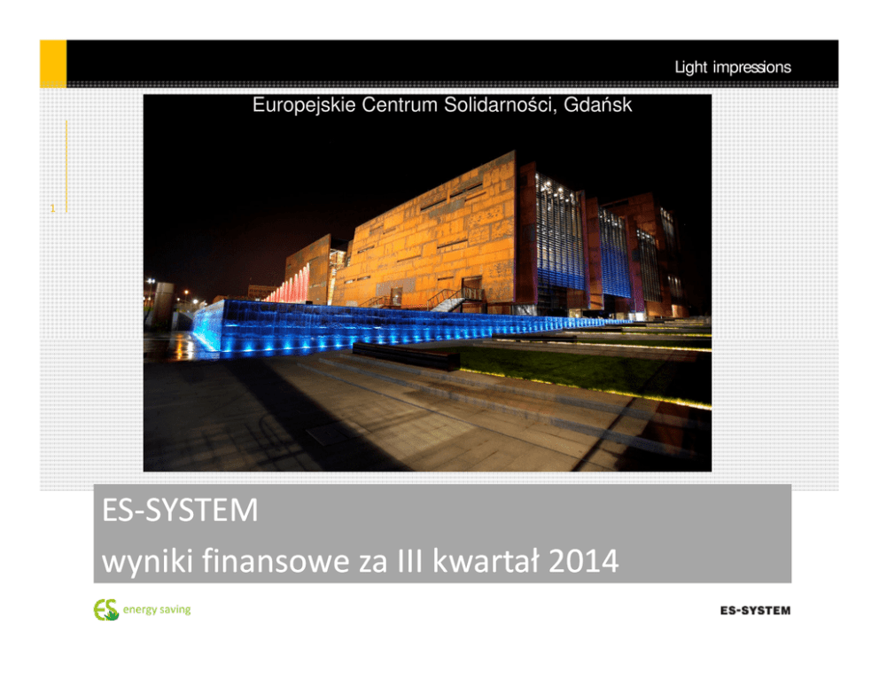 Light impressions Europejskie Centrum Solidarności, Gdańsk 1 ESES-SYSTEM wyniki finansowe za III kwartał 2014 energy saving Light impressions 1. Otoczenie rynkowe 2. Wyniki finansowe 2 3. Perspektywy IV kwartału 2014 r. energy saving Branża oświetleniowa na tle rynku budowlanego Light impressions Zmiany produkcji budowlano-montażowej (r/r), 2013-2014 (w %) 17,4 14,4 5,6 12,2 3 10,0 I II III IV 8,0 V VI -3,9 1,1 VII -5,2 5,8 -3,6 VIII -11,1 IX X XI -4,8 -3,2 -2,9 XII -11,4 -16,1 -18,5 -18,3 -23,1 -27,5 2013 2014 Dynamika produkcji budowlano-montażowej we wrześniu 2014 była wyższa o 5,6% r/r: W porównaniu do września 2013 wzrost produkcji firm zajmujących się robotami związanymi z: robotami inżynieryjnymi (14,1%), specjalistycznymi (10,5%), spadki w obszarze firm wznoszących budynki (-7,1%) W sierpniu 2014 r. wzrost produkcji urządzeń elektrycznych o 4,3% r/r. Branża oświetleniowa wzrost na poziomie ok. 5-6% r/r. energy saving ES-SYSTEM GK – wyniki finansowe za III kwartał 2014 roku 4 PRZYCHODY NETTO 46,9 mln zł - wzrost o 11,7% r/r ZYSK NETTO 4,5 mln zł - wzrost o 116,8% r/r ZYSK EBIT 4,6 mln zł - wzrost o 90,6% EBITDA ŚRODKI PIENIĘŻNE energy saving Light impressions 6,7 mln zł - wzrost o 53,9% r/r stan na koniec okresu: 20,5 mln zł – wzrost o 24% r/r Light impressions Sprzedaż zgodnie z oczekiwaniami + 1,7% 55 000 50 000 45 000 40 000 5 0,93% 3,95% + 11,7% 4,0% + 9,9% 0,8% 35 000 30 000 53 889 52 996 25 000 20 000 15 000 34 485 34 165 38 073 36 571 43 769 42 022 34 165 33 897 40 181 36 571 46 919 42 022 10 000 5 000 0 I Q 12/13 II Q 12/13 III Q 12/13 IV Q 12/13 I Q 13/14 II Q 13/14 III Q 13/14 Przychody: w III kw. 46,9 mln tj. wzrost o 11,7% r/r w I-III kw. 120,99 mln zł tj. wzrost o 7,3% r/r Zysk brutto na sprzedaży wyniósł: w III kw. 18,3 mln tj. wzrost o 17,1% r/r w I-III kw. 46,2 mln zł tj. wzrost 12,5% r/r Marża wyrażona w % na sprzedaży ogółem w I-III kw. 2014 r. wyższa niż w analogicznym okresie 2013 r., tj. 38,2% - wzrost o 1,8 p.p. r/r. energy saving Przychody ze sprzedaży w kraju w górę W III kw. 2014 roku Grupa zrealizowała sprzedaż w kraju na poziomie 39,4 mln zł, co oznacza wzrost o 13,1% r/r. Za I-III kw. wzrost o 12,1% do poziomu 101,2 mln zł. Sprzedaż krajowa Grupy w segmentach: 6 Light impressions w segmencie oświetlenia architektonicznego w III kw. wzrost o 18% r/r w oświetleniu zewnętrznym w III kw. wzrost o ok. 20,5% r/r oświetlenie przemysłowe w III kw. spadek o 12,8% r/r sprzedaż do kanału hurtowego w III kw. wyniosła ok. 44,8% całkowitej sprzedaży w kraju – wzrost wartościowo o 6,9% r/r W I-III kw. sprzedaż sprzętu w technologii LED stanowiła 27,6% sprzedaży krajowej w porównaniu z 13,9% w 2013 roku. energy saving Zagranica nadrabia sprzedaż Light impressions 7 W III kw. Grupa zanotowała sprzedaż eksportową na poziomie 7,5 mln zł, tj. 4,7% wzrostu r/r. Narastająco sprzedaż eksportowa spadła o 12% r/r do poziomu 19,8 mln zł. Rosja i Ukraina poniżej oczekiwań w związku ze wstrzymaniem inwestycji i zawieszeniem projektów. poszukiwanie alternatywnych rynków w Kazachstanie i Azerbejdżanie. Wzrosty sprzedaży w regionie OVEC (Krajach Zamorskich) oraz krajach bałtyckich. Sprzedaż produktów LED na rynku eksportowym wzrosła w III kw. o 146% r/r i osiągnęła 36% sprzedaży eksportowej. W I-III kw. br. udział na poziomie 33%. energy saving Light impressions Wzrost zysków i poprawa marży 4 500 + 90,6% 67,2% 4 000 3 500 + 271,19 % 3 000 2 500 8 4 857 4 593 2 000 97,4% + 57,02% 1 500 2 410 2 410 1 000 1 592 1 107 500 705 1 107 649 29 0 -615 -429 -429 -500 -233 -1 000 I Q 12/13 II Q 12/13 III Q 12/13 IV Q 12/13 I Q 13/14 II Q 13/14 III Q 13/14 W I-III kw. 2014 r. zysk operacyjny Grupy wyniósł 4,4 mln tj. wzrost 42,1 % r/r - pochodna wzrostu sprzedaży. Na koniec września br. marża EBIT wyniosła 3,6% wobec 2,7% w 2013 r. Czynniki kosztowe - wzrost kosztów operacyjnych w I-III kw. o 12% (koszty sprzedaży o 16%, koszty zarządu o 7%), w tym: udział w Targach L&B połączenia zakładów w Wilkasach i Rzeszowie, wzrost wynagrodzeń (w części zależne od wielkości obrotu) wyższy koszt prowizji handlowych Saldo pozostałych przychodów i kosztów operacyjnych było ujemne i wyniosło -0,2 mln zł (versus -0,8 w 2013 r.). Działalność finansowa w I-III kw. 2014 roku przyniosła poprawę zysku brutto o 0,3 mln zł (analogicznie r/r.). energy saving Light impressions Zysk netto 2 500 + 116,8 % 67,6% + 409,3 % 4 526 4 085 2 000 2 088 9 + 116,70 % 1 500 88,6% 2 088 1 000 1 323 1 259 500 1 259 581 410 144 0 -212 -212-126 -758 -500 -1 000 I Q 12/13 II Q12/13 III Q12/13 IV Q12/13 I Q13/14 II Q13/14 Narastająco Grupa po I-III kw. zanotowała 4,5 mln zł zysku netto, tj. wzrost 44,9% r/r. Marża netto wyniosła 3,8% wobec 2,8% w analogicznym okresie 2013 roku. energy saving III Q13/14 ES-SYSTEM – perspektywy IV kwartału 2014 roku 10 Light impressions W okresie lipiec-wrzesień 2014 widoczne było ożywienie popytu na rynku krajowym. W oparciu o wyniki 3 kwartału 2014 roku, aktualny poziom zamówień oraz plany sprzedaży, Zarząd oczekuje wzrostu wyniku sprzedaży krajowej całego roku 2014 roku w stosunku do wyniku 2013 roku. energy saving Przykładowe realizacje w III kwartale br. • • 11 • • • Wiener Linien, rozbudowa infrastruktury kolejowej, Austria Modernizacja oświetlenia ulicznego, Sered, Słowacja Pitesti building – biurowiec, Pitesti, Rumunia City Hall (kontynuacja) w Assen/Holandia Centra handlowe w Kaliningradzie i Kazaniu, Rosja energy saving • • • • • • • • • • • • • • Light impressions Volvo - biurowiec, Wrocław Galeria Warmińska, Olsztyn Ambasada Arabii Saudyjskiej, Warszawa Ambasada Indii, Warszawa Prokuratura, Bielsko-Biała Zakłady produkcyjne Wełny Mineralnej PETRALAN, Bytom Wielkopolskie Centrum Wspierania Inwestycji - II etap, Poznań Wielkopolski Urząd Wojewódzki, Poznań Zespół Szkół Mistrzostwa Sportowego, P