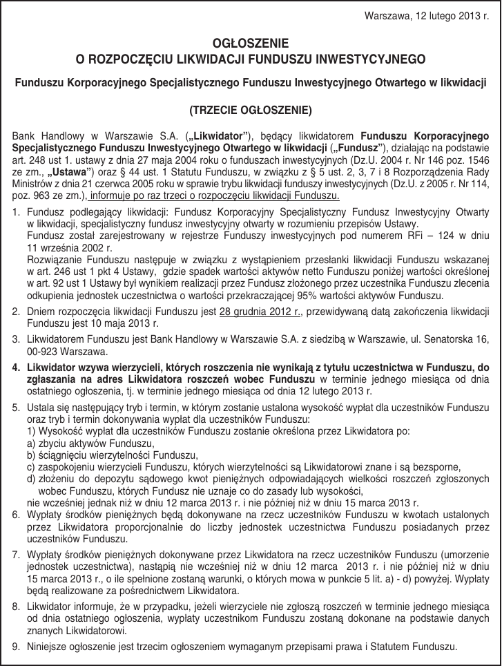 Warszawa, 12 lutego 2013 r. OGŁOSZENIE O ROZPOCZĘCIU LIKWIDACJI FUNDUSZU INWESTYCYJNEGO Funduszu Korporacyjnego Specjalistycznego Funduszu Inwestycyjnego Otwartego w likwidacji (TRZECIE OGŁOSZENIE) Bank Handlowy w Warszawie S.A. („Likwidator”), będący likwidatorem Funduszu Korporacyjnego Specjalistycznego Funduszu Inwestycyjnego Otwartego w likwidacji („Fundusz”), działając na podstawie art. 248 ust 1. ustawy z dnia 27 maja 2004 roku o funduszach inwestycyjnych (Dz.U. 2004 r. Nr 146 poz. 1546 ze zm., „Ustawa”) oraz § 44 ust. 1 Statutu Funduszu, w związku z § 5 ust. 2, 3, 7 i 8 Rozporządzenia Rady Ministrów z dnia 21 czerwca 2005 roku w sprawie trybu likwidacji funduszy inwestycyjnych (Dz.U. z 2005 r. Nr 114, poz. 963 ze zm.), informuje po raz trzeci o rozpoczęciu likwidacji Funduszu. 1. Fundusz podlegający likwidacji: Fundusz Korporacyjny Specjalistyczny Fundusz Inwestycyjny Otwarty w likwidacji, specjalistyczny fundusz inwestycyjny otwarty w rozumieniu przepisów Ustawy. Fundusz został zarejestrowany w rejestrze Funduszy inwestycyjnych pod numerem RFi – 124 w dniu 11 września 2002 r. Rozwiązanie Funduszu następuje w związku z wystąpieniem przesłanki likwidacji Funduszu wskazanej w art. 246 ust 1 pkt 4 Ustawy, gdzie spadek wartości aktywów netto Funduszu poniżej wartości określonej w art. 92 ust 1 Ustawy był wynikiem realizacji przez Fundusz złożonego przez uczestnika Funduszu zlecenia odkupienia jednostek uczestnictwa o wartości przekraczającej 95% wartości aktywów Funduszu. 2. Dniem rozpoczęcia likwidacji Funduszu jest 28 grudnia 2012 r., przewidywaną datą zakończenia likwidacji Funduszu jest 10 maja 2013 r. 3. Likwidatorem Funduszu jest Bank Handlowy w Warszawie S.A. z siedzibą w Warszawie, ul. Senatorska 16, 00-923 Warszawa. 4. Likwidator wzywa wierzycieli, których roszczenia nie wynikają z tytułu uczestnictwa w Funduszu, do zgłaszania na adres Likwidatora roszczeń wobec Funduszu w terminie jednego miesiąca od dnia ostatniego ogłoszenia, tj. w terminie jednego miesiąca od dnia 12 lutego 2013 r. 5. Ustala się następujący tryb i termin, w którym zostanie ustalona wysokość wypłat dla uczestników Funduszu oraz tryb i termin dokonywania wypłat dla uczestników Funduszu: 1) Wysokość wypłat dla uczestników Funduszu zostanie określona przez Likwidatora po: a) zbyciu aktywów Funduszu, b) ściągnięciu wierzytelności Funduszu, c) zaspokojeniu wierzycieli Funduszu, których wierzytelności są Likwidatorowi znane i są bezsporne, d) złożeniu do depozytu sądowego kwot pieniężnych odpowiadających wielkości roszczeń zgłoszonych wobec Funduszu, których Fundusz nie uznaje co do zasady lub wysokości, nie wcześniej jednak niż w dniu 12 marca 2013 r. i nie później niż w dniu 15 marca 2013 r. 6. Wypłaty środków pieniężnych będą dokonywane na rzecz uczestników Funduszu w kwotach ustalonych przez Likwidatora proporcjonalnie do liczby jednostek uczestnictwa Funduszu posiadanych przez uczestników Funduszu. 7. Wypłaty środków pieniężnych dokonywane przez Likwidatora na rzecz uczestników Funduszu (umorzenie jednostek uczestnictwa), nastąpią nie wcześniej niż w dniu 12 marca 2013 r. i nie później niż w dniu 15 marca 2013 r., o ile spełnione zostaną warunki, o których mowa w punkcie 5 lit. a) - d) powyżej. Wypłaty będą realizowane za pośrednictwem Likwidatora. 8. Likwidator informuje, że w przypadku, jeżeli wierzyciele nie zgłoszą roszczeń w terminie jednego miesiąca od dnia ostatniego ogłoszenia, wypłaty uczestnikom Funduszu zostaną dokonane na podstawie danych znanych Likwidatorowi. 9. Niniejsze ogłoszenie jest trzecim ogłoszeniem wymaganym przepisami prawa i Statutem Funduszu.