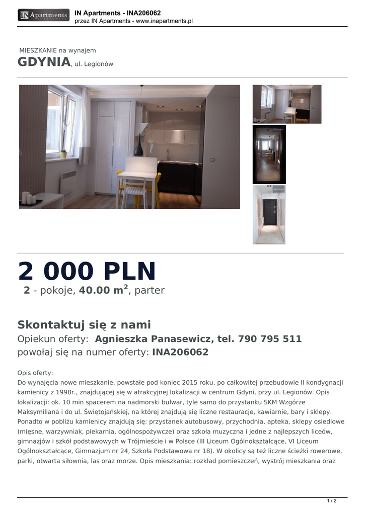 IN Apartments - INA206062 przez IN Apartments - www.inapartments.pl MIESZKANIE na wynajem GDYNIA, ul. Legionów 2 000 PLN 2 - pokoje, 40.00 m2, parter Skontaktuj się z nami Opiekun oferty: Agnieszka Panasewicz, tel. 790 795 511 powołaj się na numer oferty: INA206062 Opis oferty: Do wynajęcia nowe mieszkanie, powstałe pod koniec 2015 roku, po całkowitej przebudowie II kondygnacji kamienicy z 1998r., znajdującej się w atrakcyjnej lokalizacji w centrum Gdyni, przy ul. Legionów. Opis lokalizacji: ok. 10 min spacerem na nadmorski bulwar, tyle samo do przystanku SKM Wzgórze Maksymiliana i do ul. Świętojańskiej, na której znajdują się liczne restauracje, kawiarnie, bary i sklepy. Ponadto w pobliżu kamienicy znajdują się: przystanek autobusowy, przychodnia, apteka, sklepy osiedlowe (mięsne, warzywniak, piekarnia, ogólnospożywcze) oraz szkoła muzyczna i jedne z najlepszych liceów, gimnazjów i szkół podstawowych w Trójmieście i w Polsce (III Liceum Ogólnokształcące, VI Liceum Ogólnokształcące, Gimnazjum nr 24, Szkoła Podstawowa nr 18). W okolicy są też liczne ścieżki rowerowe, parki, otwarta siłownia, las oraz morze. Opis mieszkania: rozkład pomieszczeń, wystrój mieszkania oraz 1/2 IN Apartments - INA206062 przez IN Apartments - www.inapartments.pl oświetlenie zostały zaprojektowane przez architekta wnętrz. Mieszkanie wykończone jest w wysokim standardzie: na ścianach farby Fluegger; na podłodze kafle i panele; parapety kamienne; w łazience kafle i beton architektoniczny; dźwiękoszczelne i zatrzymujące ciepło drzwi zewnętrzne Interdoor. Mieszkanie jest wyposażone (jak na zdjęciach) w nowe zabudowy meblowe, sprzęt AGD, oświetlenie i zasłony okienne: przedpokój: szafa wnękowa; - aneks kuchenny: szafki kuchenne, zlew z baterią, piekarnik, płyta indukcyjna, okap, lodówka z zamrażarką, zmywarka; - pokój dzienny: szafa wnękowa, kanapa, stół i krzesła, szafka RTV; - sypialnia: szafa, łóźko; - łazienka: prysznic, toaleta, umywalka z szafką, szafka wnękowa, pralka. Preferowany okres najmu: min. 1 rok Do ceny najmu należy doliczyć VAT 23%. Cena wynajmu: 2000zł + opłaty (prąd i woda) 2/2 Powered by TCPDF (www.tcpdf.org)