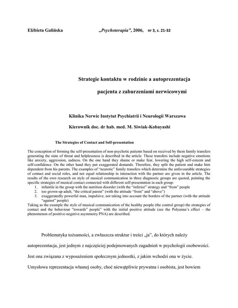 Elżbieta Galińska „Psychoterapia”, 2006, nr 3, s. 21-32 Strategie kontaktu w rodzinie a autoprezentacja pacjenta z zaburzeniami nerwicowymi Klinika Nerwic Instytut Psychiatrii i Neurologii Warszawa Kierownik doc. dr hab. med. M. Siwiak-Kobayashi The Strategies of Contact and Self-presentation The conception of forming the self-presentation of non-psychotic patients based on received by them family transfers generating the state of threat and helplessness is described in the article. These transfers include negative emotions like anxiety, aggression, sadness. On the one hand they shame or make fear, lowering the high self-esteem and self-confidence. On the other hand they put exaggerated demands. Therefore, they split the patient and make him dependent from his parents. The examples of “neurotic” family transfers which determine the unfavourable strategies of contact and social roles, and not equal relationship in interaction with the partner are given in the article. The results of the own research on style of musical communication in three diagnostic groups are quoted, pointing the specific strategies of musical contact connected with different self-presentation in each group: 1. infantile in the group with the nutrition disorder (with the “inferior” strategy and “from” people 2. too grown-up adult, “the critical parent” (with the attitude “from” and “above”) 3. exaggeratedly powerful man, impulsive, not taking into account the borders of the partner (with the attitude “against” people) Taking as the example the style of musical communication of the healthy people (the control group) the strategies of contact and the behaviour “towards” people” with the initial positive attitude (see the Polyanna’s effect – the phenomenon of positive-negative asymmetry PNA) are described. Problematyka tożsamości, a zwłaszcza struktur i treści „ja”, do których należy autoprezentacja, jest jednym z najczęściej podejmowanych zagadnień w psychologii osobowości. Jest ona związana z wyposażeniem społecznym jednostki, z jakim wchodzi ona w życie. Umysłowa reprezentacja własnej osoby, choć niewątpliwie prywatna i osobista, jest bowiem produktem społecznym. Inni ludzie są na różne sposoby uwikłani w to, jak jednostka rozumie i doświadcza własnej tożsamości. Stąd mówi się o „tożsamości społecznej” i „tożsamości osobistej” (1) i (2) s. 177); na kształtowanie obu wpływa silnie rodzina generacyjna. Niniejszy artykuł stanowi fragment teorii „portretu muzycznego” (PM) - własnej metody opracowanej dla potrzeb leczenia pacjentów nie psychotycznych. Metoda PM jest formą terapii zaburzonego poczucia tożsamości, zwłaszcza w zakresie struktury „ja”. Struktura „ja” jest w niej ujmowana w sposób relacyjny i warstwowy (3,4,5) ale w artykule ograniczę się jedynie do warstwy zewnętrznej, a mianowicie do autoprezentacji, którą rozumiem jako optymalną strategię kontaktu z otoczeniem, jaką jednostka wypracowuje dla siebie i prezentuje na zewnątrz w swym zachowaniu społecznym. Kształtuje się ona w dzieciństwie i rozumiem ją jako sposób pozyskiwania uczuć rodziców (a następnie innych ludzi) oraz radzenia sobie z zagrożeniem (6). W artykule będę starała się wykazać w jaki sposób rodzina - jej sposób myślenia i jej strategie kontaktu wpływają na formowanie się autoprezentacji pacjenta. 1. Przekazy rodzinne otrzymywane przez pacjentów neurotycznych Sposób myślenia o świecie, system wartości oraz specyficzne dla rodziny rozumienie relacji „ja i ludzie” transmitowane są w postaci wiodącego przekazu kierowanego do dziecka. Często jego treść jest przekazywana z pokolenia na pokolenie (por. technikę genogramów). Przekaz ten wyznacza strategię kontaktu, relację i pozycję w jakiej jednostka ustawia się wobec innych oraz wynikającą stąd rolę społeczną, jaką podejmuje (6). W metodzie Portretu Muzycznego (PM) te składowe autoprezentacji wyznaczają też cel terapeutyczny (zob. niżej tabela 2). Większość przekazów otrzymywanych przez pacjentów Kliniki Nerwic od rodziców (a zwłaszcza dominującego rodzica) zawiera w sobie negatywne emocje i negatywną ocenę świata np. przekaz „bądź czujny ; życie jest pełne niebezpieczeństw” lub „walcz, bo inaczej cię zniszczą” itp. Ustawiają one kontakt z ludźmi i myślenie o ludziach na bazie lęku, wrogości, niechęci, smutku. Generuje to u dziecka tzw. lęk podstawowy, na który wskazuje w opisie osobowości neurotycznej Karen Horney (7). Lęk ten przenoszony jest następnie w życie dorosłe, gdyż oceny negatywne mają wyższą moc regulacyjną, posiadają bowiem wyższą wartość informacyjną, niż oceny pozytywne, dotyczące stanów typowych (8) (zob. niżej). Oprócz emocji negatywnych, przekazy te zawierają także nadmierne wymagania (np. „musisz być najlepszy”, albo „masz być silny), stąd realizacja ich naraża dziecko na porażkę, wywołując stan frustracji. Zawierają one z jednej strony zagrożenie, które może hamować aktywność i obniżać samoocenę, a z drugiej strony nakaz wysokich aspiracji, osiągnięć, wymagań, którego realizacja wymaga wysokiej samooceny. Rozszczepiają one zatem dziecko, a następnie osobę dorosłą, o ile pozostanie zależna od tych przekazów. Jak wiadomo z badań psychologicznych, w sytuacji zagrożenia następuje łatwiejsza generalizacja przyjmowanych informacji i łatwiej formuje się stan uzależnienia od osób zagrażających. Stąd przytoczone wyżej przekazy nie tylko nie dają poczucia bezpieczeństwa, lecz również uzależniają dziecko i formują cechy zależne osobowości u jednostki dorosłej. Niekorzystne są również przekazy typu „wszystko ci wolno, możesz robić, co chcesz”. produkują one postawę, którą określam jako postawę „w poprzek” ludzi (9). Osoba kierująca się takim przekazem, nie liczy się z nikim, realizuje swoj