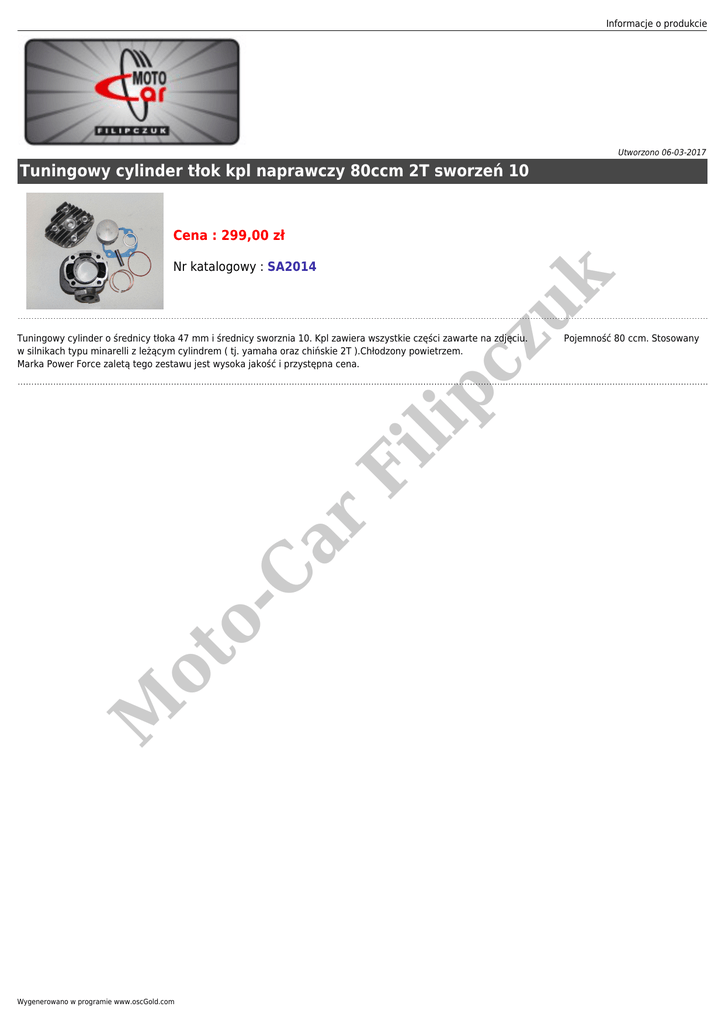 Informacje o produkcie Utworzono 06-03-2017 Tuningowy cylinder tłok kpl naprawczy 80ccm 2T sworzeń 10 Cena : 299,00 zł zu k Nr katalogowy : SA2014 M ot oC ar Fi lip c Tuningowy cylinder o średnicy tłoka 47 mm i średnicy sworznia 10. Kpl zawiera wszystkie części zawarte na zdjęciu. w silnikach typu minarelli z leżącym cylindrem ( tj. yamaha oraz chińskie 2T ).Chłodzony powietrzem. Marka Power Force zaletą tego zestawu jest wysoka jakość i przystępna cena. Wygenerowano w programie www.oscGold.com Pojemność 80 ccm. Stosowany