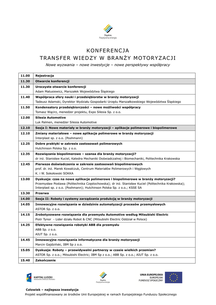 K ON FE RENC JA T RANS FE R W IE DZY W BRANŻY MO TO RYZAC J I Nowe wyzwania – nowe inwestycje – nowe perspektywy współpracy 11.00 Rejestracja 11.30 Otwarcie konferencji 11.30 Uroczyste otwarcie konferencji Adam Matusiewicz, Marszałek Województwa Śląskiego 11.40 Współpraca sfery nauki i przedsiębiorstw w branży motoryzacji Tadeusz Adamski, Dyrektor Wydziału Gospodarki Urzędu Marszałkowskiego Województwa Śląskiego 11.50 Kondensatory przedsiębiorczości – nowe możliwości współpracy Tomasz Wącirz, menedżer projektu, Expo Silesia Sp. z o.o. 12.00 Silesia Automotive Luk Palmen, menedżer Silesia Automotive 12.10 Sesja I: Nowe materiały w branży motoryzacji – aplikacje polimerowe i biopolimerowe 12.10 Zmiany materiałowe – nowe aplikacje polimerowe w branży motoryzacji Interplast sp. z o.o. (Poshmann) 12.25 Dobre praktyki w zakresie zastosowań polimerowych Hutchinson Polska Sp. z o.o. 12.35 Rozwiązania biopolimerowe – szansa dla branży motoryzacji? dr inż. Stanisław Kuciel, Katedra Mechaniki Doświadczalnej i Biomechaniki, Politechnika Krakowska 12.45 Pierwsze doświadczenia w zakresie zastosowań biopolimerowych prof. dr. inż. Marek Kowalczuk, Centrum Materiałów Polimerowych i Węglowych K. i W. Sokołowski SOKKA 13.00 Dyskusja: czas na nowe aplikacje polimerowe i biopolimerowe w branży motoryzacji? Przemysław Postawa (Politechnika Częstochowska); dr inż. Stanisław Kuciel (Politechnika Krakowska); Interplast sp. z o.o. (Poshmann); Hutchinson Polska Sp. z o.o.; KSSE SA 13.30 Przerwa 14.00 Sesja II: Roboty i systemy zarządzania produkcją w branży motoryzacji 14.05 Innowacyjne rozwiązania w dziedzinie automatyzacji procesów przemysłowych ASTOR Sp. z o.o. 14.15 Zrobotyzowane rozwiązania dla przemysłu Automotive według Mitsubishi Electric Piotr Tynor - Lider działu Robot & CNC (Mitsubishi Electric Oddział w Polsce) 14.25 Efektywne rozwiązania robotyki ABB dla przemysłu ABB Sp. z o.o. AIUT Sp. z o.o. 14.45 Innowacyjne rozwiązania informatyczne dla branży motoryzacji Marcin Gajdziński, IBM Sp z o.o. 15.05 Dyskusja: Roboty – przewidywalni partnerzy w czasie wielkich przemian? ASTOR Sp. z o.o.; Mitsubishi Electric; IBM Sp z o.o.; ABB Sp. z o.o.; AIUT Sp. z o.o. 15.40 Zakończenie Człowiek – najlepsza inwestycja Projekt współfinansowany ze środków Unii Europejskiej w ramach Europejskiego Funduszu Społecznego FO RMU LA RZ ZGŁ OS ZEN IOWY Zgłaszam swój udział w: Konferencji „TRANSFER WIEDZY W BRANŻY MOTORYZACJI” // 16.11.2011 Dane projektu Tytuł projektu: Automotive Silesia Region Numer projektu: POKL.08.02.01-24-001/11 Priorytet: VIII Regionalne kadry gospodarki Działanie: 8.2. Transfer wiedzy Poddziałanie: 8.2.1. Wsparcie dla współpracy sfery nauki i przedsiębiorstw Dane osobowe uczestnika Imię i Nazwisko: ………………………………………… Stanowisko w pracy: ………………………………………… PESEL: ……………………………………… Zatrudniony w przedsiębiorstwie: mikro małym średnim dużym innym (jakie) ……………………………………… Dane firmy Pełna nazwa: ……………………………………………………………………………………………………………………………………… Ulica: …………………………………………… Miasto, Kod: ……………………………………… Telefon: …………………………………………… Fax: ……………………………………… E-mail: …………………………………………… Strona www: ……………………………………… Typ instytucji: …………………………………………… Forma prawna: ……………………………………… Wypełniony i podpisany formularz zgłoszeniowy prosimy przesłać faksem na nr: 032 78 35 524, pocztą na adres: Wydział Gospodarki Urzędu Marszałkowskiego Województwa Śląskiego, ul. Ligonia 46, Katowice 40-037, do dnia 10 listopada 2011 r. do godz. 15.00. Udział w spotkaniu jest bezpłatny, dofinansowany ze środków Unii Europejskiej w ramach Europejskiego Funduszu Społecznego. Człowiek – najlepsza inwestycja Projekt współfinansowany ze środków Unii Europejskiej w ramach Europejskiego Funduszu Społecznego Oświadczenie uczestnika projektu o wyrażeniu zgody na przetwarzanie danych osobowych/deklaracja uczestnictwa W związku z przystąpieniem do Projektu Automotive Silesia Region, realizowanego w ramach Poddziałania 8.2.1 POKL - Wsparcie dla współpracy sfery nauki i przedsiębiorstw, wyrażam zgodę na przetwarzanie moich danych osobowych. Oświadczam, iż przyjmuję do wiadomości, że: 1. administratorem tak zebranych danych osobowych jest Minister Rozwoju Regionalnego pełniący funkcję Instytucji Zarządzającej dla Programu Operacyjnego Kapitał Ludzki: Ministerstwo Rozwoju Regionalnego, ul. Wspólna 2/4, 00-926 Warszawa, 2. moje dane osobowe będą przetwarzane wyłącznie w celu udzielenia wsparcia, realizacji projektu Automotive Silesia Region, ewaluacji, kontroli, monitoringu i sprawozdawczości w ramach Programu Operacyjnego Kapitał Ludzki, 3. moje dane osobowe mogą zostać udostępnione innym podmiotom wyłącznie w celu udzielenia wsparcia, realizacji projektu Automotive Silesia Region, ewaluacji, kontroli, monitoringu i sprawozdawczości w ramach Programu Operacyjnego Kapitał Ludzki, 4. podanie danych jest dobrowolne, aczkolwiek odmowa ich podania jest równoznaczna z brakiem możliwości udzielenia wsparcia w ramach Projektu, 5. mam prawo dostępu do treści swoich danych i ich poprawiania. ………………………… Miejscowość, data …………………………………… PODPIS UCZESTNIKA PROJEKTU Człowiek – najlepsza inwestycja Projekt współfinansowany ze środków Unii Europejskiej w ramach Europejskiego Funduszu Społecznego