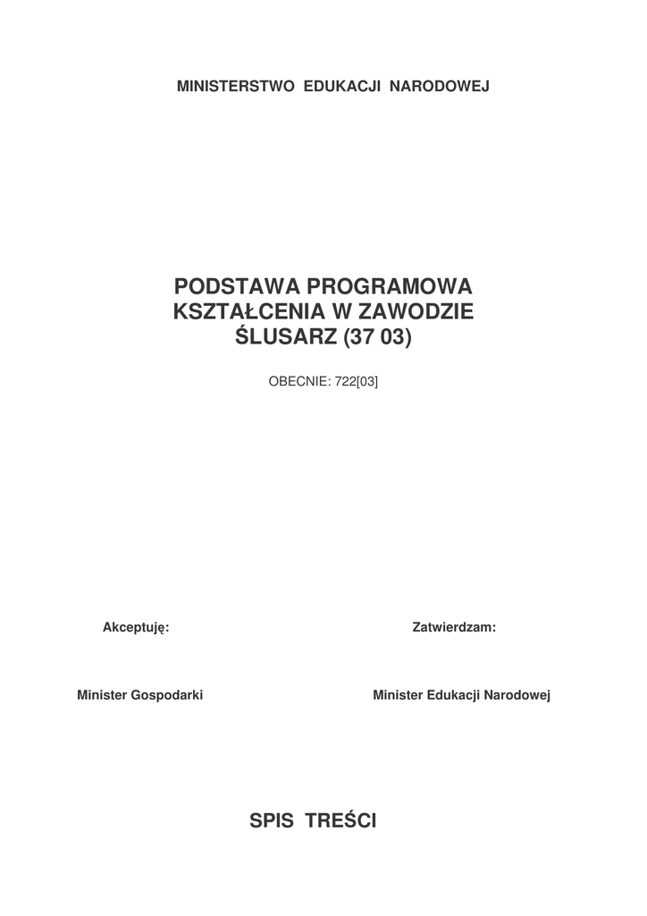 MINISTERSTWO EDUKACJI NARODOWEJ PODSTAWA PROGRAMOWA KSZTAŁCENIA W ZAWODZIE LUSARZ (37 03) OBECNIE: 722[03] Akceptuj : Minister Gospodarki Zatwierdzam: Minister Edukacji Narodowej SPIS TRE CI str. PODSTAWA PROGRAMOWA KSZTAŁCENIA W ZAWODZIE I. ZAŁO ENIA PROGRAMOWO-ORGANIZACYJNE KSZTAŁCENIA W ZAWODZIE 2 1. Opis kwalifikacji absolwenta 1.1. Umiej tno ci zawodowe, stanowi ce kwalifikacje w zawodzie 1.2. Wymagania psychofizyczne wła ciwe dla zawodu 1.3. Przeciwwskazania zdrowotne 2. Specyficzne wymagania zawodu 3. Warunki techniczne 4. Warunki kadrowe 5. Kształcenie w ró nych typach szkół i formach organizacyjnych 6. Powi zanie kształcenia zawodowego z kształceniem ogólnym 2 II. PODZIAŁ GODZIN NA BLOKI PROGRAMOWE 10 III. PODSTAWY PROGRAMOWE KSZTAŁCENIA W BLOKACH PROGRAMOWYCH 1.1. Techniczne podstawy lusarstwa 1.2. Odwzorowanie i zapis konstrukcji 1.3. Technologia lusarstwa 1.4. Przedsi biorczo i bezpiecze stwo pracy 11 11 14 16 19 1 2 3 3 4 5 7 8 9 I. ZAŁO ENIA PROGRAMOWO-ORGANIZACYJNE KSZTAŁCENIA W ZAWODZIE 1. OPIS KWALIFIKACJI ABSOLWENTA 1.1. Umiej tno ci zawodowe, stanowi ce kwalifikacje w zawodzie W wyniku realizacji kształcenia w zawodzie absolwent powinien umie : − posługiwa − − − − − − − − − − − − − − − − − − − − − si dokumentacj konstrukcyjn i technologiczn oraz normami technicznymi, czyta i interpretowa rysunki wykonawcze i zło eniowe, wykonywa szkice prostych cz ci maszyn i mechanizmów, ustala kolejno zabiegów przy wykonywaniu operacji wielozabiegowych, trasowa w zakresie wła ciwym operacjom lusarskim, rozró nia i opisywa wła ciwo ci materiałów stosowanych w lusarstwie, u ytkowa zgodnie z wymogami racjonalnej eksploatacji: obrabiarki wła ciwe operacjom lusarskim, narz dzia i przyrz dy lusarskie, wykonywa operacje obróbki lusarskiej: mechanicznej i r cznej, wykonywa proste operacje obróbki skrawaniem, obróbki plastycznej, spawania i lutowania, wykonywa operacje monta owe i demonta owe maszyn, urz dze , instalacji oraz mechanizmów, stosowa techniki pomiarowe i u ytkowa , zgodnie z przeznaczeniem sprawdziany, przyrz dy pomiarowe wła ciwe zakresowi wykonywanej pracy, przeprowadza ocen stanu technicznego i podstawowe naprawy maszyn, urz dze , przyrz dów i narz dzi. rozró nia smary, chłodziwa i oleje oraz zna zakres ich zastosowa w operacjach lusarskich, konserwowa , regulowa i naprawia sprz t powszechnego u ytku, wykorzystywa technik komputerow w praktyce warsztatowej, ocenia jako wykonywanych prac, kalkulowa koszty pracy i materiałów, stosowa wiadomie zasady bhp, ochrony p.po . oraz ochrony rodowiska, organizowa i utrzymywa w czysto ci stanowisko pracy, działa twórczo, samodzielnie podejmowa decyzje w procesie pracy oraz korzysta ze swoich praw (*), wła ciwie prezentowa swoje kwalifikacje podczas poszukiwania pracy, wyszukiwa i przetwarza informacje oraz doskonali kwalifikacje zawodowe (*). (*) - umiej tno ci o charakterze ponadzawodowym 1.2. Wymagania psychofizyczne wła ciwe dla zawodu 2 − − − − − − Zainteresowania techniczne. Wyobra nia przestrzenna. Zdolno koncentracji uwagi. Podzielno uwagi. Szybkie reagowanie na bod ce zewn trzne. Aktywno , zaradno , odpowiedzialno , krytyczno , samodzielno w działaniu. − Wytrwało i cierpliwo w realizacji powierzonych działa . − Zamiłowanie do dokładnej pracy i porz dku. − Koordynacja zmysłowo-ruchowa. niezale no , 1.3. Przeciwwskazania zdrowotne − − − − − − − − − Zaburzenia równowagi i wiadomo ci. Zaburzenia psychiczne. Sprawno fizyczna poni ej przeci tnej. Wady wzroku niepoddaj ce si korekcji. Brak widzenia obuocznego. Uszkodzenia narz du słuchu uniemo liwiaj ce kontrol słuchow pracy maszyny. Zmiany anatomiczne i czynno ciowe ograniczaj ce sprawno r k i palców. Skóra r k skłonna do uczule . ylaki ko czyn dolnych. 3 2. Specyficzne wymagania zawodu Zawód lusarz ma szerokie zastosowanie w gospodarce narodowej, głównie w usługach oraz wytwarzaniu i eksploatacji wyrobów technicznych bran y metalowej. Szeroki asortyment konstrukcji wyrobów, du a ró norodno procesów technologicznych i warunków eksploatacji wymagaj szerokoprofilowego kształcenia zawodowego w takim zakresie, aby absolwent uzyskał podbudow teoretyczn i praktyczn do: wykonywania i naprawiania narz dzi skrawaj cych do metali, przyrz dów i uchwytów obróbkowych oraz przyrz dów kontrolno-pomiarowych; wykonywania napraw elementów prostych mechanizmów i urz dze oraz typowych narz dzi u ywanych w lusarstwie, jak te wykonywania obróbki ostatecznej cz ci maszyn oraz monta u zespołów maszynowych w warunkach produkcji jednostkowej; wiadczenia usług w zakresie: − wykonywania konserwacji i napraw mechanicznego i nie mechanicznego sprz tu powszechnego u ytku; − wykonywania i naprawy ozdobnej galanterii metalowej oraz nadawania wyrobom metalowym ostatecznego, estetycznego wygl du. Szybkie przeobra enia w technice, technologii, organizacji produkcji i usługach stwarzaj obiektywn potrzeb rozwijania kształcenia w zawodach szerokoprofilowych. Przykładem takiego zawodu jest lusarz. Kształcenie w tym zawodzie zakłada opanowanie w złowych zagadnie ogólnozawodowych, na których oparte s wszystkie procesy technologiczne oraz wszechstronny rozwój podstawowych umiej tno ci intelektualnych i praktycznych daj cych dobre przygotowanie do wielokierunkowej specjalizacji. Mi dzy innymi przewiduje si nast puj ce specjalizacje w zawodzie lusarz: - urz dzenia i instalacje, - narz dzia i przyrz dy, - wyroby artystyczne. Coraz szerszy asortyment zmechanizowanego sprz tu powszechnego u ytku sprawia, e lusarz b dzie w przyszło ci szerzej zajmował si jego obsług i naprawami. Zakres prac lusarza jest rozległy i zró nicowany. Znajduje to swoje odzwierciedlenie w podstawie programowej kształcenia w zawodzie, dla której wyodr bniono podstawy programowe kształcenia w nw. blokach programowych: Techniczne podstawy lusarstwa Odwzorowanie i zapis konstrukcji Technologi