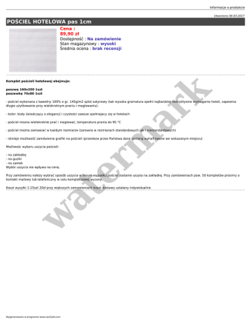 Informacje o produkcie Utworzono 06-03-2017 POŚCIEL HOTELOWA pas 1cm Cena : 89,90 zł Dostępność : Na zamówienie Stan magazynowy : wysoki Średnia ocena : brak recenzji poszwę 160x200 1szt poszewkę 70x80 1szt er m ar k Komplet pościeli hotelowej obejmuje: - pościel wykonana z bawelny 100% o gr. 145g/m2 splot satynowy (tak wysoka gramatura spełni najbardziej restryktywne wymagania hoteli, zapewnia długie użytkowanie przy wielokrotnym praniu i maglowaniu). - kolor: biały świadczący o elegancji i czystości zawsze spełniajacy się w hotelach - pościel mozna wielokrotnie prać i maglować, temperatura prania do 95 °C - pościel można zamawiać w każdym rozmiarze (zarowno w rozmiarach standardowych jak i niestandardowych) - istnieje możliwość zamówienia grafiki na pościeli (przesłane przez Państwa dane zostaną wyhaftowane we wskazanym miejscu) Możliwośc wyboru uszycia pościeli: - na zakładkę - na guziki - na zamek Wybór uszycia nie wpływa na cenę. Przy zamówieniu należy wybrać sposób uszycia w innym wypadku pościel zostanie uszyta na zakładkę. Przy zamówieniach pow. 50 kompletów prosimy o kontakt mailowy lub telefoniczny w celu kompleksowej wyceny. w at Koszt wysyłki 1-15szt 20zł przy większych zamowieniach koszt dostawy ustalany indywidualnie Wygenerowano w programie www.oscGold.com