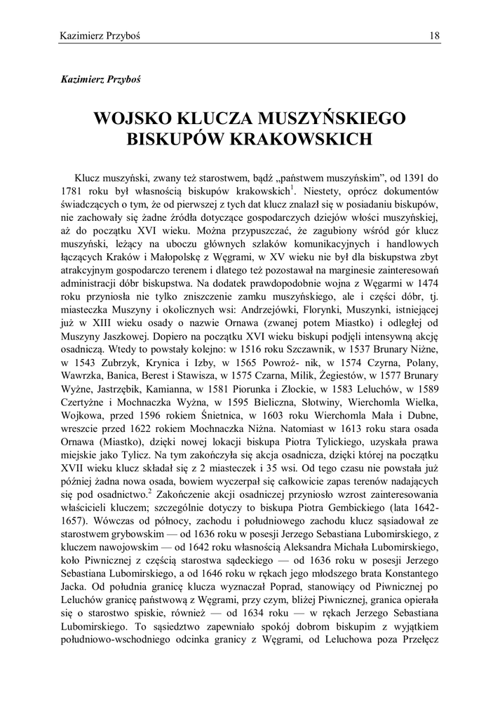 Kazimierz Przyboś 18 Kazimierz Przyboś WOJSKO KLUCZA MUSZYŃSKIEGO BISKUPÓW KRAKOWSKICH Klucz muszyński, zwany też starostwem, bądź „państwem muszyńskim”, od 1391 do 1781 roku był własnością biskupów krakowskich1. Niestety, oprócz dokumentów świadczących o tym, że od pierwszej z tych dat klucz znalazł się w posiadaniu biskupów, nie zachowały się żadne źródła dotyczące gospodarczych dziejów włości muszyńskiej, aż do początku XVI wieku. Można przypuszczać, że zagubiony wśród gór klucz muszyński, leżący na uboczu głównych szlaków komunikacyjnych i handlowych łączących Kraków i Małopolskę z Węgrami, w XV wieku nie był dla biskupstwa zbyt atrakcyjnym gospodarczo terenem i dlatego też pozostawał na marginesie zainteresowań administracji dóbr biskupstwa. Na dodatek prawdopodobnie wojna z Węgarmi w 1474 roku przyniosła nie tylko zniszczenie zamku muszyńskiego, ale i części dóbr, tj. miasteczka Muszyny i okolicznych wsi: Andrzejówki, Florynki, Muszynki, istniejącej już w XIII wieku osady o nazwie Ornawa (zwanej potem Miastko) i odległej od Muszyny Jaszkowej. Dopiero na początku XVI wieku biskupi podjęli intensywną akcję osadniczą. Wtedy to powstały kolejno: w 1516 roku Szczawnik, w 1537 Brunary Niżne, w 1543 Zubrzyk, Krynica i Izby, w 1565 Powroź- nik, w 1574 Czyrna, Polany, Wawrzka, Banica, Berest i Stawisza, w 1575 Czarna, Milik, Żegiestów, w 1577 Brunary Wyżne, Jastrzębik, Kamianna, w 1581 Piorunka i Złockie, w 1583 Leluchów, w 1589 Czertyżne i Mochnaczka Wyżna, w 1595 Bieliczna, Słotwiny, Wierchomla Wielka, Wojkowa, przed 1596 rokiem Śnietnica, w 1603 roku Wierchomla Mała i Dubne, wreszcie przed 1622 rokiem Mochnaczka Niżna. Natomiast w 1613 roku stara osada Ornawa (Miastko), dzięki nowej lokacji biskupa Piotra Tylickiego, uzyskała prawa miejskie jako Tylicz. Na tym zakończyła się akcja osadnicza, dzięki której na początku XVII wieku klucz składał się z 2 miasteczek i 35 wsi. Od tego czasu nie powstała już później żadna nowa osada, bowiem wyczerpał się całkowicie zapas terenów nadających się pod osadnictwo.2 Zakończenie akcji osadniczej przyniosło wzrost zainteresowania właścicieli kluczem; szczególnie dotyczy to biskupa Piotra Gembickiego (lata 16421657). Wówczas od północy, zachodu i południowego zachodu klucz sąsiadował ze starostwem grybowskim — od 1636 roku w posesji Jerzego Sebastiana Lubomirskiego, z kluczem nawojowskim — od 1642 roku własnością Aleksandra Michała Lubomirskiego, koło Piwnicznej z częścią starostwa sądeckiego — od 1636 roku w posesji Jerzego Sebastiana Lubomirskiego, a od 1646 roku w rękach jego młodszego brata Konstantego Jacka. Od południa granicę klucza wyznaczał Poprad, stanowiący od Piwnicznej po Leluchów granicę państwową z Węgrami, przy czym, bliżej Piwnicznej, granica opierała się o starostwo spiskie, również — od 1634 roku — w rękach Jerzego Sebastiana Lubomirskiego. To sąsiedztwo zapewniało spokój dobrom biskupim z wyjątkiem południowo-wschodniego odcinka granicy z Węgrami, od Leluchowa poza Przełęcz Wojsko klucza muszyńskiego biskupów krakowskich 19 Tylicką. Klucz rozciągał się na obszarze około 460 km kw. Według inwentarza klucza z 1668 roku3 w 35 wsiach było 824 kmieci, ponad 100 zagrodników i komorników (co, licząc po 5 osób na rodzinę, dałoby około 4500 osób). N ad to w kluczu żyło 115 sołtysów (zatem około 600 osób), w Muszynie było 107 domów (czyli jakieś 640 mieszkańców), a w Tyliczu 55 domów (nie więcej jak 330 mieszkańców) 4-. We wsiach klucza (a z wyjątkiem obu miasteczek żyła w nich wyłącznie ludność obrządku wschodniego) było 27 popostw (zatem do 150 osób z rodzinami popów). Łącznie — jednak bez mieszkańców dworu starościńskiego i plebanii muszyńskiej — daje to ponad 6000 mieszkańców. Biskup krakowski, jako właściciel klucza, sprawował na jego obszarze niepodzielną władzę administracyjną, sądową i wojskową. Zarządzający kluczem starostowie biskupi na ogół dobrze wywiązywali się ze swoich obowiązków. Kmiecie, najliczniejsza grupa ludności, siedzący na 1 łanie lub półłanku, byli obciążeni na rzecz pana znacznie słabiej niż chłopi w dobrach szlacheckich, uiszczali bowiem tylko umiarkowany czynsz roczny, dawali pewne tradycyjne daniny i odrabiali 2-3 dni pańszczyzny rocznie. Specyficzną grupą ludności byli sołtysi cieszący się sporymi przywilejami. Zamożność i względna swoboda ludności miała wpływ na jej stosunek do właściciela feudalnego oraz państwa. Mimo iż ogromna większość ludności wyznawała obrządek wschodni, nie słychać w kluczu o buntach chłopskich, jak choćby w sąsiednich starostwach — bieckim, czorsztyńskim czy nowotarskim. Natomiast bliskość granicy z Węgrami, a nade wszystko rosnąca od schyłku XVI wieku plaga, jaką byli zbójnicy, powodowała konieczność należytego przygotowania obrony kresu, m.in. poprzez odpowiednie zorganizowanie i wojskowe wyszkolenie ludności klucza. Dzięki szczegółowej ordynacji biskupa Piotra Gembickiego z 20 XI 1647 roku 5 znamy dokładnie powinności wojskowe mieszczan i chłopów w „państwie” muszyńskim. Naczelnikiem wojskowym kresu był w zastępstwie biskupa starosta muszyński, który zarządzał jednocześnie kluczem i przewodniczył jego sądowi kryminalnemu. Starosta miał dbać na miejscu o należyty poziom siły zbrojnej, przygotowanie i zaopatrzenie zamku muszyńskiego, miał śledzić wydarzenia po drugiej stronie granicy, co miesiąc zwoływać i kontrolować musztrę i ćwiczenia mieszczan oraz chłopów, a w razie potrzeby zwoływać pospolite ruszenie ludności kresu. Każdy kmieć miał posiadać na własny koszt odpowiedni rynsztunek, tj. rusznicę albo muszkiet, szablę, ładownicę, siekierkę (zatem miał być uzbrojony na wzór piechoty wybraniec- kiej), zaś komornik musiał posiadać osadzon
