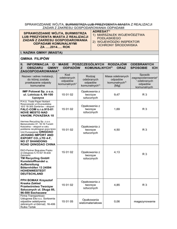SPRAWOZDANIE WÓJTA, BURMISTRZA LUB PREZYDENTA MIASTA Z REALIZACJI ZADAŃ Z ZAKRESU GOSPODAROWANIA ODPADAMI ADRESAT1) SPRAWOZDANIE WÓJTA, BURMISTRZA 1) MARSZAŁEK WOJEWÓDZTWA LUB PREZYDENTA MIASTA Z REALIZACJI PODLASKIEGO ZADAŃ Z ZAKRESU GOSPODAROWANIA 2) WOJEWÓDZKI INSPEKTOR ODPADAMI KOMUNALNYMI OCHRONY ŚRODOWISKA ZA .....2014..... ROK I. NAZWA GMINY (MIASTA) GMINA FILIPÓW II. INFORMACJA O MASIE POSZCZEGÓLNYCH RODZAJÓW Z OBSZARU GMINY ODPADÓW KOMUNALNYCH 2) ORAZ ZAGOSPODAROWANIA3) Nazwa i adres instalacji, do której zostały przekazane odpady komunalne IMP Polowat Sp. z o.o. ul. Lotnicza 4, 99-100 Łęczyca P.H.U. Trade Paper Norbert Roszczewski ul.Grunwaldzka 10/3 18-300 Zambrów – eksport FALC-COM s.r.o.915-01 NOVE MESTO NAD VAHOM, POVAZSKA 10 Hermes Recycling Sp. z o.o. Barszczówka 37, 18-16 Turośń Kościelna – eksport w celu poddania recyklingowi poza teren Unii Europejskiej ǪINGDAO Kod odebranych odpadów komunalnych4 Rodzaj odebranych odpadów komunalnych4) Masa odebranych odpadów komunalnych5) [Mg] Sposób zagospodarowania6 ) odebranych odpadów komunalnych 15 01 02 Opakowania z tworzyw sztucznych 9,47 R3 15 01 02 Opakowania z tworzyw sztucznych 1,69 R3 15 01 02 Opakowania z tworzyw sztucznych 4,50 R3 ) JICHANG IMPORT AND EXPORT CO.,LTD 4-F, NO 27 SHANDONG ROAD ǪIINGDAO CHINA EKO-Partner Bogusław Popko ul.Usługowa 5,15-521 B-stok Zaścianki 15 01 02 TM Recycling GmbH Kunststoffhandel u. Aufbereitung Bôternhôfen 13 24594 HOHENWESTEDT DEUTSCHLAND PPH BOMAX Krzysztof Kraska Zakład Przetwórstwa Tworzyw Sztucznych ul. Długa 85, 96-500 Sochaczew Firma TransportowoUsługowa Eko s.c. Sortownia odpadów selektywnie zebranych ul.Górna2, 16-406 Rutka Tartak ODEBRANYCH SPOSOBIE ICH Opakowania z tworzyw sztucznych 4,13 R3 15 01 02 Opakowania z tworzyw sztucznych 4,85 R3 15 01 05 Opakowania wielomateriałowe 0,06 magazynowanie EKO-Partner Bogusław Popko ul.Usługowa 5,15-521 B-stok Zaścianki Mondi Świecie S.A. ul. Bydgoska 1,86-100 Swiecie 15 01 05 Opakowania wielomateriałowe 15 01 07 Opakowania ze szkła 15 01 07 Opakowania ze szkła KRYNICKI RECYKLING S.A. ul. Iwaszkiewicza 48/23, 10-089 Olsztyn Huta szkła O-I Produkcja Polska S.A. ul. Morawska 1,37-500 Jarosław KRYNICKI RECYKLING S.A. ul. Iwaszkiewicza 48/23, 10-089 Olsztyn ARDAGH GLASS WYSZKÓW S.A. ul. Zakolejowa 23, 07-200 Wyszków Firma TransportowoUsługowa Eko s.c. Sortownia odpadów selektywnie zebranych ul. Górna2 16-406 Rutka Tartak Przedsiębiorstwo Wenus Sp.zo.o.ul.Kolejowa 30/3,19-400 Olecko CMC Poland Sp.zo.o ul.Piłsudskiego 82, 42-400 Zawiercie Przedsiębiorstwo Wenus Sp.zo.o.ul.Kolejowa 30/3,19-400 Olecko „UAB FEROMETA” Uźtakello g.8 Rumśśkes, Kaiśladoriu r. Stena Recycling Sp. z o.o. ul.Bakałarzewska 21,16-400 Suwałki Rhenus SE& Co.KG Grauwallring 32 27580 Bremerhaven Stena Recycling Sp. z o.o. ul.Bakałarzewska 21,16-400 Suwałki RIVA STAHL, GmbH HES WOLFGANG KUNTSCHER STR. 18 HENNIGSDORF, 16761 Hermes Sp.z .oo Recycling Barszczówka 37, 18-106 Turośń Kościelna Rhenus SE& Co.KG Grauwallring 32 27580 Bremerhaven 15 01 07 R3 19,85 R5 0,72 R5 0,20 magazynowanie 15 01 04 Opakowania z metali 1,12 R4 15 01 04 Opakowania z metali 1,72 R4 15 01 04 Opakowania z metali 0,46 R4 15 01 04 Opakowania z metali 1,85 R4 Opakowania z metali (aluminium) 0,80 R4 Opakowania z metali (aluminium) 0,10 R4 15 01 04 Stena Recycling Sp. z o.o. ul.Bakałarzewska 21,16-400 Suwałki RIVA STAHL, GmbH HES WOLFGANG KUNTSCHER STR. 18 HENNIGSDORF, 16761 Opakowania ze szkła 1,13 15 01 04 (Trans Południe Sp. z o.o. Dębica). , Cemex Polska Sp. z o.o. Cementownia Chełm ul. Fabryczna 6, 22-100 Chełm Przekazano osobom fizycznym zgodnie z rozporz. Ministra Środowiska z dn.19.12.2008 r. (Dz.U. N 235, poz.1614) 16 01 03 Zużyte opony 0,90 R1 17 01 01 Odpady z betonu oraz gruz betonowy 28,00 R5 20 01 23* Urządzenia zawierające freony 0,43 R 12 20 01 32 Leki inne niż wymienione w 20 01 31 0,014 D 10 0,92 R 12 0,49 R 12 20 01 36 Zużyte urządzenia elektryczne i elektroniczne 0,35 R 12 20 03 07 Odpady wielkogabarytowe 2,58 R 12 20 03 01 Niesegregowane (zmieszane) odpady komunalne 299,6 R 12 Stena Recycling Sp. z o.o. ul.Bakałarzewska 21,16-400 Suwałki Remondis Electrorecycling S.A.ul. Ekologiczna 2, 05-870 Błonie Magazyn odpadów medyczn. w ZOZ „OLMEDICA” w Olecku, ul.Gołdapska 1 Spalarnia odpadów medycznych EMKA S.A. ul. Jaktorowska 15A, 96300 Żyrardów EKO-MEG Grzegorz Iwaniuk ul.Papiernia 14 16-400 Suwałki EKO-MEG Grzegorz Iwaniuk ul.Papiernia 14 16-400 Suwałki Zużyte urządzenia elektryczne i elektroniczne Zużyte urządzenia elektryczne i elektroniczne 20 01 35* 20 01 36 EKO-MEG Grzegorz Iwaniuk ul.Papiernia 14 16-400 Suwałki Remondis Electrorecycling S.A.ul. Ekologiczna 2, 05-870 Błonie Przedsiębiorstwo Gospodarki Odpadami Sp. z o.o. ul.Buczka 150A, 16-400 Suwałki Przedsiębiorstwo Gospodarki Odpadami Sp. z o.o. ul.Buczka 150A, 16-400 Suwałki Masa odebranych odpadów o kodzie 20 03 015) [Mg] Masa odpadów o kodzie 20 03 01 poddanych składowaniu5) [Mg] Masa odpadów o kodzie 20 03 01 poddanych innym niż składowanie procesom przetwarzania5) [Mg] Odebranych z obszarów miejskich - - - Odebranych z obszarów wiejskich 299,6 - 299,6 Liczba punktów selektywnego zbierania odpadów komunalnych, funkcjonujących na 1 terenie gminy Nazwa i adres punktu Kod zebranych odpadów komunalnych4) 20 03 07 16 01 03 Punkt Selektywnego 20 01 23* Zbierania Odpadów 20 01 32 Komunalnych 17 01 01 w Filipowie ul. Fabryczna 12, 16-424 Filipów 20 01 35* 20 01 36 Rodzaj zebranych odpadów komunalnych4) Masa zebranych odpadów komunalnych5) [Mg] 2,58 Odpady wielkogab. 0,9 Zużyte opony Urządzenia zawierające freony Leki inne niż wymienione w 20 01 31 0,43 0,014 Odpady z betonu oraz gruz betonowy 28,0 Zużyte urządzenia elektryczne i elektroniczne 0,92 Zużyte urządzenia elektryczne i elektroniczne III. INFORMACJA O MASIE ODPADÓW KOMUNALNYCH 7) BIODEGRADACJI Łączna masa selektywnie odebranych odpadów komu