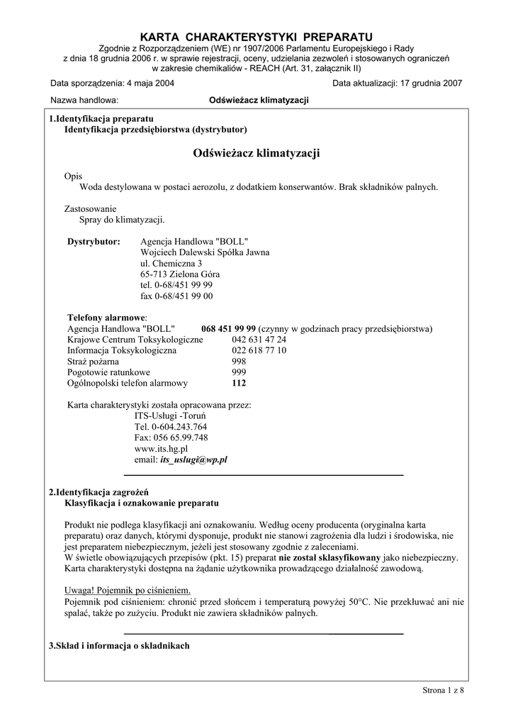 KARTA CHARAKTERYSTYKI PREPARATU Zgodnie z Rozporządzeniem (WE) nr 1907/2006 Parlamentu Europejskiego i Rady z dnia 18 grudnia 2006 r. w sprawie rejestracji, oceny, udzielania zezwoleń i stosowanych ograniczeń w zakresie chemikaliów - REACH (Art. 31, załącznik II) Data sporządzenia: 4 maja 2004 Nazwa handlowa: Data aktualizacji: 17 grudnia 2007 Odświeżacz klimatyzacji 1.Identyfikacja preparatu Identyfikacja przedsiębiorstwa (dystrybutor) Odświeżacz klimatyzacji Opis Woda destylowana w postaci aerozolu, z dodatkiem konserwantów. Brak składników palnych. Zastosowanie Spray do klimatyzacji. Dystrybutor: Agencja Handlowa "BOLL" Wojciech Dalewski Spółka Jawna ul. Chemiczna 3 65-713 Zielona Góra tel. 0-68/451 99 99 fax 0-68/451 99 00 Telefony alarmowe: Agencja Handlowa "BOLL" 068 451 99 99 (czynny w godzinach pracy przedsiębiorstwa) Krajowe Centrum Toksykologiczne 042 631 47 24 Informacja Toksykologiczna 022 618 77 10 Straż pożarna 998 Pogotowie ratunkowe 999 Ogólnopolski telefon alarmowy 112 Karta charakterystyki została opracowana przez: ITS-Usługi -Toruń Tel. 0-604.243.764 Fax: 056 65.99.748 www.its.hg.pl email: [email protected] 2.Identyfikacja zagrożeń Klasyfikacja i oznakowanie preparatu Produkt nie podlega klasyfikacji ani oznakowaniu. Według oceny producenta (oryginalna karta preparatu) oraz danych, którymi dysponuje, produkt nie stanowi zagrożenia dla ludzi i środowiska, nie jest preparatem niebezpiecznym, jeżeli jest stosowany zgodnie z zaleceniami. W świetle obowiązujących przepisów (pkt. 15) preparat nie został sklasyfikowany jako niebezpieczny. Karta charakterystyki dostępna na żądanie użytkownika prowadzącego działalność zawodową. Uwaga! Pojemnik po ciśnieniem. Pojemnik pod ciśnieniem: chronić przed słońcem i temperaturą powyżej 50°C. Nie przekłuwać ani nie spalać, także po zużyciu. Produkt nie zawiera składników palnych. 3.Skład i informacja o składnikach Strona 1 z 8 KARTA CHARAKTERYSTYKI PREPARATU Zgodnie z Rozporządzeniem (WE) nr 1907/2006 Parlamentu Europejskiego i Rady z dnia 18 grudnia 2006 r. w sprawie rejestracji, oceny, udzielania zezwoleń i stosowanych ograniczeń w zakresie chemikaliów - REACH (Art. 31, załącznik II) Data sporządzenia: 4 maja 2004 Nazwa handlowa: Data aktualizacji: 17 grudnia 2007 Odświeżacz klimatyzacji Składniki mieszaniny wraz z ich klasyfikacją Składnik nr CAS nr WE % mas. woda 7732-18-5 231-791-2 95 konserwanty -----<5 # - określenie zwrotów rodzaju zagrożenia zestawiono w punkcie 16. Symbol - Zwroty R# - 4.Pierwsza pomoc Instrukcje postępowania w zależności od drogi narażenia Ogólne: brak specjalnych wskazań. W przypadku wystąpienia jakichkolwiek wątpliwości lub niepokojących objawów skontaktować się z lekarzem. Nigdy nie podawać niczego doustnie osobom nieprzytomnym. Jeżeli poszkodowany jest nieprzytomny, do czasu przybycia lekarza ułożyć go w pozycji bezpiecznej. Wdychanie: wynieść poszkodowanego z miejsca narażenia na świeże powietrze, zapewnić spokój, okryć kocem. Jeżeli wystąpią jakiekolwiek niepokojące objawy (np. trudności w oddychaniu, kaszel, świszczący oddech, senność, zawroty głowy) wezwać lekarza. Kontakt ze skórą: preparat nie jest drażniący dla skóry. W przypadku nadmiernego lub przedłużającego się kontaktu - skórę zmyć wodą z mydłem, dokładnie spłukać. Kontakt z oczami: płukać oczy dużą ilością wody, przez przynajmniej 15 minut, trzymając powieki szeroko rozwarte. Połknięcie: jest to mało prawdopodobna droga narażenia, ponieważ preparat jest stosowany jako aerozol. Jeżeli nastąpi połknięcie, nie powodować wymiotów ponieważ istnieje ryzyko zachłyśnięcia się i przedostania się treści żołądka do płuc. Przepłukać jamę ustną dużą ilością wody, nie połykać. Wezwać lekarza i pokazać mu opakowanie lub etykietę. 5.Postępowanie w przypadku pożaru Zalecane środki gaśnicze Dostosować do pożaru otoczenia. Piana alkoholoodporna, proszki gaśnicze, dwutlenek węgla, rozproszone strumienie wody. Zbiorniki narażone na działanie wysokiej temperatury lub ognia chłodzić wodą z bezpiecznej odległości, jeżeli jest to możliwe usunąć je z miejsca zagrożenia. Pozostałości po pożarze i zanieczyszczona woda używana do gaszenia ognia, muszą być usunięte jako odpad. Zabronione środki gaśnicze Brak. Niebezpieczne produkty rozkładu Brak. Aerozole mogą eksplodować przy nagrzaniu do temperatury powyżej 50°C. Specjalistyczny sprzęt przeciwpożarowy Nakładać gazoszczelną odzież ochronną oraz aparaty oddechowe niezależne od powietrza z otoczenia. 6.Postępowanie w przypadku niezamierzonego uwolnienia do środowiska Strona 2 z 8 KARTA CHARAKTERYSTYKI PREPARATU Zgodnie z Rozporządzeniem (WE) nr 1907/2006 Parlamentu Europejskiego i Rady z dnia 18 grudnia 2006 r. w sprawie rejestracji, oceny, udzielania zezwoleń i stosowanych ograniczeń w zakresie chemikaliów - REACH (Art. 31, załącznik II) Data sporządzenia: 4 maja 2004 Nazwa handlowa: Data aktualizacji: 17 grudnia 2007 Odświeżacz klimatyzacji Indywidualne środki ostrożności Nie są konieczne specjalne zabezpieczenia. Zastosować odpowiednią wentylację pomieszczeń. Środki ostrożności w zakresie ochrony środowiska Zabezpieczyć przed wprowadzeniem preparatu do miejskiego systemu wodno-kanalizacyjnego oraz do wód powierzchniowych i gruntowych. Unikać rozprzestrzeniania się produktu, stosować np. obwałowania piaskiem. Metody oczyszczania Produkt zebrać materiałem wiążącym ciecze do oznakowanego, zamykanego pojemnika i przekazać uprawnionemu odbiorcy odpadów do dalszej utylizacji. Pomieszczenie dokładnie przewietrzyć. 7.Postępowanie z preparatem i jego magazynowanie Postępowanie z preparatem Zastosować odpowiednią wentylację ogólną pomieszczenia i miejscową przy stanowisku pracy. Podczas pracy nie jeść, nie pić i nie palić. Myć ręce przed przerwami i po zakończonej pra