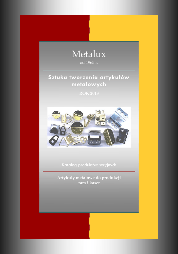 Metalux od 1965 r. Sztuka tworzenia artykułów metalowych ROK 2013 Katalog produktów seryjnych Artykuły metalowe do produkcji ram i kaset Metalux—bis O FIRMIE: Jesteśmy firmą z długimi tradycjami. Specjalizujemy się w produkcji artykułów metalowych od 1965 roku. Największym kapitałem firmy są wysokiej klasy specjaliści. Swoim długoletnim doświadczeniem zapewniają naszym klientom produkcję o nawyższej jakości. KLIENCI: Prowadzimy produkcję dla: - stałych odbiorców produkty według indywidualnych specyfikacji technicznych - odbiorców hurtowch - firm produkcyjnych i handlowych - klentów eksportowych OFERTA: W stałej ofercie posiadamy ponad 100 produktów. Od wielu lat Metalux jest liderem w produkcji elementów metalowych wykorzystywanych w ramiarstwie i produkcji kasetek. W naszej ofercie znajdziecie Państwo między innymi: okucia ram obrazowych i fotograficznych akcesoria do ram, fotoram i antyram akcesoria metalowe do kasetek drewnianych zawiasy gwoździki soczewkowe zakrętki okienne inne artykuły metalowe Zapraszamy do zapoznania się ze szczegółową ofertą Zamówienia prosimy składać: - drogą elektroniczną na adres [email protected], - faxem nr: +48 270 40 86 - telefonicznie nr: +48 270 40 86, + 48 601 512 127 (w godzinach od 7.00 do 15.00). Prawidłowe nazwy produktów Produkujemy ponad 100 wyrobów. Aby do Państwa trafiały właściwe produkty prosimy przy zamówieniu podawać symbole katalogowe. Można je sprawdzić w katalogu produktów dostępnym w zakładce "OFERTA". W przypadku pojawienia się niejasności lub braku produktu w katalogu prosimy o bezpośredni kontakt z firmą. Realizacja zamówień: Zamówione towary do godziny 11.00 wysyłamy tego samego dnia. W pozostałych przypadkach w dniu następnym. Istnieje możliwość wysyłki przez: kuriera, Pocztę Polską lub jeśli klient posiada podpisaną umowę z inną firmą kurierską po przesłaniu listu przewozowego dla określonego spedytora. Koszty przesyłki, jeśli nie uzgodniono inaczej, pokrywa odbiorca i doliczane są do faktury zakupowej dostarczonej do klienta. W przypadku braku towaru w magazynie klient po złożeniu zamówienia otrzyma informację o czasie jego realizacji. Zamówienia na produkcję. Realizujemy produkcję artykułów metalowych na indywidualne zamówienia klientów. W tym celu prosimy o bezpośredni kontakt z firmą w celu ustalenia szczegółów technicznych i możliwych terminów. Metalux-bis W9 - wieszak wciskowy Wysokość: 20 mm Szerokość: 12 mm Grubość: 0,3 mm Kolor: Oksydowany z werniksem Zamów. pod nr tel.: 12 270 40 86 Opakowanie zbiorcze: 500 szt. W4 - wieszak wciskowy Wysokość: 23 mm Szerokość: 13 mm Grubość: 0,5mm Kolor: Oksydowany z werniksem Opakowanie zbiorcze: 500 szt. W5 - wieszak wciskowy Wysokość: 23 mm Szerokość: 13 mm Grubość: 0,5mm Kolor: Oksydowany z werniksem Opakowanie zbiorcze: 500 szt. W6 - wieszak wciskowy Wysokość: 28 mm Szerokość: 27 mm Grubość: 0,5mm Średnica otworów mocujących: 6 mm Kolor: - Srebrny (ocynk ogniowy) - Oksydowany z werniksem Opakowanie zbiorcze: 500 szt. Str. 4 Metalux-bis Zamów e-mailem: [email protected] W6h - wieszak wciskowy Wysokość: 28 mm Szerokość: 27 mm Grubość: 0,5 mm Średnica otworów mocujących: 6 mm Kolor: Oksydowany z werniksem Opakowanie zbiorcze: 500 szt. W7 - wieszak wciskowy Wysokość: 28 mm Szerokość: 42 mm Grubość: 0,5mm Kolor: Srebrny (ocynk ogniowy) Opakowanie zbiorcze: 500 szt. W7W - wieszak wciskowy Wysokość: 28mm Szerokość: 142mm Grubość: 0,5mm Kolor: Srebrny (ocynk ogniowy) Opakowanie zbiorcze: 500 szt. W18 - wieszak wciskowy Wysokość: 22mm Szerokość: 33 mm Grubość: 0,5mm Kolor: Srebrny (ocynk ogniowy) Opakowanie zbiorcze: 500 szt. Str. 5 Metalux-bis W18W - wieszak wciskowy Wysokość: 22 mm Szerokość: 33 mm Grubość: 0,5 mm Kolor: Srebrny (ocynk ogniowy) Zamów. pod nr tel.: 12 270 40 86 Opakowanie zbiorcze: 500 szt. W4WT1- wieszak wciskowy Wysokość: 58 mm Szerokość: 25 mm Głębokość: 15 mm Grubość: 0,5mm Kolor: Srebrny (ocynk ogniowy) Opakowanie zbiorcze: 500 szt. W14 - wieszak wciskowy składany Wysokość: 38 mm Szerokość: 32 mm Grubość: 0,5mm Kolor: Oksydowany z werniksem Opakowanie zbiorcze: 500 szt. WWK1 - wieszak wciskowy kątowy Wysokość: 14 mm Szerokość: 25 mm Głębokość: 16 mm Grubość: 0,5mm Kolor: - Srebrny (ocynk ogniowy) Opakowanie zbiorcze: 500 szt. Str. 6 Metalux-bis Zamów e-mailem: [email protected] WP1 - wieszak płaski mały Wysokość: 40 mm Szerokość: 20 mm Grubość: 1 mm Kolor: Żółty ocynk Opakowanie zbiorcze: 500 szt. WP2 - wieszak płaski średni Wysokość: 60 mm Szerokość: 20 mm Grubość: 1 mm Kolor: Żółty ocynk Opakowanie zbiorcze: 500 szt. WP3 - wieszak płaski duży Wysokość: 80 mm Szerokość: 20 mm Grubość: 1 mm Kolor: Żółty ocynk Opakowanie zbiorcze: 500 szt. WP4 - wieszak płaski kątowy Wysokość: 85 mm Szerokość: 34/18 mm Grubość: 1 mm Kolor: Żółty ocynk Opakowanie zbiorcze: 500 szt. Str. 7 Metalux-bis W17 - wieszak wciskowy ząbkowany Wysokość: 10 mm Szerokość: 43 mm Grubość: 0,8 mm Kolor: mosiądz z werniksem Zamów. pod nr tel.: 12 270 40 86 Opakowanie zbiorcze: 500 szt. W13MG- wieszak ząbkowany mosiądzowany na gwoździe Wysokość: 8 mm Szerokość: 56 mm Grubość: 0,8 mm Kolor: mosiądz z werniksem Opakowanie zbiorcze: 500 szt. W13MW- wieszak ząbkowany mosiądzowany na wkręty Wysokość: 8 mm Szerokość: 56 mm Grubość: 0,8 mm Kolor: mosiądz z werniksem Opakowanie zbiorcze: 500 szt. WOC1 - wieszak oczkowy ocynkowany nr 1 Wysokość: 32 mm Szerokość: 16 mm Grubość: 1 mm Kolor: - Srebrny (ocynk) Opakowanie zbiorcze: 500 szt. Str. 8 Metalux-bis Opakowanie zbiorcze: 500 szt. WL2 - wieszak do luster Wysokość: 70 mm Szerokość: 70 mm Grubość: 0,6 mm Kolor: Srebrny (ocynk ogniowy) Opakowanie zbiorcze: 500 szt. WL2S - wieszak do luster samoprzylepny Wysokość: 70 mm Szerokość: 70 mm Grubość: 0,6 mm Kolor: Srebrny (ocynk ogniowy)