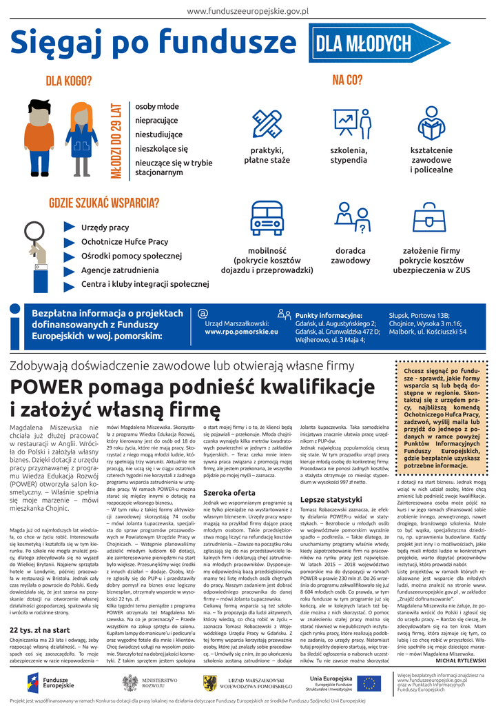 www.funduszeeuropejskie.gov.pl Sięgaj po fundusze NA CO? Młodzi do 29 lat Dla kogo? osoby młode niepracujące niestudiujące nieszkolące się nieuczące się w trybie stacjonarnym praktyki, płatne staże szkolenia, stypendia kształcenie zawodowe i policealne mobilność (pokrycie kosztów dojazdu i przeprowadzki) doradca zawodowy założenie firmy pokrycie kosztów ubezpieczenia w ZUS Gdzie szukać wsparcia? Urzędy pracy Ochotnicze Hufce Pracy Ośrodki pomocy społecznej Agencje zatrudnienia Centra i kluby integracji społecznej Bezpłatna informacja o projektach dofinansowanych z Funduszy Europejskich w woj. pomorskim: Urząd Marszałkowski: www.rpo.pomorskie.eu Punkty informacyjne: Gdańsk, ul. Augustyńskiego 2; Gdańsk, al. Grunwaldzka 472 D; Wejherowo, ul. 3 Maja 4; Słupsk, Portowa 13B; Chojnice, Wysoka 3 m.16; Malbork, ul. Kościuszki 54 Zdobywają doświadczenie zawodowe lub otwierają własne firmy POWER pomaga podnieść kwalifikacje i założyć własną firmę Magdalena Miszewska nie chciała już dłużej pracować w restauracji w Anglii. Wróciła do Polski i założyła własny biznes. Dzięki dotacji z urzędu pracy przyznawanej z programu Wiedza Edukacja Rozwój (POWER) otworzyła salon kosmetyczny. – Właśnie spełnia się moje marzenie – mówi mieszkanka Chojnic. Magda już od najmłodszych lat wiedziała, co chce w życiu robić. Interesowała się kosmetyką i kształciła się w tym kierunku. Po szkole nie mogła znaleźć pracy, dlatego zdecydowała się na wyjazd do Wielkiej Brytanii. Najpierw sprzątała hotele w Londynie, później pracowała w restauracji w Bristolu. Jednak cały czas myślała o powrocie do Polski. Kiedy dowiedziała się, że jest szansa na pozyskanie dotacji na otworzenie własnej działalności gospodarczej, spakowała się i wróciła w rodzinne strony. 22 tys. zł na start Chojniczanka ma 23 lata i odwagę, żeby rozpocząć własną działalność. – Na wyspach coś się zaoszczędziło. To moje zabezpieczenie w razie niepowodzenia – mówi Magdalena Miszewska. Skorzystała z programu Wiedza Edukacja Rozwój, który kierowany jest do osób od 18 do 29 roku życia, które nie mają pracy. Skorzystać z niego mogą młodzi ludzie, którzy spełniają trzy warunki. Aktualnie nie pracują, nie uczą się i w ciągu ostatnich czterech tygodni nie korzystali z żadnego programu wsparcia zatrudnienia w urzędzie pracy. W ramach POWER-u można starać się między innymi o dotację na rozpoczęcie własnego biznesu. – W tym roku z takiej formy aktywizacji zawodowej skorzystają 74 osoby – mówi Jolanta Łupaczewska, specjalista do spraw programów prozawodowych w Powiatowym Urzędzie Pracy w Chojnicach. – Wstępnie planowaliśmy udzielić młodym ludziom 60 dotacji, ale zainteresowanie pieniędzmi na start było większe. Przesunęliśmy więc środki z innych działań – dodaje. Osoby, które zgłosiły się do PUP-u i przedstawiły dobry pomysł na biznes oraz logiczny biznesplan, otrzymały wsparcie w wysokości 22 tys. zł. Kilka tygodni temu pieniądze z programu POWER otrzymała też Magdalena Miszewska. Na co je przeznaczy? – Przede wszystkim na zakup sprzętu do salonu. Kupiłam lampy do manicure’u i pedicure’u oraz wygodne fotele dla mnie i klientów. Chcę świadczyć usługi na wysokim poziomie. Starczyło też na dobrej jakości kosmetyki. Z takim sprzętem jestem spokojna o start mojej firmy i o to, że klienci będą się pojawiali – przekonuje. Młoda chojniczanka wynajęła kilka metrów kwadratowych powierzchni w jednym z zakładów fryzjerskich. – Teraz czeka mnie intensywna praca związana z promocją mojej firmy, ale jestem przekonana, że wszystko pójdzie po mojej myśli – zaznacza. Szeroka oferta Jednak we wspomnianym programie są nie tylko pieniądze na wystartowanie z własnym biznesem. Urzędy pracy wspomagają na przykład firmy dające pracę młodym osobom. Takie przedsiębiorstwa mogą liczyć na refundację kosztów zatrudnienia. – Zawsze na początku roku zgłaszają się do nas przedstawiciele lokalnych firm i deklarują chęć zatrudnienia młodych pracowników. Dysponujemy odpowiednią bazą przedsiębiorców, mamy też listę młodych osób chętnych do pracy. Naszym zadaniem jest dobrać odpowiedniego pracownika do danej firmy – mówi Jolanta Łupaczewska. Ciekawą formą wsparcia są też szkolenia. – To propozycja dla ludzi aktywnych, którzy wiedzą, co chcą robić w życiu – zaznacza Tomasz Robaczewski z Wojewódzkiego Urzędu Pracy w Gdańsku. Z tej formy wsparcia korzystają przeważnie osoby, które już znalazły sobie pracodawcę. – Umówiły się z nim, że po ukończeniu szkolenia zostaną zatrudnione – dodaje Jolanta Łupaczewska. Taka samodzielna inicjatywa znacznie ułatwia pracę urzędnikom z PUP-ów. Jednak największą popularnością cieszą się staże. W tym przypadku urząd pracy kieruje młodą osobę do konkretnej firmy. Pracodawca nie ponosi żadnych kosztów, a stażysta otrzymuje co miesiąc stypendium w wysokości 997 zł netto. Lepsze statystyki Tomasz Robaczewski zaznacza, że efekty działania POWER-u widać w statystykach. – Bezrobocie u młodych osób w województwie pomorskim wyraźnie spadło – podkreśla. – Także dlatego, że uruchamiamy programy właśnie wtedy, kiedy zapotrzebowanie firm na pracowników na rynku pracy jest największe. W latach 2015 – 2018 województwo pomorskie ma do dyspozycji w ramach POWER-u prawie 230 mln zł. Do 26 września do programu zakwalifikowało się już 8 604 młodych osób. Co prawda, w tym roku fundusze w tym programie już się kończą, ale w kolejnych latach też będzie można z nich skorzystać. O pomoc w znalezieniu stałej pracy można się starać również w niepublicznych instytucjach rynku pracy, które realizują podobne zadania, co urzędy pracy. Natomiast tutaj projekty dopiero startują, więc trzeba śledzić ogłoszenia o naborach uczestników. Tu nie zawsze możn