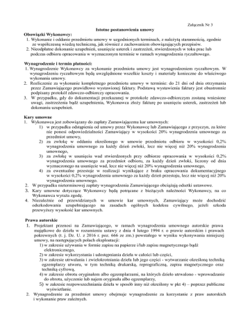 Załącznik Nr 3 Istotne postanowienia umowy Obowiązki Wykonawcy: 1. Wykonanie i oddanie przedmiotu umowy w uzgodnionych terminach, z należytą starannością, zgodnie ze współczesną wiedzą techniczną, jak również z zachowaniem obowiązujących przepisów. 2. Nieodpłatne dokonanie uzupełnień, usunięcie usterek i zastrzeżeń, stwierdzonych w toku prac lub podczas odbioru opracowania w wyznaczonym terminie w ramach wynagrodzenia ryczałtowego. Wynagrodzenie i termin płatności: 1. Wynagrodzenie Wykonawcy za wykonanie przedmiotu umowy jest wynagrodzeniem ryczałtowym. W wynagrodzeniu ryczałtowym będą uwzględnione wszelkie koszty i materiały konieczne do właściwego wykonania umowy. 2. Rozliczenie za wykonanie kompletnego przedmiotu umowy w terminie: do 21 dni od dnia otrzymania przez Zamawiającego prawidłowo wystawionej faktury. Podstawą wystawienia faktury jest obustronnie podpisany protokół zdawczo-odbiorczy opracowania. 3. W przypadku, gdy do dokumentacji przekazanej w protokole zdawczo-odbiorczym zostaną wniesione uwagi, zastrzeżenia bądź uzupełnienia, Wykonawca złoży fakturę po usunięciu usterek, zastrzeżeń lub dokonaniu uzupełnień. Kary umowne 1. Wykonawca jest zobowiązany do zapłaty Zamawiającemu kar umownych: 1) w przypadku odstąpienia od umowy przez Wykonawcę lub Zamawiającego z przyczyn, za które nie ponosi odpowiedzialności Zamawiający w wysokości 20% wynagrodzenia umownego za przedmiot umowy, 2) za zwłokę w oddaniu określonego w umowie przedmiotu odbioru w wysokości 0,2% wynagrodzenia umownego za każdy dzień zwłoki, lecz nie więcej niż 20% wynagrodzenia umownego, 3) za zwłokę w usunięciu wad stwierdzonych przy odbiorze opracowania w wysokości 0,2% wynagrodzenia umownego za przedmiot odbioru, za każdy dzień zwłoki, liczony od dnia wyznaczonego na usunięcie wad, lecz nie więcej niż 20% wynagrodzenia umownego, 4) za ewentualne przestoje w realizacji wynikające z braku opracowania dokumentacyjnego w wysokości 0,2% wynagrodzenia umownego za każdy dzień przestoju, lecz nie więcej niż 20% wynagrodzenia umownego. 2. W przypadku nieterminowej zapłaty wynagrodzenia Zamawiającego obciążają odsetki ustawowe. 3. Kary umowne dotyczące Wykonawcy będą potrącane z bieżących należności Wykonawcy, na co Wykonawca wyraża zgodę. 4. Niezależnie od przewidzianych w umowie kar umownych, Zamawiający może dochodzić odszkodowania uzupełniającego na zasadach ogólnych kodeksu cywilnego, jeżeli szkoda przewyższy wysokość kar umownych. Prawa autorskie 1. Projektant przenosi na Zamawiającego, w ramach wynagrodzenia umownego autorskie prawa majątkowe do dzieła w rozumieniu ustawy z dnia 4 lutego 1994 r. o prawie autorskim i prawach pokrewnych (t. j. Dz. U. z 2016 r. poz. 666 ze zm.) powstałego w wyniku wykonywania niniejszej umowy, na następujących polach eksploatacji: 1) w zakresie używania w formie zapisu na papierze i/lub zapisu magnetycznego bądź elektronicznego, 2) w zakresie wykorzystania i udostępniania dzieła w całości lub części, 3) w zakresie utrwalania i zwielokrotniania dzieła lub jego części - wytwarzanie określoną techniką egzemplarzy utworu, w tym techniką drukarską, reprograficzną, zapisu magnetycznego oraz techniką cyfrową, 4) w zakresie obrotu oryginałem albo egzemplarzami, na których dzieło utrwalono - wprowadzanie do obrotu, użyczenie lub najem oryginału albo egzemplarzy, 5) w zakresie rozpowszechniania dzieła w sposób inny niż określony w pkt 4) – poprzez publiczne wyświetlanie. 2. Wynagrodzenie za przedmiot umowy obejmuje wynagrodzenie za korzystanie z praw autorskich i wykonanie praw zależnych.