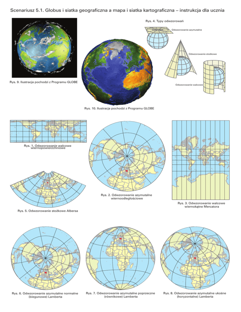 Scenariusz 5.1. Globus i siatka geograficzna a mapa i siatka kartograficzna – instrukcja dla ucznia Rys. 4. Typy odwzorowañ Odwzorowanie azymutalne Odwzorowanie sto¿kowe Rys. 9. Ilustracja pochodzi z Programu GLOBE Odwzorowanie walcowe Rys. 10. Ilustracja pochodzi z Programu GLOBE Rys. 1. Odwzorowanie walcowe wiernopowierzchniowe Rys. 2. Odwzorowanie azymutalne wiernoodleg³oœciowe Rys. 3. Odwzorowanie walcowe wiernok¹tne Mercatora Rys. 5. Odwzorowanie sto¿kowe Albersa Rys. 6. Odwzorowanie azymutalne normalne (biegunowe) Lamberta Rys. 7. Odwzorowanie azymutalne poprzeczne (równikowe) Lamberta Rys. 8. Odwzorowanie azymutalne ukoœne (horyzontalne) Lamberta