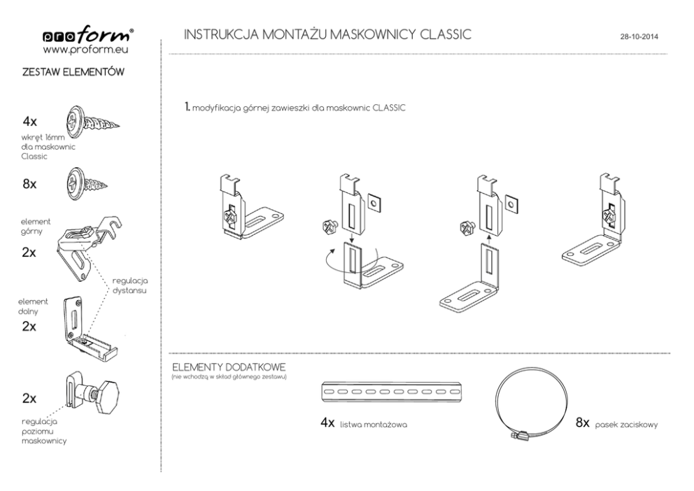 INSTRUKCJA MONTAŻU MASKOWNICY CLASSIC 28-10-2014 www.proform.eu 1. modyfikacja górnej zawieszki dla maskownic CLASSIC 4x wkręt 16mm dla maskownic Classic 8x element górny 2x regulacja dystansu element dolny 2x ELEMENTY DODATKOWE (nie wchodzą w skład głównego zestawu) 2x regulacja poziomu maskownicy 4x listwa montażowa 8x pasek zaciskowy INSTRUKCJA MONTAŻU MASKOWNICY CLASSIC NA GRZEJNIKU PANELOWYM www.proform.eu 2. Zamocuj zawieszki Do maskownic Classic zastosuj dłuższe wkręty (16mm) 4. Zawieś maskownicę na grzejniku. Zawieszki górne oraz odbojniki mają regulacje odległości. Zalecany dystans to 5 cm 3. Przyklej odbojniki 28-10-2014 INSTRUKCJA MONTAŻU MASKOWNICY CLASSIC NA GRZEJNIKU ŻELIWNYM 28-10-2014 www.proform.eu 1. Zamocuj adaptery na skrajnych żeberkach (Przed skręcaniem pasków zaciskowych można je lekko natłuścić) 2. (Do montażu można zastosować także klucz płaski 7) (Usuń wystające paski) INSTRUKCJA MONTAŻU MASKOWNICY CLASSIC NA GRZEJNIKU ŻELIWNYM 28-10-2014 www.proform.eu 3. Otwory na maskownicy przygotowane są do montażu na grzejnikach panelowych. W przypadku grzejników żeliwnych otwory należy wykonać samodzielnie. zawieszka dolna zawieszka górna Do maskownic Classic zastosuj dłuższe wkręty (16mm) 4. Zawieś maskownicę na grzejniku Zawieszki dają możliwość regulacji odległości INSTRUKCJA MONTAŻU MASKOWNICY CLASSIC NA GRZEJNIKU aluminiowym www.proform.eu 1. Modyfikacja zawieszki 2. Zamocuj zawieszki 3. Przyklej odbojniki Do maskownic Classic zastosuj dłuższe wkręty (16mm) 4. Zawieś maskownicę na grzejniku. Zawieszki oraz odbojniki mają regulacje odległości. Zalecany dystans to 5 cm 28-10-2014
