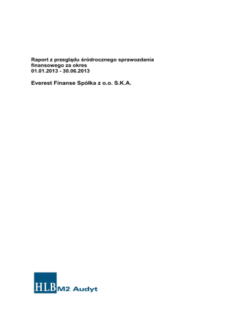 Raport z przegl du ródrocznego sprawozdania finansowego za okres 01.01.2013 - 30.06.2013 Everest Finanse Spó ka z o.o. S.K.A. Raport niezale nego bieg ego rewidenta z przegl du ródrocznego sprawozdania finansowego za okres od 1 stycznia do 30 czerwca 2013 roku Dla Akcjonariuszy i Komplementariusza Everest Finanse Spó ka z o.o. S.K.A. Przeprowadzili my przegl d za czonego ródrocznego sprawozdania finansowego Everest Finanse Spó ka z o.o. S.K.A. (Spó ka) z siedzib w Poznaniu, ul. Stary Rynek 88 (kod pocztowy: 61-772 Pozna ), obejmuj cego: ródroczny bilans sporz dzony na dzie 30 czerwca 2013 roku, który po stronie aktywów i pasywów wykazuje sum : 143 094 711,10 z otych, ródroczny rachunek zysków i strat za okres od 1 stycznia 2013 roku do 30 czerwca 2013 roku wykazuj cy zysk netto w kwocie 8 776 821,85 z otych, ródroczne zestawienie zmian w kapitale w asnym za okres od 1 stycznia 2013 roku do 30 czerwca 2013 roku, wykazuj ce zwi kszenie stanu kapita u w asnego o kwot 8 505 417,26 z otych, ródroczny rachunek przep ywów pieni nych za okres od 1 stycznia 2013 roku do 30 czerwca 2013 roku, wykazuj ce zmniejszenie stanu rodków pieni nych o kwot 575 959,48 z otych, dodatkowe informacje i obja nienia. Za sporz dzenie zgodnego z obowi zuj cymi przepisami tego ródrocznego sprawozdania finansowego odpowiedzialny jest Kierownik Jednostki. Naszym zadaniem by o przeprowadzenie przegl du tego sprawozdania. Przegl d przeprowadzili my stosownie do postanowie ustawy z dnia 29 wrze nia 1994 r. o rachunkowo ci (tekst jednolity: Dz. U. z 2013 r., poz. 330) oraz krajowych standardów rewizji finansowej, wydanych przez Krajow Rad Bieg ych Rewidentów. Standardy nak adaj na nas obowi zek zaplanowania i przeprowadzenia przegl du w taki sposób, aby uzyska umiarkowan pewno , e sprawozdanie finansowe nie zawiera istotnych nieprawid owo ci. HLB M2 Audyt Spó ka z ograniczon odpowiedzialno ci Sp. k. ul. Rakowiecka 41/27, 02-521 Warszawa, www.hlbm2.pl d Rejonowy dla M. St. Warszawy, XIII Wydzia Gospodarczy; KRS: 0000380052 REGON: 142839770, NIP: 521-359-69-82, Komplementariusz: HLB M2 Audyt Sp. z o.o. Podmiot uprawniony do badania sprawozda finansowych - numer 3697 Zarz d Komplementariusza: Maciej Czapiewski – Prezes Zarz du, Marek Dobek – Wiceprezes Zarz du, S awomir Wodarski – Cz onek Zarz du Strona 1 z 3 Przegl d przeprowadzili my g ównie drog analizy danych sprawozdania finansowego, wgl du w ksi gi rachunkowe, a tak e wykorzystania informacji uzyskanych od kierownictwa oraz osób odpowiedzialnych za finanse i rachunkowo jednostki. Zakres i metoda przegl du ródrocznego sprawozdania finansowego istotnie ró ni si od bada le cych u podstaw opinii wyra anej o zgodno ci z wymagaj cymi zastosowania zasadami (polityk ) rachunkowo ci rocznego sprawozdania finansowego oraz o jego rzetelno ci i jasno ci, dlatego nie mo emy wyda takiej opinii o za czonym ródrocznym sprawozdaniu finansowym. Na podstawie przeprowadzonego przegl du nie zidentyfikowali my niczego, co nie pozwoli oby na stwierdzenie, e sprawozdanie finansowe jest zgodne z wymagaj cymi zastosowania zasadami rachunkowo ci oraz e rzetelnie i jasno przedstawia, we wszystkich istotnych aspektach, sytuacj maj tkow i finansow Spó ki na dzie na dzie 30 czerwca 2013 roku oraz jej wynik finansowy za okres od 1 stycznia 2013 roku do 30 czerwca 2013 roku, zgodnie z zasadami rachunkowo ci okre lonymi w powo anej wy ej ustawie i wydanymi na jej podstawie przepisami. Nie zg aszaj c zastrze do prawid owo ci i rzetelno ci przegl danego sprawozdania finansowego, zwracamy uwag na nast puj ce kwestie: Kierownik Jednostki w ust pie 4 dodatkowych informacji i obja nie wskaza na ryzyko i ewentualne konsekwencje zwi zane z zamieszczeniem danych Spó ki na stronie Urz du Komisji Nadzoru Finansowego, w zak adce Ostrze enia publiczne pod komunikatem: „Papiery warto ciowe wymienionych spó ek nie zosta y obj te zatwierdzonym przez KNF prospektem emisyjnym”, w konsekwencji zamieszczenia w prasie artyku u dotycz cego planowanej emisji obligacji. Zdaniem Kierownika Jednostki oferowanie obligacji nast pi o wy cznie w trybie oferty prywatnej, natomiast zamieszczone artyku y pe ni y funkcje og osze reklamowych Spó ki i nie stanowi y oferty publicznej w rozumieniu art. 3 ust. 3 Ustawy z dnia 29 lipca 2005 roku o ofercie publicznej i warunkach wprowadzenia instrumentów finansowych do zorganizowanego systemu obrotu oraz o spó kach publicznych. Kierownik Jednostki w ust pie 4 dodatkowych informacji i obja nie poinformowa , e dnia 21 czerwca 2013 roku Urz d Kontroli Konkurencji i Konsumentów wyda postanowienie o wszcz ciu post powania przeciwko Spó ce w sprawie stosowania praktyk naruszaj cych zbiorowe interesy konsumentów. Do dnia wydania raportu z przegl du ródrocznego sprawozdania finansowego post powanie nie zosta o zako czone. Kierownik Jednostki uwa a, e post powanie nie powinno zako czy si dla Spó ki negatywnymi konsekwencjami, gdy stanowisko zajmowane przez Spó w zakresie kluczowych kwestii podniesionych przez Urz d Kontroli Konkurencji i Konsumentów jest zgodne z pogl dem wyra anym przez Urz d Komisji Dotyczy: Everest Finanse Spó ka z o.o. S.K.A. Strona 2 z 3 Nadzoru Finansowego i by o ono potwierdzane poprzez pozytywn weryfikacj podczas kontroli Urz du Ochrony Konkurencji i Konsumentów w latach ubieg ych. Zgodnie z przyj polityk rachunkowo ci, w sporz dzonym przez Kierownika Jednostki bilansie Spó ki, aktywa finansowe z tytu u udzielonych po yczek pozosta ym jednostkom oraz rozliczenia mi dzyokresowe pasywne wykazano w kwocie powi kszonej o nale ne op aty z tytu u odsetek, obs ugi w domu oraz zawartych ugód, dla których termin p atno ci przypada po dniu bilansowym. czna kwota tych op at wynios a 49 663 066,67 z otych na 30 czerwca 2013 roku oraz 49 951 848,83 z otych na 31 grudnia 2012 roku. W przypadku uj cia kwoty rozlicze mi dzyokresowych pasywnych z powy szych tytu ów jako pomniejszenia kwoty aktywów finansowych, suma bilansowa Spó ki by a