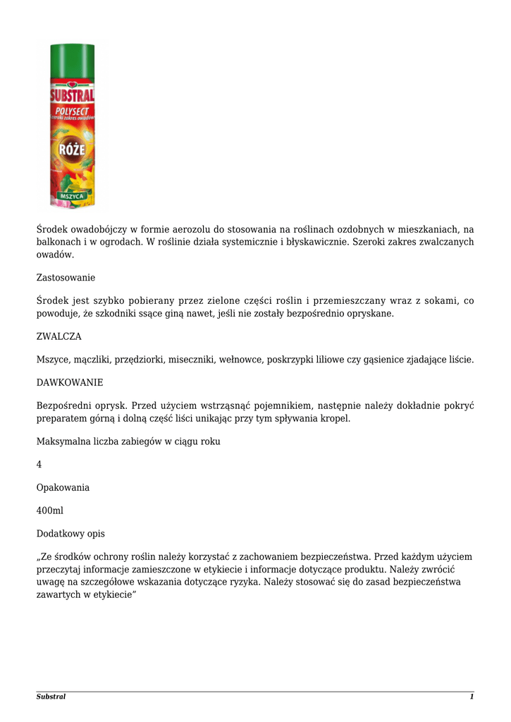 Środek owadobójczy w formie aerozolu do stosowania na roślinach ozdobnych w mieszkaniach, na balkonach i w ogrodach. W roślinie działa systemicznie i błyskawicznie. Szeroki zakres zwalczanych owadów. Zastosowanie Środek jest szybko pobierany przez zielone części roślin i przemieszczany wraz z sokami, co powoduje, że szkodniki ssące giną nawet, jeśli nie zostały bezpośrednio opryskane. ZWALCZA Mszyce, mączliki, przędziorki, miseczniki, wełnowce, poskrzypki liliowe czy gąsienice zjadające liście. DAWKOWANIE Bezpośredni oprysk. Przed użyciem wstrząsnąć pojemnikiem, następnie należy dokładnie pokryć preparatem górną i dolną część liści unikając przy tym spływania kropel. Maksymalna liczba zabiegów w ciągu roku 4 Opakowania 400ml Dodatkowy opis „Ze środków ochrony roślin należy korzystać z zachowaniem bezpieczeństwa. Przed każdym użyciem przeczytaj informacje zamieszczone w etykiecie i informacje dotyczące produktu. Należy zwrócić uwagę na szczegółowe wskazania dotyczące ryzyka. Należy stosować się do zasad bezpieczeństwa zawartych w etykiecie” Substral 1