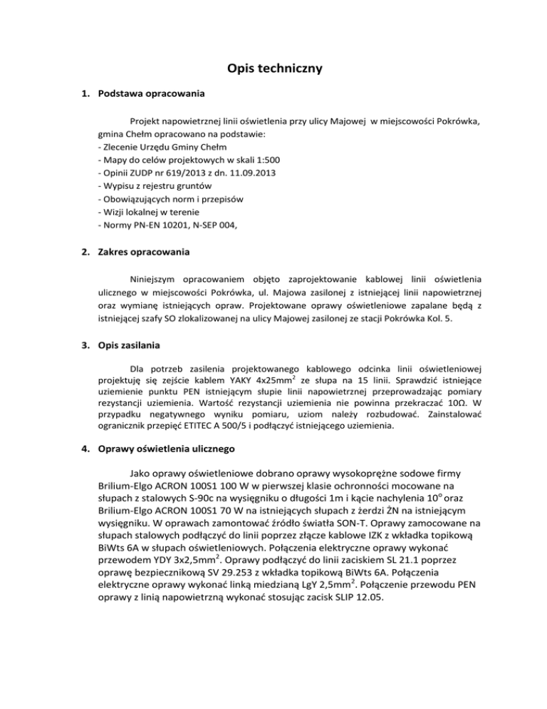 Opis techniczny 1. Podstawa opracowania Projekt napowietrznej linii oświetlenia przy ulicy Majowej w miejscowości Pokrówka, gmina Chełm opracowano na podstawie: - Zlecenie Urzędu Gminy Chełm - Mapy do celów projektowych w skali 1:500 - Opinii ZUDP nr 619/2013 z dn. 11.09.2013 - Wypisu z rejestru gruntów - Obowiązujących norm i przepisów - Wizji lokalnej w terenie - Normy PN-EN 10201, N-SEP 004, 2. Zakres opracowania Niniejszym opracowaniem objęto zaprojektowanie kablowej linii oświetlenia ulicznego w miejscowości Pokrówka, ul. Majowa zasilonej z istniejącej linii napowietrznej oraz wymianę istniejących opraw. Projektowane oprawy oświetleniowe zapalane będą z istniejącej szafy SO zlokalizowanej na ulicy Majowej zasilonej ze stacji Pokrówka Kol. 5. 3. Opis zasilania Dla potrzeb zasilenia projektowanego kablowego odcinka linii oświetleniowej projektuję się zejście kablem YAKY 4x25mm2 ze słupa na 15 linii. Sprawdzić istniejące uziemienie punktu PEN istniejącym słupie linii napowietrznej przeprowadzając pomiary rezystancji uziemienia. Wartość rezystancji uziemienia nie powinna przekraczać 10Ω. W przypadku negatywnego wyniku pomiaru, uziom należy rozbudować. Zainstalować ogranicznik przepięć ETITEC A 500/5 i podłączyć istniejącego uziemienia. 4. Oprawy oświetlenia ulicznego Jako oprawy oświetleniowe dobrano oprawy wysokoprężne sodowe firmy Brilium-Elgo ACRON 100S1 100 W w pierwszej klasie ochronności mocowane na słupach z stalowych S-90c na wysięgniku o długości 1m i kącie nachylenia 10o oraz Brilium-Elgo ACRON 100S1 70 W na istniejących słupach z żerdzi ŻN na istniejącym wysięgniku. W oprawach zamontować źródło światła SON-T. Oprawy zamocowane na słupach stalowych podłączyć do linii poprzez złącze kablowe IZK z wkładka topikową BiWts 6A w słupach oświetleniowych. Połączenia elektryczne oprawy wykonać przewodem YDY 3x2,5mm2. Oprawy podłączyć do linii zaciskiem SL 21.1 poprzez oprawę bezpiecznikową SV 29.253 z wkładka topikową BiWts 6A. Połączenia elektryczne oprawy wykonać linką miedzianą LgY 2,5mm2. Połączenie przewodu PEN oprawy z linią napowietrzną wykonać stosując zacisk SLIP 12.05. 5. Projektowana linia kablowa oświetlenia ulicznego Projektuje się linię kablowa oświetlenia ulicznego jako dwa obwody kablem 4x25mm2 o długości L- 176/209m. Linie kablową oświetlenia ulicznego budować zgodnie z norma N-SEP-004. 6. Ochrona przeciwporażeniowa Jako system ochrony od porażeń przyjęto samoczynne wyłączenie napięcia w układzie sieciowym TN-C. Zgodnie z obowiązującymi przepisami, zaprojektowano wykonanie uziemiania punktu PEN na słupie S-4. Na całej długości trasy obwodów ułożyć bednarkę ocynkowaną słupy oświetleniowe podłączyć do bednarki. Oprawy oświetlenia ulicznego zaprojektowano w pierwszej klasie ochronności. Rezystancja uziemienia dla bednarki ułożonej w wykopie oraz uziemienia słupa 15 nie może przekraczać wartości 10Ω z uwagi na zainstalowane ograniczniki przepięć. 7. Uwagi końcowe - W przypadku pracy przy czynnych urządzeniach elektroenergetycznych ( linia nN) powiadomić RE Chełm i zachować szczególną ostrożność - Przy prowadzeniu prac uwzględnić uwagi zawarte w uzgodnieniach - Trasa projektowanej linii oświetlenia ulicznego powinna być wytyczona a po wykonaniu prac zinwentaryzowana przez uprawionego geodetę. - Całość prac wykonać zgodnie z obowiązującymi normami i przepisami - Szczególną uwagę należy zwrócić przy wykonywaniu ochrony przeciwporażeniowej. - Wszystkie stosowane materiały i aparaty elektroenergetyczne powinny posiadać odpowiednie atesty lub certyfikaty. 8. Informacja dotycząca Bezpieczeństwa i Ochrony Zdrowia Podstawa opracowania - art. 20 ust. 1 pkt.1b oraz art. 21a ustawy z dnia 7.07.1994 Prawo Budowlane (Dz. U. Nr 156 poz. 1118 z 2006r z późniejszymi zmianami) - rozporządzenie ministra infrastruktury z dnia 23.06.2003r w sprawie informacji dotyczącej bezpieczeństwa i ochrony zdrowia oraz planu bezpieczeństwa i ochrony zdrowia. Zakres robót i kolejność realizacji - Budowa linii kablowej oświetlenia ulicznego - Wprowadzenie kabli do szafo oświetleniowej SO - Układanie kabla w wykopie - Posadowienie słupów, wprowadzanie kabli do słupów. Wykaz istniejących obiektów budowlanych - Linia kablowa 0,4kV zasilana ze stacji „Pokrówka Kol. 5” - Drogi /ulice/ , wjazd do nieruchomości - Istniejące budynki - Linie telefoniczne - Sieć wodociągowa - Sieć kanalizacyjna Elementy mogące stwarzać zagrożenie - Linia kablowa 0,4kV zasilana ze stacji „Pokrówka Kol. 5” - Drogi /ulice, wjazd do nieruchomości - Sieć wodociągowa Przewidywane zagrożenia - W trakcie wykonywanych robót związanych z budową linii kablowej oświetlenia ulicznego istnieje zagrożenie potrącenia pracownika przez pojazdy - Zagrożenie porażenia prądem elektrycznym w trakcie prowadzenia prac związanych z podłączeniem kabli elektroenergetycznych oraz w trakcie wykonywania pomiarów elektrycznych Instruktaż pracowników - Na podstawie niniejszej informacji kierownik budowy powinien bezpośrednio na placu budowy przed przystąpieniem do realizacji robót przeprowadzić ustny instruktaż zespołu pracowników. Pracownicy zatrudnieni na budowie powinni być wyposażeni w środki ochrony indywidualnej oraz odzież i obuwie robocze które powinny zapewniać wystarczającą ochronę przed możliwymi zagrożeniami w postaci uszkodzenia głowy, twarzy, słuchu, wzroku. Pozostałe środki techniczne i organizacyjne: - Zatrudnić pracowników o odpowiednich kwalifikacjach - Prace przy urządzeniach elektroenergetycznych wykonać z zastosowaniem metod pracy zgodnych z instrukcją organizacji bezpiecznej pracy w energetyce po uprzednim zgłoszeniu w rejonowej dyspozycji mocy RE Chełm. - W celu uniknięcia zagrożenia teren budowy należy zabezpieczyć i wygrodzić taśmą w kolorze białoczerwonym zawieszoną na wysoko