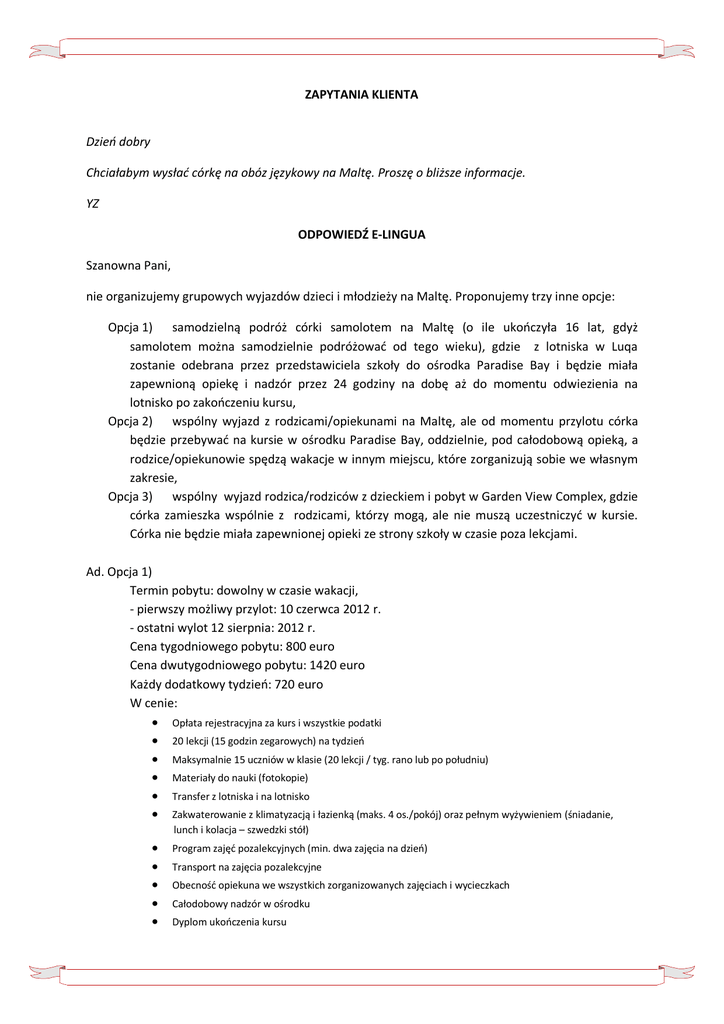 ZAPYTANIA KLIENTA Dzień dobry Chciałabym wysłać córkę na obóz językowy na Maltę. Proszę o bliższe informacje. YZ ODPOWIEDŹ E-LINGUA Szanowna Pani, nie organizujemy grupowych wyjazdów dzieci i młodzieży na Maltę. Proponujemy trzy inne opcje: Opcja 1) samodzielną podróż córki samolotem na Maltę (o ile ukończyła 16 lat, gdyż samolotem można samodzielnie podróżować od tego wieku), gdzie z lotniska w Luqa zostanie odebrana przez przedstawiciela szkoły do ośrodka Paradise Bay i będzie miała zapewnioną opiekę i nadzór przez 24 godziny na dobę aż do momentu odwiezienia na lotnisko po zakończeniu kursu, Opcja 2) wspólny wyjazd z rodzicami/opiekunami na Maltę, ale od momentu przylotu córka będzie przebywać na kursie w ośrodku Paradise Bay, oddzielnie, pod całodobową opieką, a rodzice/opiekunowie spędzą wakacje w innym miejscu, które zorganizują sobie we własnym zakresie, Opcja 3) wspólny wyjazd rodzica/rodziców z dzieckiem i pobyt w Garden View Complex, gdzie córka zamieszka wspólnie z rodzicami, którzy mogą, ale nie muszą uczestniczyć w kursie. Córka nie będzie miała zapewnionej opieki ze strony szkoły w czasie poza lekcjami. Ad. Opcja 1) Termin pobytu: dowolny w czasie wakacji, - pierwszy możliwy przylot: 10 czerwca 2012 r. - ostatni wylot 12 sierpnia: 2012 r. Cena tygodniowego pobytu: 800 euro Cena dwutygodniowego pobytu: 1420 euro Każdy dodatkowy tydzień: 720 euro W cenie: Opłata rejestracyjna za kurs i wszystkie podatki 20 lekcji (15 godzin zegarowych) na tydzień Maksymalnie 15 uczniów w klasie (20 lekcji / tyg. rano lub po południu) Materiały do nauki (fotokopie) Transfer z lotniska i na lotnisko Zakwaterowanie z klimatyzacją i łazienką (maks. 4 os./pokój) oraz pełnym wyżywieniem (śniadanie, lunch i kolacja – szwedzki stół) Program zajęć pozalekcyjnych (min. dwa zajęcia na dzień) Transport na zajęcia pozalekcyjne Obecność opiekuna we wszystkich zorganizowanych zajęciach i wycieczkach Całodobowy nadzór w ośrodku Dyplom ukończenia kursu Karta SIM, podręcznik uczestnika kursu oraz mapa Możliwość korzystania z wyposażenia obiektu W ośrodku: prywatna piaszczysta plaża, 2 korty tenisowe, 3 baseny odkryte, 1 basen kryty, plac zabaw, salon gier, kafejka internetowa, 1 boisko sportowe ze sztuczna nawierzchnia, centrum nurkowe, sejf (w recepcji). Więcej informacji: http://www.angielskinamalcie.pl/materialy/pakiet-dla-nastolatkow.pdf Zdjęcia ośrodka Paradise Bay: http://www.angielskinamalcie.pl/materialy/pakiet-dla-nastolatkow-zdjecia.pdf Jeśli chodzi o nauczenie się języka, opcja ta jest najkorzystniejsza, gdyż dziecko przebywa przez cały czas albo z rodzimymi użytkownikami angielskiego, albo z dziećmi różnych narodowości z całego świata, które komunikują się ze sobą po angielsku. Do tego dochodzi opłata za przelot, który należy zarezerwować samodzielnie: http://www.angielskinamalcie.pl/?przelot,16 Im wcześniej zakupi się bilet, tym jego cena będzie niższa. Ad. Opcja 2) Jeśli chodzi o pobyt dziecka w Paradise Bay, sytuacja przedstawia się podobnie jak opisano powyżej, natomiast rodzice/opiekunowie będą mogli albo uczestniczyć w kursie dla dorosłych w Garden View Complex , albo zorganizować sobie pobyt we własnym zakresie w dowolnym miejscu bez nauki angielskiego. Do tego dochodzi opłata za przelot, który należy zarezerwować samodzielnie: http://www.angielskinamalcie.pl/?przelot,16 Ad. Opcja 3) Cała rodzina zamieszkuje w apartamencie w Garden View Complex, gdzie dziecko ma opiekę tylko podczas zajęć (wyłączając przerwę), a rodzice mogą, ale nie muszą uczestniczyć w kursie. Szkoła zapewnia transfer lotniskowy dla całej rodziny z lotniska i na lotnisko maltańskie. Dwutygodniowy pobyt 3-osobowej rodziny w apartamencie 3-osobowym z pokojem (1080 euro), wyposażoną kuchnią i łazienką, wraz z kursem dziecka (440 euro) , gdy rodzice nie korzystają z kursu, oraz transferem z lotniska i na lotnisko (50 euro) wynosi: 1570 euro. Gdyby przynajmniej jeden rodzic również brał udział w kursie, cena za zakwaterowanie byłaby o 200 euro niższa na dwa tygodnie (880 euro). Byłby to wówczas wyjazd w ramach pakietu „Rodzice z dziećmi”: http://www.angielskinamalcie.pl/materialy/clubclass-pakiet-dla-rodzin.pdf Termin: pierwszy przyjazd 10 czerwca 2012 r., ostatni wyjazd 19 sierpnia 2012 r. Apartament mieści się w tym samym budynku, w którym znajduje się szkoła. W ośrodku jest również siłownia, sauna, jacuzzi, baseny, pub, restauracja, naprzeciwko szkoły przystanek autobusowy, do plaży 15 minut spacerem. Do tego dochodzi opłata za przelot, który należy zarezerwować samodzielnie: http://www.angielskinamalcie.pl/?przelot,16 UBEZPIECZENIE Na czas pobytu Szkoła Clubclass zaleca posiadanie ubezpieczenia. Dotyczy to wszystkich trzech opcji wyjazdu. Osoby pracujące lub którym opłacane są składki ZUS mogą wystąpić o darmową kartę EKUZ w najbliższym oddziale NFZ, ważną przez okres 6 miesięcy. Karta taka wystawiana jest na miejscu. Wystarczy mieć ze sobą dowód osobisty (legitymację szkolną dziecka) i ostatnie RMUA – dowód opłacania składek ZUS. PROCEDURA REZERWACJI Aby zarezerwować kurs, należy wypełnić formularz na stronie: http://www.angielskinamalcie.pl/?rezerwacja-online,23 W ciągu maksimum dwóch dni roboczych prześlemy wiadomość na maila, czy są dostępne miejsca w wybranym terminie i rodzaju zakwaterowania oraz fakturę proforma wraz z numerem konta szkoły Clubclass. Wówczas w ciągu 3 dni roboczych od otrzymania odpowiedzi i nie później niż dwa tygodnie przed przylotem należy wpłacić na podane w mailu konto szkoły Clubclass 25% zaliczki, czyli w przypadku wybrania Opcji 1 byłoby to 355 euro. Bezpośrednio przed wpłatą pieniędzy proszę upewnić się, czy wciąż są dostępne miejsca w wybranym rodzaju zakwaterowania, gdyż zwłaszcza w okresie wakacyjnym oferta szkoły Clubclass cieszy się najwi