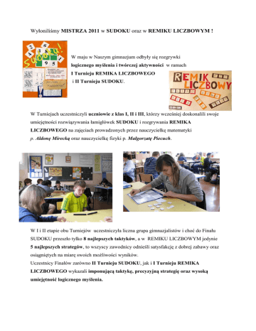 Wyłoniliśmy MISTRZA 2011 w SUDOKU oraz w REMIKU LICZBOWYM ! W maju w Naszym gimnazjum odbyły się rozgrywki logicznego myślenia i twórczej aktywności w ramach I Turnieju REMIKA LICZBOWEGO i II Turnieju SUDOKU. W Turniejach uczestniczyli uczniowie z klas I, II i III, którzy wcześniej doskonalili swoje umiejętności rozwiązywania łamigłówek SUDOKU i rozgrywania REMIKA LICZBOWEGO na zajęciach prowadzonych przez nauczycielkę matematyki p. Aldonę Mirecką oraz nauczycielkę fizyki p. Małgorzatę Piecuch. W I i II etapie obu Turniejów uczestniczyła liczna grupa gimnazjalistów i choć do Finału SUDOKU przeszło tylko 8 najlepszych taktyków, a w REMIKU LICZBOWYM jedynie 5 najlepszych strategów, to wszyscy zawodnicy odnieśli satysfakcję z dobrej zabawy oraz osiągniętych na miarę swoich możliwości wyników. Uczestnicy Finałów zarówno II Turnieju SUDOKU, jak i I Turnieju REMIKA LICZBOWEGO wykazali imponującą taktykę, precyzyjną strategię oraz wysoką umiejętność logicznego myślenia. Mistrzami 2011 w SUDOKU zostali: Mateusz Krawczyk I miejsce, Krystian Rudnik II miejsce, Ilona Masłowska III miejsce. Mistrzami 2011 w REMIKU LICZBOWYM zostali: Adam Janus I miejsce, Michał Pająk II miejsce, Martyna Derlatka III miejsce. Gratulujemy zwycięstwa !!! Wszystkich zainteresowanych serdecznie zapraszamy !!! na zajęcia SUDOKU i REMIKA LICZBOWEGO w nowym roku szkolnym na III GIMNAZJALNY TURNIEJU SUDOKU oraz na II GIMNAZJALNY TURNIEJ RAMIKA LICZBOWEGO - 2012 Organizatorki GIMNAZJALNEGO TURNIEJU SUDOKU i REMIKA LICZBOWEGO Aldona Mirecka i Małgorzata Piecuch
