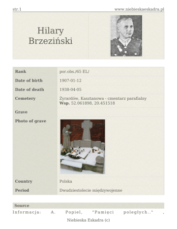 str.1 www.niebieskaeskadra.pl Hilary Brzeziński Rank por.obs./65 EL/ Date of birth 1907-01-12 Date of death 1938-04-05 Cemetery Żyrardów, Kasztanowa - cmentarz parafialny Wsp. 52.061898, 20.451518 Grave Photo of grave Country Polska Period Dwudziestolecie międzywojenne Source Informacja: A. Popiel, "Pamięci Niebieska Eskadra (c) poległych.." , str.2 www.mbpocieszenia.zyrardow.pl Zdjęcie i biogram: A. Popiel, "Pamięci poległych.." Zdjęcia grobu: Mariusz Skroński www.niebieskaeskadra.pl Brzeziński Hilary (12.1.1907-8.4.1938) porucznik obserwator Urodził się 12 stycznia 1907 roku w Rudzie Guzowskiej, powiat Błonie, z ojca Jana i matki Heleny z Wrzodaków. Po ukończeniu szkoły powszechnej w Skierniewicach dalszą naukę kontynuował w gimnazjum w Łomży. W roku 1927 wstępuje jako ochotnik do 1 Batalionu Balonowego w Toruniu, w którym kończy szkołę podoficerską i uzyskuje stopień kaprala. W trakcie pełnienia służby uzupełnia swoje wykształcenie i w roku 1931, już jako podoficer zawodowy, zostaje odkomenderowany do Szkoły Podchorążych dla Podoficerów w Bydgoszczy. W dniu 15 sierpnia 1934 roku kończy szkołę i w stopniu podporucznika zostaje przydzielony do Centrum Wyszkolenia Podoficerów Lotnictwa w Bydgoszczy jako instruktor. Po dwuletniej służbie w CWPL zostaje skierowany do Centrum Wyszkolenia Oficerów Lotnictwa w Dęblinie, kończy kurs obserwatorski i przeniesiony do 6 Pułku Lotniczego we Lwowie pełni funkcję obserwatora w 65 Eskadrze Liniowej. Mianowany porucznikiem w dniu 19 marca 1938 roku, w niecałe trzy tygodnie, bo już 8 kwietnia 1938 roku, ginie śmiercią lotnika w wypadku pod miejscowością Szczytna koło Jarosławia, na skutek zgskoczenia przez zamieć na samolocie PZL-23B. Pochowany początkowo w Skierniewicach, został przeniesiony po wojnie do Żyrardowa, gdzie spoczywa w grobowcu rodzinnym na miejscowym cmentarzu, rząd 8, po lewej stronie od głównej alei. Niebieska Eskadra (c)