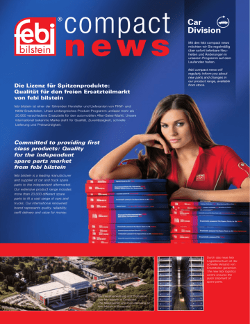 compact news Die Lizenz für Spitzenprodukte: Qualität für den freien Ersatzteilmarkt von febi bilstein Mit den febi compact news möchten wir Sie regelmäßig über sofort lieferbare Neuheiten und Änderungen in unserem Programm auf dem Laufenden halten. febi compact news will regularly inform you about new parts and changes in our product range, available from stock. febi bilstein ist einer der führenden Hersteller und Lieferanten von PKW- und NKW-Ersatzteilen. Unser umfangreiches Produkt-Programm umfasst mehr als 20.000 verschiedene Ersatzteile für den automobilen After-Sales-Markt. Unsere international bekannte Marke steht für Qualität, Zuverlässigkeit, schnelle Lieferung und Preiswürdigkeit. Committed to providing first class products: Quality for the independent spare parts market from febi bilstein febi bilstein is a leading manufacturer and supplier of car and truck spare parts to the independent aftermarket. Our extensive product range includes more than 20,000 different spare parts to fit a vast range of cars and trucks. Our international renowned brand represents quality, reliability, swift delivery and value for money. Durch das neue febi Logistikzentrum ist der schnelle Versand von Ersatzteilen garantiert. The new febi logistics centre ensures the quick shipment of spare parts. Die Hauptverwaltung und Produktion von febi bilstein in Ennepetal. The headquarter and manufacturing of febi bilstein in Ennepetal. febi compact Edycja 06/2013 Zawartość Audi 2 BMW 2 FIAT 3 Ford 4 Mercedes-Benz 4 Opel 6 Peugeot 7 Seat 7 Skoda 7 Smart 8 Toyota 8 Volkswagen 8 Numery części nie mogą być używane przy obliczaniu dla posiadacza pojazdu. W celu uzyskania szczegółowych informacji prosimy skorzystać z katalogu elektronicznego CD. Dane zawarte w katalogu zostały starannie opracowane, jednakże zastrzegamy sobie prawo do błędów. 1 febi compact Edycja 06/2013 pasuje dla: Nr porównawczy Nr febi Jedn. opak. Audi G 060 162 39095 12 Olej automatycznej skrzyni biegów (ATF) krótka instrukcja stosowania: A4 quattro (8E), A4 quattro (8H), A4 quattro (8K), A5 quattro (8F), A5 quattro (8T), A7 quattro (4G), A8 quattro (4E), A8 quattro (4H), Q5 quattro (8R), Q7 quattro (4L), S5 quattro (8T) Audi G 060 162 A2 S1 39096 4 Olej automatycznej skrzyni biegów (ATF) krótka instrukcja stosowania: A4 quattro (8E), A4 quattro (8H), A4 quattro (8K), A5 quattro (8F), A5 quattro (8T), A7 quattro (4G), A8 quattro (4E), A8 quattro (4H), Q5 quattro (8R), Q7 quattro (4L), S5 quattro (8T) Audi 8Z0 423 810 F 38785 1 38658 1 Drążek kierowniczy bez końcówki z nakrętką krótka instrukcja stosowania: A2 (8Z) Audi 4H0 819 439 Filtr kabinowy krótka instrukcja stosowania: A6 (4G), A6 quattro (4G), A7 (4G), A7 quattro (4G), A8 (4H), A8 quattro (4H), S6 quattro (4G), S7 quattro (4G), S8 quattro (4H) BMW 32 41 6 851 217 SK 38544 1 zbiornik oleju ukladu wspomagania ukladu kierowniczego bez pokrywy, bez uszczelki krótka instrukcja stosowania: 1 Series (E 81), 1 Series (E 82), 1 Series (E 87 LCI), 1 Series (E 87), 1 Series (E 88), 3 Series (E 36), 3 Series (E 46), 3 Series (E 90 LCI), 3 Series (E 90), 3 Series (E 91 LCI), 3 Series (E 91), 3 Series (E 92 LCI), 3 Series (E 92), 3 Series (E 93 LCI), 3 Series (E 93), 5 Series (E 39), 5 Series (E 60 LCI), 5 Series (E 60), 5 Series (E 61 LCI), 5 Series (E 61), 6 Series (E 63 LCI), 6 Series (E 63), 6 Series (E 64 LCI), 6 Series (E 64), 7 Series (E 38) BMW 34 10 6 787 490 38576 2 Tarcza hamulcowa krótka instrukcja stosowania: X 3 II (F 25) Numery części nie mogą być używane przy obliczaniu dla posiadacza pojazdu. W celu uzyskania szczegółowych informacji prosimy skorzystać z katalogu elektronicznego CD. Dane zawarte w katalogu zostały starannie opracowane, jednakże zastrzegamy sobie prawo do błędów. 2 febi compact Edycja 06/2013 pasuje dla: Nr porównawczy Nr febi Jedn. opak. BMW 34 20 6 790 362 38577 2 39095 12 Tarcza hamulcowa krótka instrukcja stosowania: X 3 II (F 25) BMW 83 22 2 152 426 Olej automatycznej skrzyni biegów (ATF) krótka instrukcja stosowania: 1 Series (E 81), 1 Series (E 82), 1 Series (E 87 LCI), 1 Series (E 87), 1 Series (E 88), 1 Series (F 20), 1 Series (F 21), 3 Series (E 90 LCI), 3 Series (E 91 LCI), 3 Series (E 92 LCI), 3 Series (E 92), 3 Series (E 93 LCI), 3 Series (E 93), 3 Series (F 30), 3 Series (F 31), 5 Series (E 60 LCI), 5 Series (E 60), 5 Series (E 61 LCI), 5 Series (E 61), 5 Series (F 07), 5 Series (F 10), 5 Series (F 11), 6 Series (E 63 LCI), 6 Series (E 64 LCI), 6 Series (F 06), 6 Series (F 12), 6 Series (F 13) BMW 83 22 2 152 426 S1 39096 4 Olej automatycznej skrzyni biegów (ATF) krótka instrukcja stosowania: 1 Series (E 81), 1 Series (E 82), 1 Series (E 87 LCI), 1 Series (E 87), 1 Series (E 88), 1 Series (F 20), 1 Series (F 21), 3 Series (E 90 LCI), 3 Series (E 91 LCI), 3 Series (E 92 LCI), 3 Series (E 92), 3 Series (E 93 LCI), 3 Series (E 93), 3 Series (F 30), 3 Series (F 31), 5 Series (E 60 LCI), 5 Series (E 60), 5 Series (E 61 LCI), 5 Series (E 61), 5 Series (F 07), 5 Series (F 10), 5 Series (F 11), 6 Series (E 63 LCI), 6 Series (E 64 LCI), 6 Series (F 06), 6 Series (F 12), 6 Series (F 13) FIAT 7175 0931 16873 1 39221 1 Klocki hamulcowe z materiaŁami dodatkowymi krótka instrukcja stosowania: Sedici, Sedici 4x4 FIAT 7175 3999 Wkład filtra paliwa krótka instrukcja stosowania: Panda II, Panda II 4x4, Panda II Van, Panda II Van 4x4, Punto II, Punto II Van FIAT 7736 6270 16858 1 Klocki hamulcowe krótka instrukcja stosowania: 500 Numery części nie mogą być używane przy obliczaniu dla posiadacza pojazdu. W celu uzyskania szczegółowych informacji prosimy skorzystać z katalogu elektronicznego CD. Dane zawarte w katalogu zostały starannie opracowane, jednakże zastrzegamy sobie prawo do błędów. 3 febi compact Edycja 06/2013 pasuje dla: Nr porównawczy Nr febi Jedn. opak. FIAT 94636 24880 38925 1 Wkładka filtra powietrza krótka instrukcja stosowania: Scudo, Ulysse I, Ulysse II Ford 1 070 523 S1 374