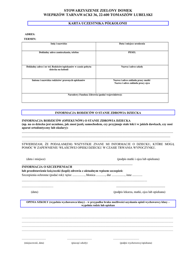 STOWARZYSZENIE ZIELONY DOMEK WIEPRZÓW TARNAWACKI 36, 22-600 TOMASZÓW LUBELSKI KARTA UCZESTNIKA PÓŁKOLONII ADRES: TERMIN: Imię i nazwisko Data i miejsce urodzenia Dokładny adres zamieszkania, telefon PESEL Dokładny adres i nr tel. Rodziców/opiekunów w czasie pobytu dziecka na kolonii Nazwa i adres szkoły Imiona i nazwiska rodziców/ prawnych opiekunów Nazwa i adres zakładu pracy matki Nazwa i adres zakładu pracy ojca Narodowy Fundusz Zdrowia (podać województwo): INFORMACJA RODZICÓW O STANIE ZDROWIA DZIECKA INFORMACJA RODZICÓW (OPIEKUNÓW) O STANIE ZDROWIA DZIECKA (np. na co dziecko jest uczulone, jak znosi jazdę samochodem, czy przyjmuje stale leki i w jakich dawkach, czy nosi aparat ortodontyczny lub okulary): .................................................................................................................................................................... ................................................................................................................................................................. ……………………………………………............................................................................................. STWIERDZAM, ŻE PODAŁAM(EM) WSZYSTKIE ZNANE MI INFORMACJE O DZIECKU, KTÓRE MOGĄ POMÓC W ZAPEWNIENIU WŁAŚCIWEJ OPIEKI DZIECKU W CZASIE TRWANIA WYPOCZYNKU. (data i miejsce) (podpis matki i ojca lub opiekuna) ____________________________________________________________ INFORMACJA O SZCZEPIENIACH lub przedstawienie książeczki (kopii) zdrowia z aktualnym wpisem szczepień: Szczepienia ochronne (podać rok): tężec ................, błonica ............, dur ................., inne ............. ................................................................................................................................................................... ..................................................... ......................................... (data) (podpis lekarza, matki, ojca lub opiekuna) OPINIA SZKOŁY (wypełnia wychowawca klasy) – w przypadku braku możliwości uzyskania opinii wychowawcy klasy – wypełnia rodzic lub opiekun ...................................................................................................................................................................................................................................................... ...................................................................................................................................................................................................................................................... ...................................................................................................................................................................................................................................................... ...................................................................................................................................................................................................................................................... ....................................... ........................................ (miejscowość, data) (pieczęć szkoły) .......................................... (podpis wychowawcy/opiekuna) Potwierdzenie pobytu dziecka na wypoczynku Dziecko przebywało na ……………………………………………………………………………………………………………………...........…………………………….. (forma i adres miejsca wypoczynku) od dnia …......…..……. do dnia ……….....…….. 2…………. r. ………………….........……. (data) ………………………………………………………….. (czytelny podpis kierownika wypoczynku) Uwagi i spostrzeżenia wychowawcy o dziecku podczas pobytu na półkolonii ……………………………………………………………………………………………………………………………………………………………………………… ……………………………………………………………………………………………………………………………………………………………………………… ……………………………………………………………………………………………………………………………………………………………………………… ……………………………………………………………………………………………………………………………………………………………………………… ……………………………………………………………………………………………………………………………………………………………………………… ................................................... (miejscowość, data) …..................................... (podpis wychowawcy) Informacje o stanie zdrowia dziecka w czasie pobytu na półkolonii ……………………………………………………………………………………………………………………………………………………………………………… ……………………………………………………………………………………………………………………………………………………………………………… ……………………………………………………………………………………………………………………………………………………………………………… ……………………………………………………………………………………………………………………………………………………………………………… ....................................... (miejscowość, data) 