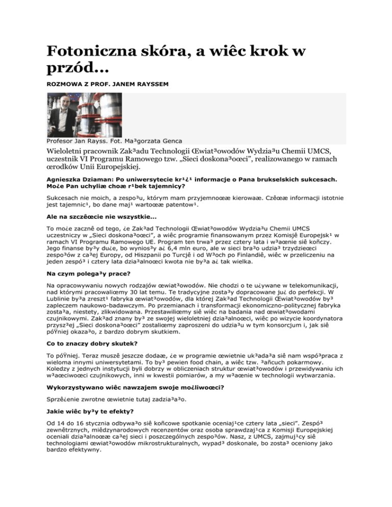 Fotoniczna skóra, a wiêc krok w przód... ROZMOWA Z PROF. JANEM RAYSSEM Profesor Jan Rayss. Fot. Ma³gorzata Genca Wieloletni pracownik Zak³adu Technologii Œwiat³owodów Wydzia³u Chemii UMCS, uczestnik VI Programu Ramowego tzw. „Sieci doskona³oœci”, realizowanego w ramach œrodków Unii Europejskiej. Agnieszka Dziaman: Po uniwersytecie kr¹¿¹ informacje o Pana brukselskich sukcesach. Mo¿e Pan uchyliæ choæ r¹bek tajemnicy? Sukcesach nie moich, a zespo³u, którym mam przyjemnoœæ kierowaæ. Czêœæ informacji istotnie jest tajemnic¹, bo dane maj¹ wartoœæ patentow¹. Ale na szczêœcie nie wszystkie... To mo¿e zacznê od tego, ¿e Zak³ad Technologii Œwiat³owodów Wydzia³u Chemii UMCS uczestniczy w „Sieci doskona³oœci”, a wiêc programie finansowanym przez Komisjê Europejsk¹ w ramach VI Programu Ramowego UE. Program ten trwa³ przez cztery lata i w³aœnie siê koñczy. Jego finanse by³y du¿e, bo wynios³y a¿ 6,4 mln euro, ale w sieci bra³o udzia³ trzydzieœci zespo³ów z ca³ej Europy, od Hiszpanii po Turcjê i od W³och po Finlandiê, wiêc w przeliczeniu na jeden zespó³ i cztery lata dzia³alnoœci kwota nie by³a a¿ tak wielka. Na czym polega³y prace? Na opracowywaniu nowych rodzajów œwiat³owodów. Nie chodzi o te u¿ywane w telekomunikacji, nad którymi pracowaliœmy 30 lat temu. Te tradycyjne zosta³y dopracowane ju¿ do perfekcji. W Lublinie by³a zreszt¹ fabryka œwiat³owodów, dla której Zak³ad Technologii Œwiat³owodów by³ zapleczem naukowo-badawczym. Po przemianach i transformacji ekonomiczno-politycznej fabryka zosta³a, niestety, zlikwidowana. Przestawiliœmy siê wiêc na badania nad œwiat³owodami czujnikowymi. Zak³ad znany by³ ze swojej wieloletniej dzia³alnoœci, wiêc po wizycie koordynatora przysz³ej „Sieci doskona³oœci” zostaliœmy zaproszeni do udzia³u w tym konsorcjum i, jak siê póŸniej okaza³o, z bardzo dobrym skutkiem. Co to znaczy dobry skutek? To póŸniej. Teraz muszê jeszcze dodaæ, ¿e w programie œwietnie uk³ada³a siê nam wspó³praca z wieloma innymi uniwersytetami. To by³ pewien food chain, a wiêc tzw. ³añcuch pokarmowy. Koledzy z jednych instytucji byli dobrzy w obliczeniach struktur œwiat³owodów i przewidywaniu ich w³aœciwoœci czujnikowych, inni w kwestii pomiarów, a my w³aœnie w technologii wytwarzania. Wykorzystywano wiêc nawzajem swoje mo¿liwoœci? Sprzê¿enie zwrotne œwietnie tutaj zadzia³a³o. Jakie wiêc by³y te efekty? Od 14 do 16 stycznia odbywa³o siê koñcowe spotkanie oceniaj¹ce cztery lata „sieci”. Zespó³ zewnêtrznych, miêdzynarodowych recenzentów oraz osoba sprawdzaj¹ca z Komisji Europejskiej oceniali dzia³alnoœæ ca³ej sieci i poszczególnych zespo³ów. Nasz, z UMCS, zajmuj¹cy siê technologiami œwiat³owodów mikrostrukturalnych, wypad³ doskonale, bo zosta³ oceniony jako bardzo efektywny. A jak Pañstwa badania prze³o¿¹ siê na ¿ycie przeciêtnego obywatela Polski? Œwiat³owody, które potrafimy zrobiæ i których wytwarzanie rozwinêliœmy w ci¹gu tych czterech ostatnich lat, s¹ miêdzy innymi czu³e na zmiany ciœnienia zewnêtrznego albo na rozci¹ganie. Mog¹ byæ wbudowane w tzw. budowle cywilne, jak m.in. budynki, tamy itd. Na bie¿¹co mo¿na wiêc monitorowaæ stan naprê¿eñ, odkszta³cenia. W przypadku mostu mo¿na siê natychmiast dowiedzieæ, ¿e przejecha³ samochód, który wa¿y³ tonê itd. W podobne czujniki jest np. wyposa¿ony nowy dworzec kolejowy w Berlinie. Nie s¹ to jednak czujniki tej klasy, nad którymi my pracowaliœmy. Konsekwencj¹ tych dobrych efektów by³o zaproszenie Pana do siódmego programu? PHOSFOS to program nieco mniejszy ni¿ NEMO i wymaga mniejszych nak³adów œrodków finansowych. Cel tych badañ jest bardzo interesuj¹cy... Cel jest jeden i nazywa siê: fotoniczna skóra. Brzmi to zarazem ciekawie i tajemniczo. Fotoniczna skóra to oczywiœcie sztuczna skóra. Jest to p³at elastycznego polimeru z zatopionymi w nim zaawansowanymi czujnikami œwiat³owodowymi. Zastosowanie? Np. ochrona zdrowia i monitorowanie chorego. Dziêki fotonicznej skórze mo¿na kontrolowaæ bicie serca, oddech itd. Mo¿na j¹ równie¿ zastosowaæ w robotyce. Ta dziedzina rozwija siê dzisiaj bardzo intensywnie. Bada siê np. mo¿liwoœæ produkcji robotów opiekuj¹cych siê chorymi. Taki robot bêdzie móg³ podaæ szklankê wody. Musi wzi¹æ w palce pojemnik, ale musi te¿ wiedzieæ, z jak¹ si³¹ mo¿e naciskaæ, aby go nie upuœciæ albo nie zgnieœæ. W tym pomo¿e w³aœnie fotoniczna skóra. Na przestrzeni tych trzydziestu lat, od kiedy funkcjonuje zak³ad, wiele siê zmieni³o. Nast¹pi³a prawdziwa rewolucja. Pierwsze œwiat³owody s³u¿y³y g³ównie telekomunikacji, a wiêc transmitowa³y w postaci analogowej lub cyfrowej mowê, obraz lub dane pomiêdzy komputerami. Te nowe œwiat³owody czujnikowe to zupe³nie nowy rozdzia³. Mamy zreszt¹ dzisiaj dwa mechanizmy dzia³ania œwiat³owodów. S¹ te zbli¿one do tradycyjnych i drugi, zupe³nie inny tzw. œwiat³owód z fotoniczn¹ przerw¹ zabronion¹. Sam nie bardzo rozumiem, jak to dzia³a... (œmiech) Oczywiœcie to ¿art? No tak. Dla czytelników to mo¿e byæ zbyt skomplikowane. W ka¿dym razie te nowe œwiat³owody maj¹ ciekawe w³aœciwoœci. Gdyby zreszt¹ nie fakt, i¿ technologia ich wytwarzania jest w tej chwili tak bardzo skomplikowana i kosztowna, to mog³oby dojœæ do prawdziwej rewolucji. Kilka lat temu metr mikrostrukturalnego œwiat³owodu kosztowa³ 400-500 euro, a metr tego zwyk³ego kilka centów.