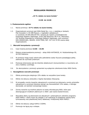 REGULAMIN PROMOCJI „15 % rabatu na żywe kwiaty” 13.06 do 16.06 1. Postanowienia ogólne: 1.1. Nazwa promocji: 15 % rabatu na żywe kwiaty. 1.2. Organizatorem promocji jest IKEA Retail Sp. z o.o. z siedzibą w Jankach, Plac Szwedzki 3, 05-090 Raszyn, z kapitałem zakładowym w wysokości 20.000.000,00 PLN, wpisaną do rejestru przedsiębiorców Krajowego Rejestru Sądowego, przez Sąd Rejonowy dla m.st. Warszawy, XIV Wydział Gospodarczy Krajowego Rejestru Sądowego, pod numerem KRS 0000091681, REGON: 010577890, NIP: 527 010 33 85 zwana dalej Organizatorem. 2. Warunki korzystania z promocji: 2.1. Czas trwania promocji 13.06 – 16.06 2.2. Miejsce przeprowadzenia promocji – sklep IKEA KATOWICE, Al. Roździeńskiego 95, 40-203 Katowice. 2.3. W promocji mogą wziąć udział tylko pełnoletnie osoby fizyczne posiadające pełną zdolność do czynności prawnych. 2.4. Promocja skierowana jest do klientów detalicznych (konsumentów) w rozumieniu art. 22(1) kodeksu cywilnego. 2.6. Do skorzystania z promocji uprawnieni są wyłącznie członkowie klubu IKEA Family. 3. Szczegółowe warunki promocji: 3.1. Oferta promocyjna obejmuje 15% rabatu na wszystkie żywe kwiaty. 3.2. Oferta nie dotyczy artykułów z Kącika Sprzedaży Okazyjnej. 3.3. W przypadku zwrotu towarów zakupionych w promocji po dokonaniu zwrotu artykułów zakupionych w promocji klientowi potrąci się równowartość 15% rabatu, z którego skorzystał, od wartości zwracanego towaru 3.4 Zwroty towarów są możliwe jedynie na kartę refundacyjną IKEA, która jest obowiązującym środkiem płatniczym w IKEA i jest ważna bezterminowo. 3.5 Wszystkie oferty są skierowane do aktualnych i potencjalnych członków programu IKEA FAMILY i klient może się ubiegać o ich realizację na podstawie ważnej karty tymczasowej oraz plastikowej karty rabatowej i kredytowej IKEA FAMILY. 3.6 Oferta nie dotyczy usługi KUPUJ Z DOMU. 3.7 Promocje nie łączą się w sklepie. 4. Inne postanowienia: 4.1. Przystąpienie do promocji jest równoznaczne z potwierdzeniem zapoznania się klienta z treścią niniejszego Regulaminu i jego akceptacją. 4.2. Wszelkie reklamacje dotyczące promocji należy składać w formie pisemnej w terminie 14 dni od dnia uczestnictwa w promocji na ręce Kierownika Sklepu IKEA, w którym dokonano zakupu. W przypadku przesłania reklamacji za pośrednictwem poczty, decyduje data nadania pisma w urzędzie pocztowym. Reklamacje będą rozpatrzone pisemnie w terminie 14 dni. Powyższe nie wyłącza, nie ogranicza, ani nie zawiesza uprawnień klienta związanych z nabytym towarem/wykonaną usługą (w tym składania reklamacji co do ich jakości) wynikających z obowiązujących przepisów prawa, w tym ustawy z dnia 27 lipca 2002 roku o szczególnych warunkach sprzedaży konsumenckiej oraz o zmianie Kodeksu cywilnego (Dz.U. 2002, nr 141, poz. 1176 z późn. zm.). 4.3. Pisemna reklamacja powinna zawierać: dane kontaktowe z Klientem tj. imię i nazwisko, adres, telefon oraz opis i powód reklamacji. 4.4. Regulamin promocji do akcji „-15% na żywe kwiaty”, dostępny jest w sklepie IKEA Katowice w Dziale Obsługi Klienta oraz na www.IKEA.pl/Katowice. 4.5. W sprawach nieuregulowanych niniejszym regulaminem mają zastosowanie odpowiednie przepisy kodeksu cywilnego. 4.6. Wszelkie spory wynikłe z tytułu wykonania zobowiązań związanych z niniejszą promocją będą rozstrzygane przez właściwy sąd powszechny. Katowice, 16.06.2014