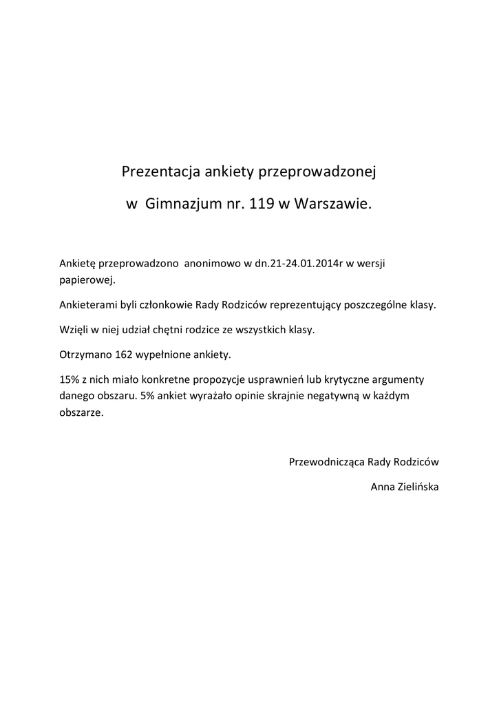Prezentacja ankiety przeprowadzonej w Gimnazjum nr. 119 w Warszawie. Ankietę przeprowadzono anonimowo w dn.21-24.01.2014r w wersji papierowej. Ankieterami byli członkowie Rady Rodziców reprezentujący poszczególne klasy. Wzięli w niej udział chętni rodzice ze wszystkich klasy. Otrzymano 162 wypełnione ankiety. 15% z nich miało konkretne propozycje usprawnień lub krytyczne argumenty danego obszaru. 5% ankiet wyrażało opinie skrajnie negatywną w każdym obszarze. Przewodnicząca Rady Rodziców Anna Zielińska Czy Twoim zdaniem w naszej szkole stwarza się rodzicom warunki do wyrażania opinii o jej funkcjonowaniu? NIE 12% brak 7% TAK 81% Czy w Twojej opinii szkoła współdecyduje z rodzicami na rzecz rozwoju ich dzieci? brak 9% NIE 16% TAK 75% Czy Twoim zdaniem Rada Rodziców realnie współdecyduje o sprawach szkoły? brak 10% NIE 12% TAK 78% Czy uważasz, że szkoła powinna być miejscem aktywizacji rodziców? brak 6% NIE 26% TAK 68% Czy byłbyś zainteresowany wieczornymi zajęciami organizowanymi w szkole dla rodziców? brak 14% TAK 43% NIE 43% Na 162 głosujących aż 111 rodziców uważa, że szkoła ma możliwości, aby dzięki udostępnianiu przestrzeni pomóc w budowie więzi społecznych między rodzicami i aż 69 rodziców zadeklarowało chęć uczestniczenia w zajęciach organizowanych wieczorami bądź w soboty w szkole. Propozycje zajęć dla rodziców , które mogłyby być zorganizowane przez Radę Rodziców z udostępnieniem sal przez szkołę: Ø Sportowe -> płatne, ojcowie, piłka, sala sportowa 1/tyg. Ø Fitness -> płatne, mamy, córki za darmo, gimnastyka „ zdrowy kręgosłup” III-VI, 1/tyg. wieczór, sala lub korytarz Ø Kurs fotograficzny -> płatne, wszyscy, dziecko za darmo, kilka sobót IV-V, sala lekcyjna, wystawa prac w gablocie szkolnej w VI Ø Wieczory piosenki/koncerty -> darmowe, wszyscy+ dzieci, występy rodziców i/lub zapraszani artyści, aula, 1/semestr Ø Tenis stołowy -> darmowe, ojcowie i synowie, 1/tyg. wieczorem IV-VI Kółko teatralne oraz Taneczne uzyskały zbyt małą liczbę chętnych. Oceń wizerunek i zaufanie do szkoły bardzo dobre dobre Serie1 dostateczne niskie 0 20 40 60 80 Oceń możliwości rozwoju ucznia (koła, projekty, konkursy) bardzo dobre dobre Serie1 dostateczne niskie 0 20 40 60 80 Oceń komunikację szkoła – rodzic bardzo dobre dobre Serie1 dostateczne niskie 0 20 40 60 80 Oceń komunikację Rada Rodziców – rodzic bardzo dobre dobre Serie1 dostateczne niskie 0 20 40 60 80 Oceń działalność Rady Rodziców bardzo dobre dobre Serie1 dostateczne niskie 0 20 40 60 80 Oceń organizację imprez okolicznościowych przez szkołę bardzo dobre dobre Serie1 dostateczne niskie 0 20 40 60 80 Oceń dziennik elektroniczny bardzo dobre dobre Serie1 dostateczne niskie 0 20 40 60 80 Oceń zebrania rodziców bardzo dobre dobre Serie1 dostateczne niskie 0 20 40 60 80 100 Oceń dostępność wychowawcy i nauczycieli prowadzących bardzo dobre dobre Serie1 zadawalające niskie 0 20 40 60 80 Wpływ rodziców w stopniu znikomym lub żadnym na: 60 50 40 30 20 10 Serie1 0 Wpływ rodziców w stopniu dostatecznym na: 50 40 30 20 10 Serie1 0 Wpływ rodziców w stopniu dobrym i bardzo dobrym na: 120 100 80 60 40 20 0 Serie1