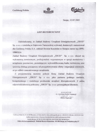 Carlsberg Polska Sierpc, 12.072005 LIST REFERENCYJNY Zaświadczamy, Sp. z 0.0. iż Zakład Budowy Urządzeń Dźwignicowych ,,zBUD" z siedzibą w Dąbrowie Tarnowskiej wykonał, dostarczył i zamontował dla Carlsberg Polska S.A oddział Browar Kasztelan w Sierpcu żuraw typ zpx- 1500/3,lr. Zakład Budowy Urządzeń Dźwignicowych wykonawcą terminowym, profesjonalnie urządzenia pomiarowe, posiadającym "ZBUD" Sp. z 0.0. okazał się wyposażonym w sprzęt montażowy i wykwalifikowaną kadrę techniczną oraz oferty i negocjacji cenowych, sprawną obsługę począwszy od przygotowywania aż po odbiór zamontowanego urządzenia Z przyjemnością polecić ~,zBUD" Sp. Dźwignicowych kompetentnego możemy i rzetelnego odpowiedzialnością z 0.0. producenta firmę Zakład Budowy Urządzeń jako partnera godnego zaufania, dźwignicowych. Z pełną urządzeń polecamy ,,zDUD" Sp. z 0.0. potencjalnym klientom. MANAGER d". Ul~~a Ruchu i Inwestycji "-~~'.J? '-!v1a",i( PAplinski Carlaberg Polska SA, PL 02-690 Warszawa, ul. Bokserska 66, WW\'ó:l"Ulsbcrgpolska.pl, tx:L +48 22 543 1400. fax +48 22 543 1+ 60 Sp6lb zarcj strowana w Rejestrze Przedsiębiorców .Kapitał Akcyjny: 28 720 701 PLN IffiGON: Adres do korespondencji: w KRS pod numerem 35347 005703108, NIP: 869 000 30 54 Oddział Browar Kav,teJan, 09-200 Sierpc, ul Świętokrzy ka 27
