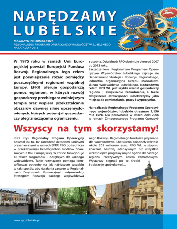 W 1975 roku w ramach Unii Europejskiej powstał Europejski Fundusz Rozwoju Regionalnego. Jego celem jest pomniejszanie różnic pomiędzy poszczególnymi regionami wspólnej Europy. EFRR oferuje gospodarczą pomoc regionom, w których rozwój gospodarczy przebiega w wolniejszym tempie oraz wspiera przekształcanie obszarów dawniej silnie uprzemysłowionych, których potencjał gospodarczy uległ znaczącemu ograniczeniu. z osobna. Działalność RPO obejmuje okres od 2007 do 2013 roku. Zarządzaniem Regionalnym Programem Operacyjnym Województwa Lubelskiego zajmuje się Departament Strategii i Rozwoju Regionalnego, jednostka organizacyjna Urzędu Marszałkowskiego Województwa Lubelskiego. Nadrzędnym celem RPO WL jest szybki wzrost gospodarczy regionu i zwiększenie zatrudnienia, a także zwiększenie atrakcyjności Lubelszczyzny jako miejsca do zamieszkania, pracy i wypoczynku. Na realizację Regionalnego Programu Operacyjnego województwo lubelskie otrzymało 1,156 mld euro. Dla porównania w latach 2004-2006 w ramach Zintegrowanego Programu Operacyj- Wszyscy na tym skorzystamy! RPO czyli Regionalny Program Operacyjny powstał po to, by zarządzać dotacjami unijnymi przyznawanymi w ramach EFRR. RPO pośredniczy w przekazywaniu beneficjentom środków finansowych z Unii Europejskiej. W Polsce funkcjonuje 16 takich programów – odrębnych dla każdego województwa. Takie rozwiązanie pomaga identyfikować potrzeby na jak najniższym szczeblu w taki sposób, aby działania zawarte w Regionalnych Programach Operacyjnych odpowiadały Strategiom Rozwoju każdego województwa nego Rozwoju Regionalnego fundusze przyznane dla województwa lubelskiego osiągnęły wartość około 201 milionów euro. RPO WL w stopniu znacznie bardziej intensywnym niż wszystkie wcześniejsze programy unijne będzie dla naszego regionu rzeczywistym kołem zamachowym. Wystarczy sięgnąć po te środki i dobrze je spożytkować… Lubelski Plan Marshalla 1 mld 156 mln euro, niemal sześć razy więcej! Do tego dochodzi 511 mln euro w Europejskim Funduszu Społecznym oraz 508 mln euro w specjalnym programie Rozwój Polski Wschodniej. Wykorzystamy te pieniądze? – Jestem przekonany, że tak. Z jednej strony mamy wiele projektów, których wymiar przekracza skalę lokalności, z drugiej zaś dysponujemy przeogromnym potencjałem intelektu i przedsiębiorczości naszych mieszkańców. Już dziś wiadomo, że o środki z RPO WL ubiegać się będą nie tylko gminy i przedsiębiorstwa, ale również wielka grupa organizacji pozarządowych, instytucji kulturalnych oraz ludzie biznesu. Absolutnie nie martwię się o podaż projektów – problemem może być ich jakość, dopasowanie do poszczególnych priorytetów programowych, a także posiadany wkład własny przyszłych beneficjentów. Panie marszałku, województwo lubelskie plasuje się w czołówce regionów najlepiej wykorzystujących środki europejskie… – Ściślej mówiąc: pod tym względem jesteśmy na pierwszym miejscu w kraju! Takie zresztą poczyniliśmy sobie postanowienie – wykorzystać wszystkie dostępne fundusze. Mam wrażenie, że taka okazja może się nie powtórzyć przez najbliższe kilkadziesiąt lat. Europa Zachodnia miała po wojnie swój plan Marshalla, my mamy wsparcie finansowe zjednoczonej Europy i byłoby wielkim grzechem z niego nie skorzystać. Perspektywa dostępu do środków unijnych w latach 2007-2013 wygląda w tym kontekście bardzo kusząco. – Zgadzam się. W programie obowiązującym w latach 2004–2006 wykorzystaliśmy około 201 milionów euro, czyli ponad 103 proc. zaplanowanych środków. Tym razem do dyspozycji naszego województwa – w ramach Regionalnego Programu Operacyjnego Województwa Lubelskiego – jest Które z przedsięwzięć planowanych już w ramach RPO WL wydaje się Panu najważniejsze? – Z całą pewnością lotnisko w Świdniku. Jest to projekt o charakterze cywilizacyjnym, niestety, spóźniony o dobrych kilkanaście lat. System komunikacji w każdym kraju i w każdym regionie decyduje o inwestycjach, o zainteresowaniu ze strony zewnętrznego kapitału, o turystyce. Ziemia Lubelska nie może sobie pozwolić na marnowanie szans rozwojowych, a niestety wiele z nich przeszło nam koło nosa właśnie dlatego, że nie dajemy inwestorom i turystom odpowiedniego wsparcia komunikacyjnego. Rozmowa z Krzysztofem Grabczukiem, Marszałkiem Województwa Lubelskiego W maju, jeśli wszystko pójdzie zgodnie z planem, powinniśmy mieć kompletną dokumentację portu lotniczego. Wszyscy mówią, że to wyjątkowe przedsięwzięcie. Po kilkunastu miesiącach starań, dzięki zaangażowaniu ogromnej grupy ludzi, od posłów i senatorów, przez działaczy samorządowych, na mediach i ludziach opinii skończywszy, udało nam się zebrać większość potrzebnych dokumentów. Ruszamy z inwestycją, która wkrótce otworzy Lubelskie na świat. Nie będzie tak jak z Teatrem w Budowie? – Na pewno nie! Jest to co prawda skomplikowane przedsięwzięcie - podejrzewam, że procedury i uzgodnienia potrwają dłużej niż sama budowa – jednak wszystko pójdzie zgodnie z planem. Jeśli zaś chodzi o Teatr w Budowie, on również niedługo przestanie być w stanie wiecznego zawieszenia. Korzystając z Regionalnego Programu Operacyjnego Województwa Lubelskiego chcemy wreszcie zakończyć tę budowę – są pieniądze: 134 miliony złotych, jest projekt finansowania, niedługo powinniśmy doczekać szczęśliwego finału. Według planu, w roku 2013 obiekt teatralny u zbiegu ulic Skłodowskiej, Grottgera i Radziszewskiego w Lublinie będzie częścią Centrum Spotkania Kultur. Powstanie jeden z najprężniejszych ośrodków kultury w Polsce. CSK stanie się platformą wielu wspaniałych działań artystycznych, dysponującą salą teatralną na 1000 miejsc. Jako ciekawostkę dodam, że do ogłoszonego niedawno konkursu na koncepcję architektoniczną przystąpiło 49 firm i konsorcjów, w tym również z USA i Europ