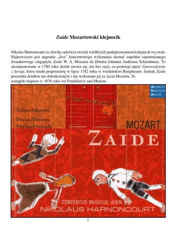 Zaide Mozartowski klejnocik Nikolas Harnoncourt co chwilę zadziwia swoich wielbicieli podejmowaniem kolejnych wyzwań. Najnowszym jest nagranie „live” koncertowego wykonania niemal zupełnie zapomnianego dwuaktowego singspielu Zaide W. A. Mozarta do libretta Johanna Andreasa Schachtnera. To skomponowane w 1780 roku dzieło uważa się, nie bez racji, za prototyp opery Uprowadzenie z Seraju, która miała prapremierę w lipcu 1782 roku w wiedeńskim Burgtheater. Jednak Zaide pozostała dziełem nie dokończonym i nie wykonano jej za życia Mozarta. To nastąpiło dopiero w 1876 roku we Frankfurcie nad Menem. 1 Mimo, że daleko temu dziełu do muzycznej wartości wspomnianego Uprowadzenia z Seraju, Cosi fan tutte, albo Wesela Figara, to jednak można się tutaj doszukać kilku fragmentów, w których Mozart dowodzi swojego muzycznego geniuszu. Mam tu na myśli: arię Zaidy Ruhe sanft, mein holdes Leben z I aktu, gdzie solistce towarzyszą obój i fagot, „arię gniewu” Ich bin so bös’als gut sułtana Solimana, czy uroczy tercet Zaide, Gomatza i Allazima: O selige Wonne z finału I aktu. Równie interesująco wypada kwartet: Freundlin, stille deine Tränen, śpiewany przez: Gomatza, Allazina, Sollimana i Zaide w ostatniej scenie. Przechodząc do omówienia nagrania prezentowanego należy od razu zaznaczyć, że Harnoncourt zebrał zespół doskonałych solistów znakomicie czujących mozartowski styl i elegancję. Diana Damarau z ogromną swobodą i kulturą pokonuje niemałe trudności tytułowej partii, jej głos ujmuje bogactwem brzmienia i barwy. Dysponujący tenorem o pięknej nasyconej barwie Michael Schade jest doskonałym Gomatzem podobnie jak obdarzony głębokim basem Rudolf Schasching Solimanem. Dzielnie im dotrzymuje kroku Florian Boesch jako Allazim. No i dyrygent finezyjnie pieszczący każdą frazę i precyzyjnie panujący nad każdym ansamblem. Muzyka pod jego wytrawną batutą brzmi selektywnie i klarownie mieniąc się przy tym pełną paletą barw. Harnoncourt sprawia, że muzyka Mozarta nie brzmi cukierkowato, ale ujmuje wyrazistą artykulacją, wewnętrzną energią i pełnią emocji nie tracąc nic ze swojej elegancji. Warto jeszcze wspomnieć, że rolę uwertury, której Zaide nie posiada, gra w tym nagraniu Symfonia Es- dur KV 184. Jednym słowem: interesujące pod każdym względem nagranie. 2