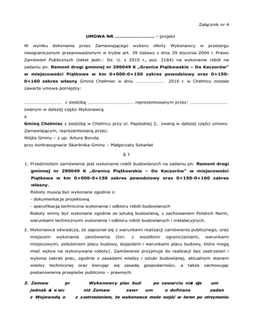 Załącznik nr 4 UMOWA NR .......................... - projekt W wyniku dokonania przez Zamawiającego wyboru oferty Wykonawcy w przetargu nieograniczonym przeprowadzonym w trybie art. 39 Ustawy z dnia 29 stycznia 2004 r. Prawo Zamówień Publicznych (tekst jedn.: Dz. U. z 2015 r., poz. 2164) na wykonanie robót na zadaniu pn. Remont drogi gminnej nr 290049 K „Granice Piątkowskie – Do Kaczorów” w miejscowości Piątkowa w km 0+000-0+150 zakres powodziowy oraz 0+1500+160 zakres własny Gmina Chełmiec w dniu .................. 2016 r. w Chełmcu została zawarta umowa pomiędzy: ………………………….. z siedzibą .............................. reprezentowanym przez: …...................... zwanym w dalszej części Wykonawcą a Gminą Chełmiec z siedzibą w Chełmcu przy ul. Papieskiej 2, zwaną w dalszej części umowy Zamawiającym, reprezentowaną przez: Wójta Gminy – z up. Artura Borutę przy kontrasygnacie Skarbnika Gminy – Małgorzaty Szkarłat §1 1. Przedmiotem zamówienia jest wykonanie robót budowlanych na zadaniu pn. Remont drogi gminnej nr 290049 K „Granice Piątkowskie – Do Kaczorów” w miejscowości Piątkowa w km 0+000-0+150 zakres powodziowy oraz 0+150-0+160 zakres własny. Roboty muszą być wykonane zgodnie z: - dokumentacja projektową - specyfikacją techniczna wykonania i odbioru robót budowlanych Roboty winny być wykonane zgodnie ze sztuką budowlaną, z zachowaniem Polskich Norm, warunkami technicznymi wykonania i odbioru robót budowlanych i instalacyjnych. 2. Wykonawca oświadcza, że zapoznał się z warunkami realizacji zamówienia publicznego, oraz miejscem wykonania zamówienia (tzn. z wszelkimi ograniczeniami, warunkami miejscowymi, położeniem placu budowy, dojazdem i warunkami placu budowy, które mogą mieć wpływ na wykonywane roboty). Zamówienie przyjmuje do realizacji bez zastrzeżeń i wykona zakres prac, zgodnie z zasadami wiedzy i sztuki budowlanej, aktualnym stanem wiedzy technicznej oraz kierując się zasadą gospodarności, a także zachowując postanowienia przepisów publiczno – prawnych. 3. Zamaw pr jednak ni e wc z Wojewodą o Wykonawcy plac bud niż Zamaw zawr po zawarciu nini ejs um o dofinans um zadan z zastrzeżeniem, że wykonawca może wejść w teren po otrzymaniu pisemnej zgody od Zamawiającego. 4. Wykonawca ponosi odpowiedzialność za jakościowo dobre wykonanie robót. §2 Strony ustaliły termin realizacji zamówienia do 31.10.2016 r. §3 1. Strony ustaliły następującą cenę ryczałtową za wykonanie przedmiotu umowy określonego w § 1: brutto - …………………. zł (słownie …………....................................………..). 2. Wynagrodzenie określone w ust. 1 nie ulega zmianie do dnia pełnego odbioru przedmiotu umowy. 3. Zapłata wynagrodzenia określonego w pkt 1 nastąpi zgodnie z §9. §4 1. Zabezpieczenie należytego wykonania umowy w wysokości 10% wynagrodzenia umownego brutto tj. ................... zł na okres wykonywania zamówienia oraz okres gwarancji jakości zostanie wniesione w ...................... przed podpisaniem umowy. 2. Zwolnienie zabezpieczenia należytego wykonania umowy nastąpi: a) 70 % wartości zabezpieczenie należytego wykonania umowy tj. kwota .............. zł w terminie 30 dni od daty protokołu zdawczo-odbiorczego podpisanego przez wyznaczonych przedstawicieli stron, b) 30 % wartości zabezpieczenia należytego wykonania umowy tj. kwota ...............zł zostanie zwolniona w terminie do 15 dni od upływu okresu gwarancji jakości. §5 Zamawiający nie dokona odbioru i zapłaty robót, wykonanych niezadowalająco pod względem jakościowym i niezgodnie z Warunkami Technicznymi Wykonania i Odbioru Robót Budowlano Montażowych. Obowiązki Wykonawcy §6 1. Wykonawca sporządzi lub zapewni sporządzenie, przed rozpoczęciem budowy, planu bezpieczeństwa i ochrony zdrowia, uwzględniając specyfikę obiektu budowlanego i warunki prowadzenia robót budowlanych. 2. Wykonawca dostarczy wszelkie materiały budowlane oraz sprzęt budowlany, zatrudni pracowników, dostarczy, utrzyma i usunie po zakończeniu robót wszelkie urządzenia placu budowy. 3. Wykonawca zobowiązuje się na swój koszt, strzec mienia znajdującego się na terenie budowy a także zapewnić warunki bezpieczeństwa. 4. Wykonawca zobowiązuje się do ubezpieczenia budowy z tytułu szkód losowych oraz odpowiedzialności cywilnej, 5. Wykonawca jest zobowiązany do przekazania Zamawiającemu przedmiotu umowy wraz z rozliczeniem rzeczowym zadania. 6. Wykonawca pokrywa koszty: a) ubezpieczenia placu budowy i robót, b) zabezpieczenia robót pod względem bhp, c) zabezpieczenia placu budowy. 7. W czasie realizacji robót Wykonawca będzie utrzymywał teren robót w stanie wolnym od przeszkód pomocnicze komunikacyjnych i zbędne oraz materiały, będzie odpady usuwał i i składował śmieci oraz wszelkie urządzenia niepotrzebne urządzenia prowizoryczne. 8. Wykonawca zobowiązuje się do umożliwienia wstępu na teren robót pracownikom organów państwowego nadzoru budowlanego, do których należy wykonywanie zadań określonych Ustawą - Prawo Budowlane oraz do udostępnienia im danych i informacji wymaganych tą Ustawą. 9. Po zakończeniu robót Wykonawca zobowiązany jest uporządkować teren robót i przekazać go Zamawiającemu w terminie ustalonym na odbiór robót. §7 Niezależnie od obowiązków wymienionych w umowie Wykonawca przyjmuje na siebie następujące obowiązki szczegółowe: 1. Informowanie na piśmie Zamawiającego i inspektora nadzoru inwestorskiego o konieczności wykonania robót dodatkowych i zamiennych w terminie 7 dni od daty stwierdzenia konieczności ich wykonania. 2. Informowanie Inspektora Nadzoru Inwestorskiego o terminie zakrycia robót ulegających zakryciu oraz terminie odbioru robót zanikających. Jeżeli Wykonawca nie poinformował o tych faktach, zobowiązany jest odkryć roboty lub wykonać otwory niezbędne do zbadania robót, a 