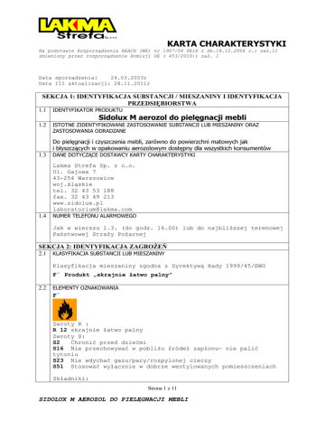 KARTA CHARAKTERYSTYKI Na podstawie Rozporządzenia REACH (WE) nr 1907/06 PEiR z dn.18.12.2006 r.; zał.II zmieniony przez rozporządzenie Komisji UE ( 453/2010|) zał. I Data sporządzenia: 24.03.2003r Data III aktualizacji: 28.11.2011r SEKCJA 1: IDENTYFIKACJA SUBSTANCJI / MIESZANINY I IDENTYFIKACJA PRZEDSIĘBIORSTWA 1.1 IDENTYFIKATOR PRODUKTU 1.2 ISTOTNE ZIDENTYFIKOWANE ZASTOSOWANIE SUBSTANCJI LUB MIESZANINY ORAZ ZASTOSOWANIA ODRADZANE Sidolux M aerozol do pielęgnacji mebli Do pielęgnacji i czyszczenia mebli, zarówno do powierzchni matowych jak i błyszczących w opakowaniu aerozolowym dostępny dla wszystkich konsumentów 1.3 DANE DOTYCZĄCE DOSTAWCY KARTY CHARAKTERYSTYKI Lakma Strefa Sp. z o.o. Ul. Gajowa 7 43-254 Warszowice woj.śląskie tel. 32 43 53 188 fax. 32 43 49 213 www.sidolux.pl [email protected] 1.4 NUMER TELEFONU ALARMOWEGO Jak w wierszu 1.3. (do godz. 16.00) lub do najbliŜszej terenowej Państwowej StraŜy PoŜarnej SEKCJA 2: IDENTYFIKACJA ZAGROśEŃ 2.1 KLASYFIKACJA SUBSTANCJI LUB MIESZANINY Klasyfikacja mieszaniny zgodna z Dyrektywą Rady 1999/45/EWG F + Produkt „skrajnie łatwo palny” 2.2 ELEMENTY OZNAKOWANIA F+ Zwroty R : R 12 skrajnie łatwo palny Zwroty S: S2 Chronić przed dziećmi S16 Nie przechowywać w pobliŜu źródeł zapłonu- nie palić tytoniu S23 Nie wdychać gazu/pary/rozpylonej cieczy S51 Stosować wyłącznie w dobrze wentylowanych pomieszczeniach Składniki: Strona 1 z 11 SIDOLUX M AEROZOL DO PIELĘGNACJI MEBLI KARTA CHARAKTERYSTYKI Na podstawie Rozporządzenia REACH (WE) nr 1907/06 PEiR z dn.18.12.2006 r.; zał.II zmieniony przez rozporządzenie Komisji UE ( 453/2010|) zał. I Sidolux M aerozol Sidolux M aerozol Sidolux M aerozol Salicylate, Hexyl 2.3 kwiat: kompozycja zapachowa migdał: kompozycja zapachowa miodowy: kompozycja zapachowa ( Benzyl Cinnamal) INNE ZAGROśENIA Pojemnik pod ciśnieniem: chronić przed słońcem i nagrzaniem powyŜej 50°C. Nie przekłuwać ani nie spalać, takŜe po zuŜyciu SEKCJA 3:SKŁAD/ INFORMACJA O SKŁADNIKACH 3.1 3.2 SUBSTANCJE Nie dotyczy MIESZANINY NIEBEZPIECZNE SKŁADNIKI MIESZANINY (WE) 1272/2008 Nazwa substancji/ INCI Nr indeksowy Nr WE name mieszanina gazów płynnych propan-butan- izobutan Nr CAS 100 % mieszanina gazów płynnych propan- butan- izobutan zawiera: Butan 601-004-00-0 203-448-7 106-97-8 Izobutan 601-004-00-0 200-857-2 75-28-5 Propan 601-003-00-5 200-827-9 74-98-6 Nr rejestru % wagowy Klasa zagroŜenia Zwroty H ------- 10-15 % Flam gas 1 Press gas H 220 H 280 01211947469132 01211948539527 01211948694421 0-100 % Flam gas 1 Press gas H 220 H 280 0-100 % Flam gas 1 Press gas H 220 H 280 0-100 % Flam gas 1 Press gas H 220 H 280 NIEBEZPIECZNE SKŁADNIKI MIESZANINY wg Dyrektywy 67/548 /EWG Nazwa substancji/ INCI Nr indeksowy Nr WE name mieszanina gazów płynnych propan-butan- izobutan Nr CAS 100 % mieszanina gazów płynnych propan- butan- izobutan zawiera: Butan 601-004-00-0 203-448-7 106-97-8 Izobutan 601-004-00-0 200-857-2 75-28-5 Propan 601-003-00-5 200-827-9 74-98-6 Nr rejestru % wagowy Symbol zagroŜenia Zwroty R ------- 10-15 % F R12 01211947469132 01211948539527 01211948694421 0-100 % F 0-100 % F 0-100 % F + + R12 + R12 + R12 SEKCJA 4: ŚRODKI PIERWSZEJ POMOCY 4.1 Opis środków pierwszej pomocy W przypadku wystąpienia jakichkolwiek niepokojących objawów wezwać natychmiast lekarza lub odwieźć poszkodowanego do szpitala, pokazać kartę charakterystyki, opakowanie produktu lub etykietę. Inhalacja W warunkach normalnych zagroŜenie praktycznie nie istnieje. W warunkach awaryjnych wyprowadzić lub wynieść poszkodowanego na świeŜe powietrze. Kontakt z Przepłukać obficie wodą, jeŜeli podraŜnienie oczu oczami utrzymuje się, skonsultować się ze specjalistą. Kontakt ze Zapobiegawczo umyć wodą z mydłem. W przypadku Strona 2 z 11 SIDOLUX M AEROZOL DO PIELĘGNACJI MEBLI KARTA CHARAKTERYSTYKI Na podstawie Rozporządzenia REACH (WE) nr 1907/06 PEiR z dn.18.12.2006 r.; zał.II zmieniony przez rozporządzenie Komisji UE ( 453/2010|) zał. I skórą Połknięcie: 4.2 podraŜnienia skóry skonsultować się z lekarzem. Wypić 1-2 szklanki wody. W razie potrzeb skontaktować się z lekarzem, pokazać kartę charakterystyki, opakowanie produktu lub etykietę. Nieprzytomnej osobie nigdy nie podawać nic doustnie. NAJWAśNIEJSZE OSTRE I OPÓŹNIONE OBJAWY ORAZ SKUTKI NARAśENIA Patrz pkt 11. 4.3 WSKAZANIA DOTYCZĄCE WSZELKIEJ NATYCHMIASTOWEJ POMOCY LEKARSKIEJ I SZCZEGÓLNEGO POSTĘPOWANIA Z POSZKODOWANYM Brak danych SEKCJA 5: POSTĘPOWANIE W PRZYPADKU POśARU 5.1 ŚRODKI GAŚNICZE dwutlenek węgla, proszki gaśnicze, gaśnica pianowa, prądy wodne rozproszone. 5.2 SZCZEGÓLNE ZAGROśENIE ZWIĄZANE Z SUBSTANCJĄ LUB MIESZANINĄ podczas poŜaru powstają niebezpieczne dla zdrowia pary i dymy, które mogą zawierać tlenki węgla, siarki oraz związki organiczne i nieorganiczne. Nie wdychać dymów. 5.3 INFORMACJE DLA STRAśY POśARNEJ: odzieŜ gazoszczelna i aparaty izolujące drogi oddechowe niezaleŜne od otaczającego powietrza. SEKCJA 6: POSTĘPOWANIE W PRZYPADKU NIEZAMIERZONEGO UWOLNIENIA DO ŚRODOWISKA 6.1 INDYWIDUALNE ŚRODKI OCHRONY, WYPOSAśENIE OCHRONNE I PROCEDURY W SYTUACJACH AWARAYJNYCH Nie dopuszczać osób postronnych i nieupowaŜnionych. Unikać bezpośredniego kontaktu z produktem, zapewnić wentylację, stosować odpowiednie środki ochrony indywidualnej, patrz pkt.8. 6.2 ŚRODKI OSTROśNOŚCI W ZAKRESIE OCHRONY ŚRODOWISKA Zapobiegać zanieczyszczeniu gleby i wody oraz przedostaniu się do kanalizacji, rowów lub rzek. 6.3 6.4 METODY I MATERIAŁY ZAPOBIEGAJĄCE ROZPRZESTRZENIANIU SIĘ SKAśENIA I SŁUśĄCE DO USUWANIA SKAśENIA wchłaniać za pomocą materiałów neutralnych (ziemia, piasek) i umieścić w odpowiednio oznakowanym pojemniku. Oczyścić skaŜony teren. Przekazać do utylizacji. ODNIESIENIA DO INNYCH SEKCJI Informacje dotyczące odpowiedniego sprzętu ochrony osobistej podano w sekcji 8 Informacje dotyczące usuwania odpadów podano w sekcji 13 SEKCJA