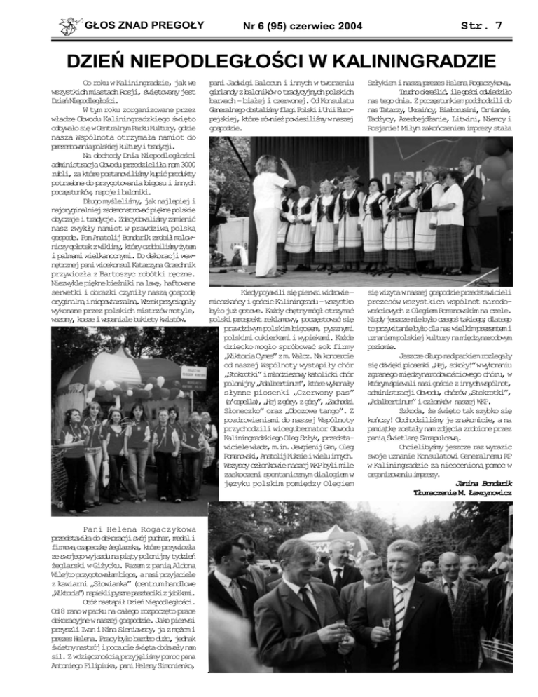 GŁOS ZNAD PREGOŁY Nr 6 (95) czerwiec 2004 Str. 7 DZIEŃ NIEPODLEGŁOŚCI W KALININGRADZIE Co roku w Kaliningradzie, jak we wszystkich miastach Rosji, świętowany jest DzieńNiepodległości. W tym roku zorganizowane przez władze Obwodu Kaliningradzkiego święto odbywałosięwCentralnymParkuKultury,gdzie nasza Wspólnota otrzymała namiot do prezentowaniapolskiejkulturyitradycji. Na obchody Dnia Niepodległości administracja Obwodu przedzieliła nam 3000 rubli,zaktórepostanowiliśmykupićprodukty potrzebne do przygotowania bigosu i innych poczęstunków,napojeibaloniki. Długo myśleliśmy, jak najlepiej i najoryginalniejzademonstrowaćpięknepolskie obyczajeitradycje.Zdecydowaliśmyzamienić nasz zwykły namiot w prawdziwą polską gospodę.PanAnatolijBondarik zrobił malowniczyopłotekzwikliny,któryozdobiliśmyżytem i palmami wielkanocnymi. Do dekoracji wewnętrznejpaniwicekonsulKatarzyna Grzechnik przywiozła z Bartoszyc robótki ręczne. Niezwyklepiękne bieżnikinalawę,haftowane serwetki i obrazki czyniły naszą gospodę oryginalnąiniepowtarzalną.Wzrokprzyciągały wykonane przez polskich mistrzów motyle, wazony,koszeiwspanialebukietykwiatów. Pani Helena Rogaczykowa przedstawiładodekoracjiswójpuchar,medali firmowączapeczkężeglarską,któreprzywiozła zeswojegowyjazdunapiątypolonijnytydzień żeglarski w Giżycku. Razem z panią Aldoną Wilejtoprzygotowałambigos,anasiprzyjaciele z kawiarni „Słowianka” (centrum handlowe „Wiktoria”)napieklipysznepasztecikizjabłkami. OtóżnastąpiłDzieńNiepodległości. Od 8 rano w parku na całego rozpoczęto prace dekoracyjnew naszej gospodzie.Jako pierwsi przyszli Iwani Nina Sieniawscy, ja zmężem i prezesHelena.Pracybyłobardzodużo,jednak świetnynastrójipoczucieświętadodawałynam sil. Z wdzięcznością przyjęliśmy pomoc pana Antoniego Filipiuka,pani HelenySimonienko, pani Jadwigi Balocun i innych w tworzeniu girlandyz baloników otradycyjnychpolskich barwach – białej i czerwonej. Od Konsulatu GeneralnegodostaliśmyflagiPolskiiUniiEuropejskiej,którerównieżpowiesiliśmywnaszej gospodzie. Szłykiem i naszą prezes Heleną Rogaczykową. Trudnookreślić,ilegościodwiedziło nastegodnia.Zpoczęstunkiempodchodzilido nasTatarzy,Ukraińcy,Białorusini,Ormianie, Tadżycy, Azerbejdżanie, Litwini, Niemcy i Rosjanie! Miłym zakończeniem imprezy stała Kiedypojawilisiępierwsiwidzowie– mieszkańcy i goście Kaliningradu – wszystko było już gotowe. Każdy chętny mógł otrzymać polski prospekt reklamowy, poczęstować się prawdziwym polskim bigosem, pysznymi polskimi cukierkami i wypiekami. Każde dziecko mogło spróbować sok firmy „WiktoriaCymes”zm.Wałcz.Nakoncercie od naszej Wspólnoty wystąpiły chór „Stokrotki”imłodzieżowykatolickichór polonijny„Adalbertinum”,którewykonały słynne piosenki „Czerwony pas” (a’capella),„Hejzgóry,zgóry”,„Zachodzi Słoneczko” oraz „Obozowe tango”. Z pozdrowieniami do naszej Wspólnoty przychodzili wicegubernator Obwodu KaliningradzkiegoOleg Szłyk, przedstawicielewładz,m.in.JewgienijGan,Oleg Romanowski,AnatolijKuksieiwieluinnych. Wszyscy członkowie naszej WKP byli mile zaskoczeni spontanicznym dialogiem w języku polskim pomiędzy Olegiem sięwizytawnaszejgospodzieprzedstawicieli prezesów wszystkich wspólnot narodowościowych z Olegiem Romanowskim na czele. Nigdyjeszczeniebyłoczegośtakiego;dlatego toprzywitaniebyłodlanaswielkimprezentemi uznaniempolskiejkultury namiędzynarodowym poziomie. Jeszczedługonadparkiemrozlegały siędźwiękipiosenki„Hej,sokoły!”wwykonaniu zgranego międzynarodowościowego chóru, w którymśpiewalinasigościezinnychwspólnot, administracji Obwodu, chórów „Stokrotki”, „Adalbertinum” iczłonków naszej WKP. Szkoda, że święto tak szybko się kończy! Obchodziliśmy je znakomicie, a na pamiątkę zostały nam zdjęcia zrobione przez panią Świetlanę Sarapułcewą. Chcielibyśmy jeszcze raz wyrazic swoje uznanie Konsulatowi Generalnemu RP w Kaliningradzie za nieocenioną pomoc w organizowaniuimprezy. Janina Bondarik Tłumaczenie M. Ławrynowicz