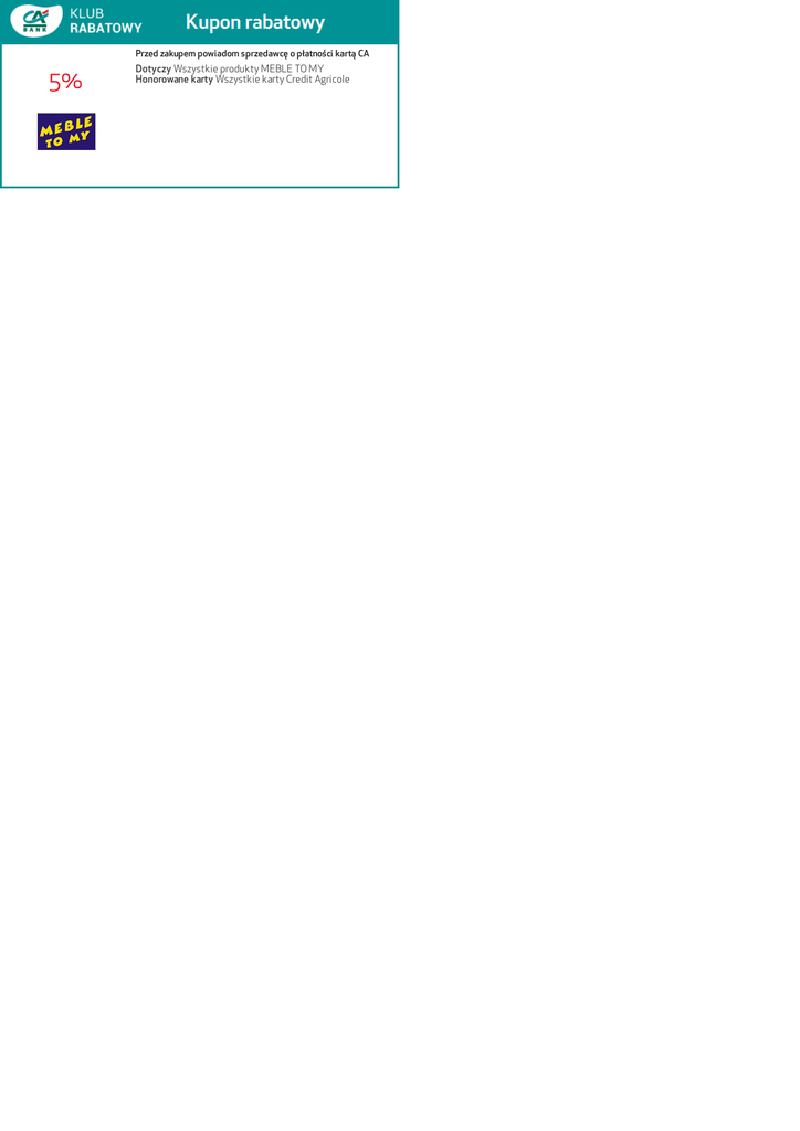 Przed zakupem powiadom sprzedawcę o płatności kartą CA 5% Dotyczy Wszystkie produkty MEBLE TO MY Honorowane karty Wszystkie karty Credit Agricole