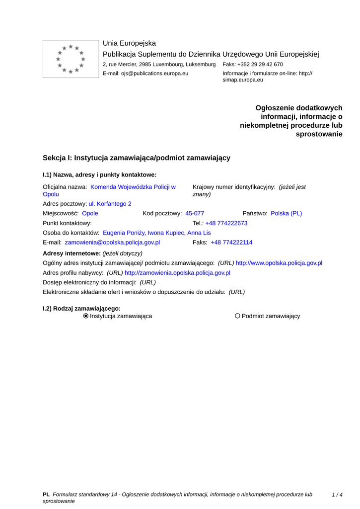Unia Europejska Publikacja Suplementu do Dziennika Urzędowego Unii Europejskiej 2, rue Mercier, 2985 Luxembourg, Luksemburg Faks: +352 29 29 42 670 E-mail: [email protected] Informacje i formularze on-line: http:// simap.europa.eu Ogłoszenie dodatkowych informacji, informacje o niekompletnej procedurze lub sprostowanie Sekcja I: Instytucja zamawiająca/podmiot zamawiający I.1) Nazwa, adresy i punkty kontaktowe: Oficjalna nazwa: Komenda Wojewódzka Policji w Opolu Krajowy numer identyfikacyjny: (jeżeli jest znany) _____ Adres pocztowy: ul. Korfantego 2 Miejscowość: Opole Kod pocztowy: 45-077 Punkt kontaktowy: _____ Państwo: Polska (PL) Tel.: +48 774222673 Osoba do kontaktów: Eugenia Poniży, Iwona Kupiec, Anna Lis E-mail: [email protected] Faks: +48 774222114 Adresy internetowe: (jeżeli dotyczy) Ogólny adres instytucji zamawiającej/ podmiotu zamawiającego: (URL) http://www.opolska.policja.gov.pl Adres profilu nabywcy: (URL) http://zamowienia.opolska.policja.gov.pl Dostęp elektroniczny do informacji: (URL) _____ Elektroniczne składanie ofert i wniosków o dopuszczenie do udziału: (URL) _____ I.2) Rodzaj zamawiającego: Instytucja zamawiająca Podmiot zamawiający PL Formularz standardowy 14 - Ogłoszenie dodatkowych informacji, informacje o niekompletnej procedurze lub sprostowanie 1/4 Sekcja II: Przedmiot zamówienia II.1.1) Nazwa nadana zamówieniu: Dostawa części i akcesoriów do pojazdów służbowych KWP w Opolu - Fiat Ducato II.1.2) Krótki opis zamówienia lub zakupu: (podano w pierwotnym ogłoszeniu) Przedmiotem zamówienia jest dostawa części zamiennych i akcesoriów do pojazdów służbowych eksploatowanych przez Komendę Wojewódzką Policji w Opolu, w ilości i asortymencie wskazanym w opisie przedmiotu zamówienia, stanowiącym załącznik do specyfikacji istotnych warunków zamówienia. Przedmiot zamówienia będzie zamawiany partiami, które w treści umowy określane są jako „jednorazowe zamówienie”, w zależności od aktualnych potrzeb zamawiającego. Wielkość „jednorazowego zamówienia” zostanie każdorazowo uzgodniona poprzez pisemne zgłoszenie w terminie do 3 dni przed odbiorem licząc od chwili zgłoszenia. Odbiór przedmiotu zamówienia dokonywany będzie sukcesywnie partiami transportem własnym zamawiającego ze wskazanego przez wykonawcę punktu znajdującego się w granicach administracyjnych miasta Opola lub wykonawca dostarczy zamówione części do trzech dni od zgłoszenia przesłanego faksem na numer wykonawcy, przez zamawiającego na adres Wydziału Transportu Komendy Wojewódzkiej Policji w Opolu, ul. Oleska 95, 45-232 Opole. Zamawiający dopuszcza składanie ofert równoważnych przy zachowaniu warunku równoważności w ramach pojęć niżej określonych odpowiednio: I. Pod pojęciem „części zamienne oryginalne” należy rozumieć produkty o tej samej jakości co komponenty stosowane do montażu przez producenta pojazdu samochodowego, produkowane zgodnie ze specyfikacjami i standardami produkcyjnymi ustalonymi przez producenta tych pojazdów do produkcji komponentów lub części zamiennych danego pojazdu samochodowego, w tym części zamienne produkowane na tej samej linii produkcyjnej co komponenty danego pojazdu samochodowego, jeżeli producent tych części zamiennych lub podmiot upoważniony do kontroli jakości zaświadcza, że zostały one wyprodukowane zgodnie ze specyfikacjami i standardami produkcyjnymi ustalonymi przez producenta danych pojazdów i są one tej samej jakości co części stosowane do montażu tych pojazdów. II. Pod pojęciem „części zamienne o porównywalnej jakości” należy rozumieć produkty, których producent zaświadcza, że są one tej samej jakości co komponenty, które są lub były stosowane do montażu danych pojazdów samochodowych. Wskazane w opisie przedmiotu zamówienia numery katalogowe służą wyłącznie do doprecyzowania określenia asortymentu przedmiotu zamówienia. Zamawiający nie wymaga dostawy wyłącznie produktów opisanych wskazanym numerem katalogowym, jeżeli dostarczone produkty odpowiednio spełniają wymienione warunki równoważności funkcjonalnej jak opisane wskazanym numerem katalogowym. Wyłoniony w toku postępowania o udzielenie zamówienia publicznego wykonawca, na żądanie zamawiającego, ma obowiązek przedłożyć zaświadczenie potwierdzające odpowiednio oryginalność albo porównywalną jakość produktów w ramach ww. warunków równoważności. Wykazanie równoważności przedmiotu zamówienia (zgodnie z art. 30 ust.5 Ustawy Pzp) spoczywa na wykonawcy II.1.3) Wspólny Słownik Zamówień (CPV) Główny przedmiot Dodatkowe przedmioty Słownik główny 34300000 34322000 42913000 31432000 Słownik uzupełniający (jeżeli dotyczy) PL Formularz standardowy 14 - Ogłoszenie dodatkowych informacji, informacje o niekompletnej procedurze lub sprostowanie 2/4 Sekcja IV: Procedura IV.1)Rodzaj procedury (podano w pierwotnym ogłoszeniu) Otwarta Ograniczona Ograniczona przyspieszona Negocjacyjna Negocjacyjna przyspieszona Dialog konkurencyjny Negocjacyjna z uprzednim ogłoszeniem Negocjacyjna bez uprzedniego ogłoszenia Negocjacyjna z publikacją ogłoszenia o zamówieniu Negocjacyjna bez publikacji ogłoszenia o zamówieniu Udzielenie zamówienia bez uprzedniej publikacji ogłoszenia o zamówieniu w Dzienniku Urzędowym Unii Europejskiej IV.2)Informacje administracyjne IV.2.1)Numer referencyjny: (podano w pierwotnym ogłoszeniu) WS-Z.2380.22.1449.2014” IV.2.2)Dane referencyjne ogłoszenia w przypadku ogłoszeń przesłanych drogą elektroniczną: Pierwotne ogłoszenie przesłane przez eNotices TED eSender Login: ENOTICES_KWP-Opole Dane referencyjne ogłoszenia: 2014-073809 rok i numer dokumentu IV.2.3)Ogłoszenie, którego dotyczy niniejsza publikacja: Numer ogłoszenia w Dz.U.: 2014/S 109-191837 z dnia: 07/06/2014 (dd/mm/rrrr) IV.2.4)Data wysłania pierwotnego ogłoszenia: 05/06/2014 (dd/mm/rrrr) PL Formularz standardowy 14 - Ogłoszenie dod