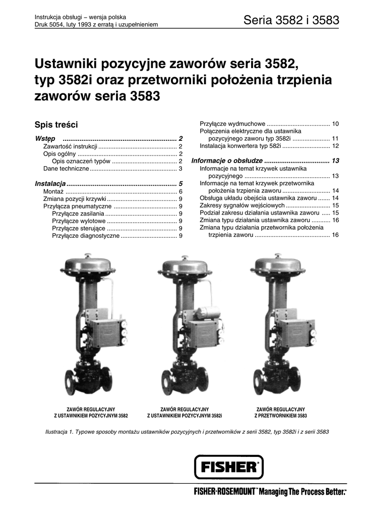 Instrukcja obsługi − wersja polska Druk 5054, luty 1993 z erratą i uzupełnieniem Seria 3582 i 3583 Ustawniki pozycyjne zaworów seria 3582, typ 3582i oraz przetworniki położenia trzpienia zaworów seria 3583 Spis treści Wstęp ............................................................. 2 Zawartość instrukcji .............................................. 2 Opis ogólny .......................................................... 2 Opis oznaczeń typów ...................................... 2 Dane techniczne ................................................... 3 Instalacja ........................................................... 5 Montaż ................................................................. 6 Zmiana pozycji krzywki ......................................... 9 Przyłącza pneumatyczne ..................................... 9 Przyłącze zasilania .......................................... 9 Przyłącze wylotowe ......................................... 9 Przyłącze sterujące ......................................... 9 Przyłącze diagnostyczne ................................. 9 ZAWÓR REGULACYJNY Z USTAWNIKIEM POZYCYJNYM 3582 Przyłącze wydmuchowe ..................................... 10 Połączenia elektryczne dla ustawnika pozycyjnego zaworu typ 3582i ...................... 11 Instalacja konwertera typ 582i ............................ 12 Informacje o obsłudze ................................... 13 Informacje na temat krzywek ustawnika pozycyjnego .................................................. 13 Informacje na temat krzywek przetwornika położenia trzpienia zaworu ............................ 14 Obsługa układu obejścia ustawnika zaworu ....... 14 Zakresy sygnałów wejściowych .......................... 15 Podział zakresu działania ustawnika zaworu ..... 15 Zmiana typu działania ustawnika zaworu ........... 16 Zmiana typu działania przetwornika położenia trzpienia zaworu ............................................ 16 ZAWÓR REGULACYJNY Z USTAWNIKIEM POZYCYJNYM 3582i ZAWÓR REGULACYJNY Z PRZETWORNIKIEM 3583 Ilustracja 1. Typowe sposoby montażu ustawników pozycyjnych i przetworników z serii 3582, typ 3582i i z serii 3583 1 Seria 3582 i 3583 Spis treści (ciąg dalszy) Kalibracja ustawnika pozycyjnego zaworu lub przetwornika położenia trzpienia zaworu .... 17 Kalibracja wstępna ............................................. 17 Kalibracja ........................................................... 18 Zasada działania............................................. 18 Ustawniki pozycyjne zaworów z serii 3582 ......... 18 Ustawnik pozycyjny zaworu z serii 3582i ........... 19 Przetworniki położenia trzpienia zaworu z serii 3583 .................................................... 19 Regulacja osi obrotu przesłony .......................... 23 Wymiana głównego pierścienia uszczelniającego i filtra konwertera typ 582i ............................. 23 Wymiana pierścienia uszczelniającego pokrywy obudowy konwertera typ 582i ......... 23 Demontaż konwertera typ 528i ........................... 23 Złożenie konwertera typ 582i ............................. 23 Sposób zamawiania ....................................... 24 Wykaz zestawów naprawczych .................... 24 Konserwacja ................................................... 20 Wymiana sprężyny zakresu ............................... 20 Wymiana uszczelek ............................................ 21 Wymiana pierścienia uszczelniającego dyszy .... 21 Demontaż i wymiana przekaźnika ...................... 22 Konserwacja przekaźnika ................................... 23 Wstęp Zawartość instrukcji Instrukcja niniejsza zawiera informacje na temat instalacji, kalibracji, obsługi i części zamiennych pneumatycznych ustawników pozycyjnych zaworów z serii 3582, elektropneumatycznych ustawników pozycyjnych zaworów typ 3582i i przetworników położenia trzpienia zaworu z serii 3583. Szczegółowe informacje o działaniu i obsłudze siłowników, zaworów regulacyjnych i innego wyposażenia dodatkowego można znaleźć w oddzielnych instrukcjach obsługi. Czynności związane z instalacją, obsługą i konserwacją ustawników pozycyjnych i przetworników położenia powinny być wykonywane tylko przez pracowników posiadających odpowiednie kwalifikacje lub doświadczenie w tym zakresie. W przypadku zaistnienia jakichkolwiek wątpliwości, przed przystąpieniem do wykonywania dalszych czynności należy skontaktować się z biurem przedstawicielskim w celu ich wyjaśnienia. Opis Pneumatyczne ustawniki pozycyjne zaworów z serii 3582 i elektropneumatyczne ustawniki zaworów typ 3582i, pokazane na ilustracji 1 współpracują z zaworami regulacyjnymi z trzpieniem przesuwnym wyposażonymi w siłownik membranowy. Pneumatyczne ustawniki pozycyjne zmieniają ciśnienie zasilania podawane do siłownika zaworu regulacyjnego w odpowiedzi na zmiany pneumatycznego sygnału sterującego. Ustawnik pozycyjny reguluje ciśnienie zasilania siłownika, aby utrzymać położenie trzpienia zaworu proporcjonalne do pneumatycznego sygnału wejściowego. Typ 3582i jest ustawnikiem elektropneumatycznym zaworu składającym się z elektropneumatycznego konwertera typ 582i zamontowanego na ustawniku 2 Wykaz części zamiennych............................. 24 Schematy połączeń elektrycznych w obszarach zagrożonych wybuchem .... 37 pozycyjnym typ 3582. Ustawnik pozycyjny typ 3582i zapewnia precyzyjne ustawienie trzpienia zaworu w żądanej pozycji proporcjonalnej do wejściowego sygnału stałoprądowego. Elektropneumatyczny konwerter typ 582i jest urządzeniem, które może być zainstalowane fabrycznie lub w warunkach polowych. Nie zaleca się planowania instalacji konwertera typ 582i na istniejącym już ustawniku pozycyjnym, bez wcześniejszej konsultacji z biurem przedstawicielskim firmy Fisher−Rosemount. Konwerter typ 5882i zamienia w układzie dyszy/przesłony stałoprądowy sygnał wej