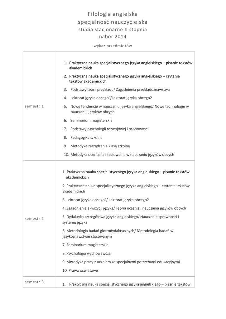 Filologia angielska specjalność nauczycielska studia stacjonarne II stopnia nabór 2014 wykaz przedmiotów 1. Praktyczna nauka specjalistycznego języka angielskiego – pisanie tekstów akademickich 2. Praktyczna nauka specjalistycznego języka angielskiego – czytanie tekstów akademickich 3. Podstawy teorii przekładu/ Zagadnienia przekładoznawstwa 4. Lektorat języka obcego1/Lektorat języka obcego2 semestr 1 5. Nowe tendencje w nauczaniu języka angielskiego/ Nowe technologie w nauczaniu języków obcych 6. Seminarium magisterskie 7. Podstawy psychologii rozwojowej i osobowości 8. Pedagogika szkolna 9. Metodyka zarządzania klasą szkolną 10. Metodyka oceniania i testowania w nauczaniu języków obcych 1. Praktyczna nauka specjalistycznego języka angielskiego – pisanie tekstów akademickich 2. Praktyczna nauka specjalistycznego języka angielskiego – czytanie tekstów akademickich 3. Lektorat języka obcego1/ Lektorat języka obcego2 4. Zagadnienia akwizycji języka/ Teoria uczenia i nauczania języków obcych semestr 2 5. Dydaktyka szczegółowa języka angielskiego/ Nauczanie sprawności i systemu języka 6. Metodologia badań glottodydaktycznych/ Metodologia badań w językoznawstwie stosowanym 7. Seminarium magisterskie 8. Psychologia wychowawcza 9. Metodyka pracy z uczniem ze specjalnymi potrzebami edukacyjnymi 10. Prawo oświatowe semestr 3 1. Praktyczna nauka specjalistycznego języka angielskiego – pisanie tekstów akademickich 2. Praktyczna nauka specjalistycznego języka angielskiego – czytanie tekstów akademickich 3. Praktyczna nauka specjalistycznego języka angielskiego – ekspresja ustna – sztuka przemówień publicznych/ Praktyczna nauka specjalistycznego języka angielskiego – ekspresja ustna – sztuka prezentacji 4. Metodologia badań glottodydaktycznych/ Metodologia badań w językoznawstwie stosowanym 5. Seminarium magisterskie 6. Wybrane aspekty kształcenia literackiego 7. Socjolingwistyka 8. Komunikacja międzykulturowa 9. Praktyki zawodowe pedagogiczno-psychologiczne 10. Praktyki zawodowe obserwacyjne 1. Praktyczna nauka specjalistycznego języka angielskiego – pisanie tekstów akademickich 2. Praktyczna nauka specjalistycznego języka angielskiego – czytanie tekstów akademickich semestr 4 3. Seminarium magisterskie 4. Zróżnicowanie językowe w Europie 5. Praktyki zawodowe ciągłe 6. Praca dyplomowa opiekun roku: dr Maria Korusiewicz