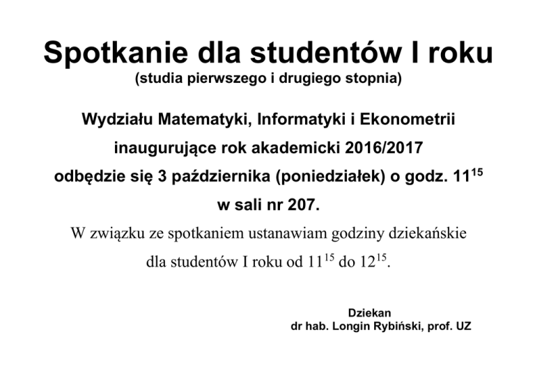 Spotkanie dla studentów I roku (studia pierwszego i drugiego stopnia) Wydziału Matematyki, Informatyki i Ekonometrii inaugurujące rok akademicki 2016/2017 odbędzie się 3 października (poniedziałek) o godz. 1115 w sali nr 207. W związku ze spotkaniem ustanawiam godziny dziekańskie dla studentów I roku od 1115 do 1215. Dziekan dr hab. Longin Rybiński, prof. UZ