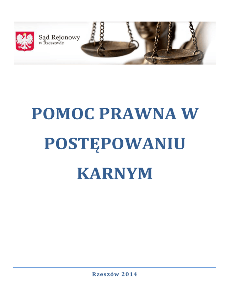POMOC PRAWNA W POSTĘPOWANIU KARNYM Rzeszów 2014 Jesteś pokrzywdzonym, podejrzanym lub oskarżonym. Chciałbyś powierzyć ochronę swoich interesów adwokatowi lub radcy prawnemu. Uważasz jednak, że koszty obrońcy i koszty sądowe przekraczają Twoje możliwości finansowe. Możesz skorzystać z pomocy prawnej w sprawach karnych. CO TO JEST POMOC PRAWNA? Jest to pomoc prawna udzielona stronie (pokrzywdzonemu, oskarżycielowi posiłkowemu, powodowi cywilnemu, oskarżycielowi prywatnemu, oskarżonemu, obwinionemu lub podejrzanemu) w postępowaniu karnym prowadzonym przez policję prokuraturę oraz przed sądem. Może ona polegać na: wyznaczeniu obrońcy (pełnomocnika) z urzędu; zwolnieniu z kosztów sądowych. WYZNACZENIE OBROŃCY (PEŁNOMOCNIKA) Z URZĘDU Na czym to polega? Jeśli chciałbyś, aby adwokat bądź radca prawny reprezentował Ciebie przed sądem, ale nie jesteś w stanie za niego zapłacić, możesz wystąpić z wnioskiem do prezesa sądu o wyznaczenie obrońcy (pełnomocnika) z urzędu, czyli adwokata lub radcę prawnego opłacanego przez państwo. Prezes sądu rozpatrzy Twój wniosek i rozstrzygnie, czy spełniasz warunki. Pamiętaj! Od odmowy prezesa NIE przysługuje odwołanie. Jeśli jesteś podejrzany i Twoją sprawą zajmuje się policja lub prokuratura, masz również prawo do wyznaczenia obrońcy z urzędu. Wniosek o pomoc prawną składasz do prezesa sądu za pośrednictwem prokuratury. Jeśli Twój wniosek został pozytywnie rozpatrzony, otrzymujesz pomoc, która jest bezpłatna do zakończenia sprawy. Jeśli wygrasz sprawę, zostaniesz uniewinniony lub sprawa zostanie umorzona, nie ponosisz żadnych kosztów. Jeśli zostaniesz skazany, musisz opłacić koszty postępowania, w tym wynagrodzenie adwokata lub radcy prawnego. Uwaga! Jeżeli znajdujesz się w trudnej sytuacji rodzinnej lub finansowej, możesz zwrócić się do sądu o zwolnienie od opłaty tych kosztów. W tym celu powinieneś ponownie złożyć wniosek do czasu wydania orzeczenia. Jakie warunki należy spełnić? 1. Musisz występować w sprawie jako: - pokrzywdzony (w roli oskarżyciela posiłkowego powoda cywilnego, oskarżyciela prywatnego; - podejrzany; - oskarżony lub obwiniony. Uwaga! Oskarżony otrzymuje adwokata lub obrońcę z urzędu bez żadnego wniosku, czyli z inicjatywy sądu, jeżeli: - jest nieletni; - jest głuchy, niemy lub niewidomy; - jest niepoczytalny; - zarzucono mu zbrodnię (przestępstwo zagrożone karą od 3 lat pozbawienia wolności); - jest pozbawiony wolności (w postępowaniu przed sądem okręgowym jako sądem l instancji); - nie włada językiem polskim (w postępowaniu wykonawczym); jest pozbawiony wolności i nie uczestniczy w rozprawie apelacyjnej przed sądem odwoławczym. 1. Nie jesteś w stanie ponieść kosztów wynagrodzenia obrońcy (pełnomocnika) z urzędu bez szkody dla niezbędnego utrzymania siebie i rodziny. Musisz wykazać to we wniosku, załączając odpowiednie dokumenty. Musisz złożyć wniosek o wyznaczenie obrońcy (pełnomocnika) z urzędu. Co powinien zawierać wniosek? Wniosek powinien zawierać: 1. imię i nazwisko oraz adres wnioskodawcy; 2. oznaczenie prezesa sądu, do którego jest skierowany, oraz sprawy, której dotyczy ( m.in. sygnatura akt, przeciwko komu); 3. wskazanie, że wnioskodawca domaga się wyznaczenia obrońcy lub pełnomocnika z urzędu; 4. uzasadnienie, w którym należy wykazać, że wnioskodawca nie jest w stanie ponieść kosztów obrony lub pełnomocnictwa bez uszczerbku dla niezbędnego utrzymania siebie i rodziny; Pamiętaj! Warto załączyć takie dokumenty, jak: zaświadczenie o zarobkach, zaświadczenie o stanie rodzinnym i majątkowym, zaświadczenie z Rejonowego Urzędu Pracy lub Ośrodka Pomocy Społecznej, formularz podatkowy itp. 5. datę i podpis osoby składającej wniosek. Uwaga! Jeżeli informacje o Twojej sytuacji okażą się nieprawdziwe, sąd może pozbawić Cię pomocy adwokata czy radcy prawnego wyznaczonego z urzędu. Gdzie złożyć wniosek? Wniosek należy złożyć w biurze podawczym sądu rozpatrującego sprawę lub przesłać pocztą na adres tego sądu najlepiej listem poleconym. Jeżeli sprawa jeszcze się toczy przed prokuratorem wniosek można złożyć tylko za pośrednictwem prokuratury prowadzącej postępowanie. Co obrońca oraz pełnomocnik z urzędu może i powinien robić? 1. Ma obowiązek podejmowania wszelkich czynności w czasie procesu aż do prawomocnego jego zakończenia, z wyjątkiem tych, które muszą być wykonane osobiście przez Ciebie, np. składanie zeznań, wyjaśnień. 2. Musi działać w procesie jedynie na Twoją korzyść. 3. Obowiązany jest zapewnić zastępstwo w przypadku urlopu lub innej przyczyny, tak, aby Twoja sprawa nie doznała uszczerbku. Uwaga! Adwokat lub radca prawny nie zrobi wszystkiego za Ciebie. Ty także powinieneś aktywnie uczestniczyć w całości postępowania. ZWOLNIENIE Z KOSZTÓW SĄDOWYCH Koszty sądowe w sprawach karnych są częścią kosztów procesu. Na koszty sądowe składają się: opłaty na rzecz Skarbu Państwa (opłaty za pisma procesowe podlegające opłacie); wydatki poniesione przez Skarb Państwa od chwili wszczęcia postępowania (np. koszty doręczenia wezwań i innych pism, należności świadków i tłumaczy, należności biegłych za wydanie opinii, opłaty za udzielenie informacji z Krajowego Rejestru Karnego). Sąd może zwolnić z kosztów sądowych częściowo lub całkowicie: każdą osobę składającą pismo procesowe do sądu; stronę postępowania. Warunkiem zwolnienia z kosztów jest złożenie wniosku o zwolnienie, w którym uzasadnisz, że nie jesteś w stanie ponieść takich wydatków ze względu na Twoją trudną sytuację rodzinną lub finansową. Wniosek powinien zawierać te same elementy co wniosek o wyznaczenie obrońcy (pełnomocnika) z urzędu. Zwolnienie z kosztów sądowych obejmujących opłaty za korzystanie z adwokata z urzędu przysługuje też oskarżonemu Jeżeli nie jesteś zado