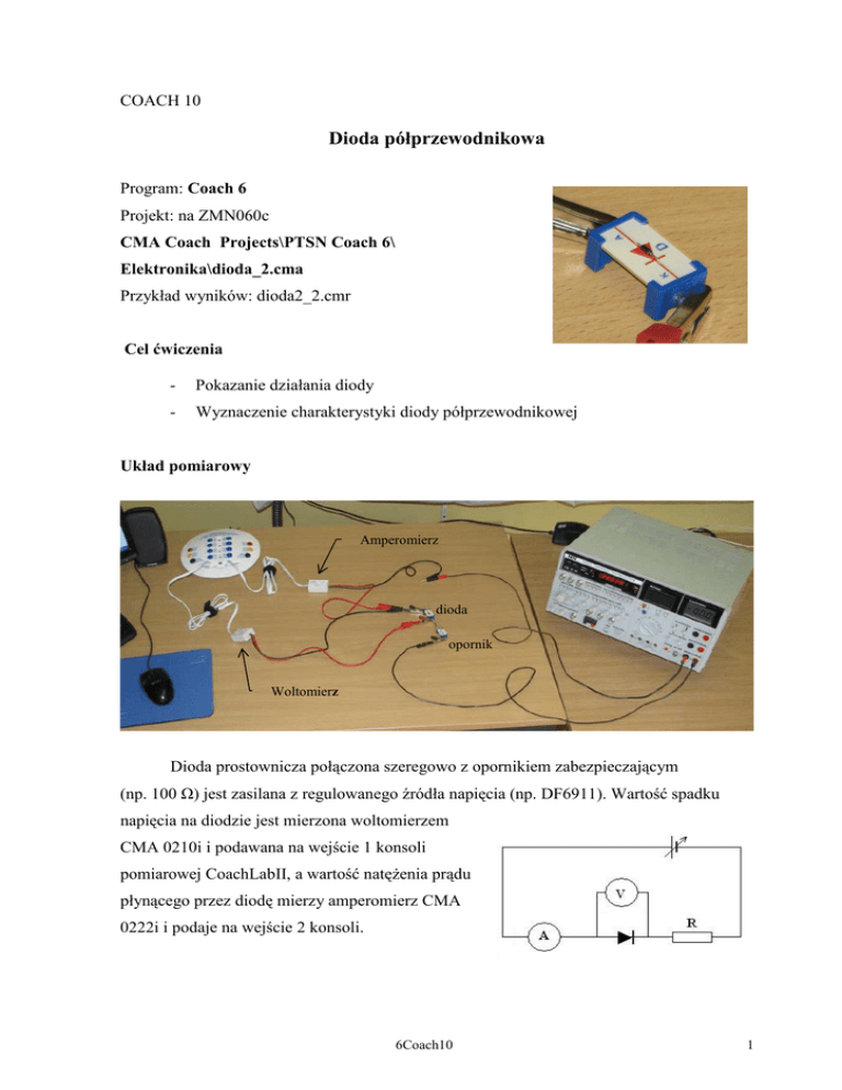 COACH 10 Dioda półprzewodnikowa Program: Coach 6 Projekt: na ZMN060c CMA Coach Projects\PTSN Coach 6\ Elektronika\dioda_2.cma Przykład wyników: dioda2_2.cmr Cel ćwiczenia - Pokazanie działania diody - Wyznaczenie charakterystyki diody półprzewodnikowej Układ pomiarowy Amperomierz dioda opornik Woltomierz Dioda prostownicza połączona szeregowo z opornikiem zabezpieczającym (np. 100 Ω) jest zasilana z regulowanego źródła napięcia (np. DF6911). Wartość spadku napięcia na diodzie jest mierzona woltomierzem CMA 0210i i podawana na wejście 1 konsoli pomiarowej CoachLabII, a wartość natęŜenia prądu płynącego przez diodę mierzy amperomierz CMA 0222i i podaje na wejście 2 konsoli. 6Coach10 1 Ustawienia parametrów pomiaru: Type: Time based Measuring time: 30 seconds Frequency: 50 per second Pomiar: - potencjometrem zasilacza ustawić wybraną wartość napięcia zasilania np. 8V, - rozpocząć pomiar - przycisk start (F9) - zmniejszać napięcie zasilania do zera, zmienić kierunek zasilania (poprzez przełączenie , kabli) i zwiększyć napięcie do poprzedniej wartości. Uzyskana zaleŜność natęŜenia prądu płynącego przez diodę od przyłoŜonego napięcia jest charakterystyką diody. Wyraźnie uwidacznia się kierunek przewodzenia i kierunek zaporowy. Przykładowe wyniki 6Coach10 2 COACH 10a Dioda półprzewodnikowa wariant wykorzystujący zmienne napięcie zasilania Program: Coach 6 Projekt: na ZMN060c CMA Coach Projects\PTSN Coach 6\Elektronika\dioda_2.cma Przykład wyników: dioda2_4.cmr Cel ćwiczenia - Wyznaczenie charakterystyki diody półprzewodnikowej przy wykorzystaniu zmiennego napięcia zasilania Układ pomiarowy Układ pomiarowy pozostaje taki sam jak poprzednia, jedynie zasilany jest napięciem zmieniającym się w zakresie np. od -8.0V do 8.0V. Jako źródło zasilania moŜna uŜyć zasilacza DF6911. Przebiegi napięciowe (np. sinusoidalne) o częstotliwości ok. 1 Hz, generowane przez Function Generator naleŜy wzmocnić wykorzystując Audio Amplifier. Automatyczna zmiany wartości napięcia pozwalają na skrócenie czasu pomiaru np. do 10s. 6Coach10 3 Ustawienia parametrów pomiaru: Type: Time based Measuring time: 10 seconds Frequency: 50 per second Pomiar: - potencjometrami generatora i wzmacniacza ustawić Ŝądaną wartość napięcia zasilania np. 8V, - rozpocząć pomiar - przycisk start (F9) . Przykładowe wyniki 1 2 3 − Prąd przez diodę płynie (praktycznie) tylko w jednym kierunku rys.3. Ten kierunek nazywamy kierunkiem przewodzenia. − W przeciwnym kierunku, kierunku zaporowym, płynie tylko prąd o bardzo małm natęŜęniu, mimo przykładanych na diodę duŜych napięć (tutaj do 8V) rys. 2. − Charakterystyka diody została przedstawiona na rys. 1. 6Coach10 4 COACH 10b Dioda Zenera Program: Coach 6 Projekt: na ZMN060c CMA Coach Projects\PTSN Coach 6\ Termodynamika\DiodaZenera_1.cma Przykład wyników: dioda1_1.cmr Cel ćwiczenia - Pokazanie działania diody Zenera - Wyznaczenie charakterystyki diody Zenera Układ pomiarowy Amperomierz Generator Dioda Zenera Woltomierz Opornik 30Ω Dioda Zenera połączona szeregowo z opornikiem zabezpieczającym (30 Ω) jest zasilana z generatora sygnałów(np. DF6911) sinusoidalnie zmieniającym się napięciem. Wartość spadku napięcia na diodzie jest mierzona woltomierzem CMA 0210i i podawana na wejście 1 konsoli pomiarowej CoachLabII, a wartość natęŜenia prądu płynącego przez diodę mierzy amperomierz CMA 0222i i podaje na wejście 2 konsoli. Sygnały podawane przez generator 6Coach10 5 Schemat układu pomiarowego Ustawienia parametrów pomiaru: Type: Time based Measuring time: 25 seconds Frequency: 50 per second Pomiar: - Na generatorze ustawić częstotliwość podawanego sygnału 0,3 Hz, - rozpocząć pomiar - przycisk start (F9) , Uzyskana zaleŜność natęŜenia prądu płynącego przez diodę od przyłoŜonego napięcia jest charakterystyką diody. Wyraźnie uwidacznia się kierunek przewodzenia i kierunek zaporowy. W kierunku przewodzenia (anoda spolaryzowana dodatnio względem katody) dioda Zenera zachowuje się, jak normalna dioda, natomiast przy polaryzacji zaporowej (katoda spolaryzowana dodatnio względem anody) moŜe przewodzić prąd po przekroczeniu określonego napięcia na złączu. Jest to tzw. napięcie przebicia, które jest praktycznie niezaleŜne od płynącego prądu i zmienia się bardzo nieznacznie nawet przy duŜych zmianach prądu przebicia. Cechą charakterystyczną diody Zenera jest fakt, iŜ napięcie przebicia nie powoduje jej uszkodzenia (w przeciwieństwie do innych diod). 6Coach10 6 Przykładowe wyniki 6Coach10 7 Zastosowanie diod Zenera Diody te stosuje się w: • układach stabilizacji napięć: • ogranicznikach amplitudy; • układach źródeł napięć odniesienia. Wykorzystywane są właściwości charakterystyki prądowo – napięciowej w zakresie przebicia. Przebicie Zenera lub przebicie lawinowe powoduje szybki wzrost prądu przy prawie niezmienionym napięciu. Jest to wstecznego lawinowe w narastanie pobliŜu prądu maksymalnego napięcia wstecznego. Specjalna technologia produkcji tych diod sprawia, Ŝe zjawisko przebicia jest powtarzalne i nie prowadzi do zniszczenia diody, o ile nie zostanie przekroczona dopuszczalna wartość prądu wstecznego związana z maksymalnymi stratami mocy. Wartość napięcia, dla którego następuje przebicie nazywane jest napięciem Zenera – napięciem stabilizacji UZ. Napięcie to mieści się w zakresie od trzech do kilku woltów. Dla danej diody napięcie stabilizacji moŜe się zmieniać w zakresie od UZ min do UZ max. Zakres ten ogranicza zagięcie charakterystyki prądowo – napięciowej oraz dopuszczalne straty mocy Ptot max. Ze względu na dopuszczalne straty mocy, diody stabilizacyjne dzieli się na: małej mocy (Ptot max < 1 W), średniej mocy oraz duŜej mocy (Ptot max > 10 W). Warto wspomnieć o niektórych parametrach diod Zenera. WaŜnymi parametrami diod stabilizacyjnych są: 
