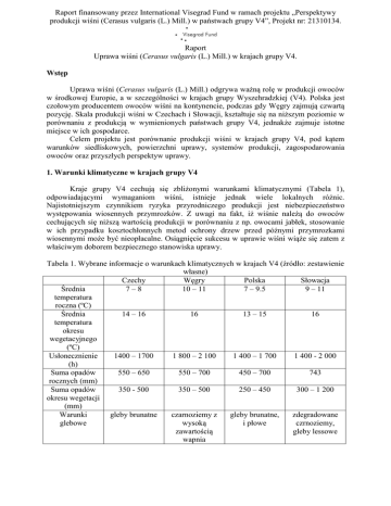 Raport finansowany przez International Visegrad Fund w ramach projektu „Perspektywy produkcji wiśni (Cerasus vulgaris (L.) Mill.) w państwach grupy V4”, Projekt nr: 21310134. Raport Uprawa wiśni (Cerasus vulgaris (L.) Mill.) w krajach grupy V4. Wstęp Uprawa wiśni (Cerasus vulgaris (L.) Mill.) odgrywa ważną rolę w produkcji owoców w środkowej Europie, a w szczególności w krajach grupy Wyszehradzkiej (V4). Polska jest czołowym producentem owoców wiśni na kontynencie, podczas gdy Węgry zajmują czwartą pozycję. Skala produkcji wiśni w Czechach i Słowacji, kształtuje się na niższym poziomie w porównaniu z produkcją w wymienionych państwach grupy V4, jednakże zajmuje istotne miejsce w ich gospodarce. Celem projektu jest porównanie produkcji wiśni w krajach grupy V4, pod kątem warunków siedliskowych, powierzchni uprawy, systemów produkcji, zagospodarowania owoców oraz przyszłych perspektyw uprawy. 1. Warunki klimatyczne w krajach grupy V4 Kraje grupy V4 cechują się zbliżonymi warunkami klimatycznymi (Tabela 1), odpowiadającymi wymaganiom wiśni, istnieje jednak wiele lokalnych różnic. Najistotniejszym czynnikiem ryzyka przyrodniczego produkcji jest niebezpieczeństwo występowania wiosennych przymrozków. Z uwagi na fakt, iż wiśnie należą do owoców cechujących się niższą wartością produkcji w porównaniu z np. owocami jabłek, stosowanie w ich przypadku kosztochłonnych metod ochrony drzew przed późnymi przymrozkami wiosennymi może być nieopłacalne. Osiągnięcie sukcesu w uprawie wiśni wiąże się zatem z właściwym doborem bezpiecznego stanowiska uprawy. Tabela 1. Wybrane informacje o warunkach klimatycznych w krajach V4 (źródło: zestawienie własne) Czechy Węgry Polska Słowacja Średnia 7–8 10 – 11 7 – 9.5 9 – 11 temperatura roczna (ºC) Średnia 14 – 16 16 13 – 15 16 temperatura okresu wegetacyjnego (ºC) Usłonecznienie 1400 – 1700 1 800 – 2 100 1 400 – 1 700 1 400 - 2 000 (h) Suma opadów 550 – 650 550 – 700 450 – 700 743 rocznych (mm) Suma opadów 350 - 500 350 – 500 250 – 450 300 – 1 200 okresu wegetacji (mm) Warunki gleby brunatne czarnoziemy z gleby brunatne, zdegradowane glebowe wysoką i płowe czrnoziemy, zawartością gleby lessowe wapnia Raport finansowany przez International Visegrad Fund w ramach projektu „Perspektywy produkcji wiśni (Cerasus vulgaris (L.) Mill.) w państwach grupy V4”, Projekt nr: 21310134. 2. Rejony uprawy wiśni W Czechach najważniejsze rejony uprawy wiśni zlokalizowane są w środkowej i wschodniej Bohemii oraz południowej części Moraw. Na Węgrzech produkcja wiśni skoncentrowana jest w rejonach Szabolcs-SzatmárBereg (północno wschodnia część kraju) oraz Bács-Kiskun (pomiędzy rzekami Dunaj i Cisa). Główne rejony uprawy wiśni w Polsce znajdują się w województwach centralnych i wschodnich: Mazowieckim, Lubelskim, Świętokrzyskim, jak również w centralnozachodnich rejonach kraju – część województwa Wielkopolskiego. Największe słowackie nasadzenia wiśni znajdują się w południowej Słowacji, w rejonach Zlaté Moravce, Nové Zámky, Dunajská Streda oraz w środkowej Słowacji w rejonach Rimavská Sobota oraz Lučenec, Sporadyczne nasadzenia znajdują się w części wschodniej kraju. W notowanej towarowej powierzchni 48,5 ha, 33,1 ha (68%) nasadzeń jest starszych niż 15 lat, młodsze nasadzenia mają udział 15,3 ha (32%). Jak wskazuje Narodowy Rejestr Sadów, spadek powierzchni upraw, który nastąpił w okresie 2007 - 2013 wyniósł 179,4 ha (57,7 ha względem roku 2012). 3. Zmiany w powierzchni uprawy wiśni Produkcja wiśni w krajach V4 z wyjątkiem Słowacji cechowała się wzrostową tendencją (Tabela 2.). Największą powierzchnię uprawy wiśni notuje się w Polsce, następnie na Węgrzech, Czechach i Słowacji. Owoce tego gatunku stanowią ważny składnik diety mieszkańców państw grupy V4, z uwagi na wyjątkowy smak oraz doskonałe walory prozdrowotne. Obecnie zauważalny jest trend konsumpcji owoców wiśni również w stanie świeżym zarówno w państwach grupy V4 jak i innych krajach europejskich. Raport finansowany przez International Visegrad Fund w ramach projektu „Perspektywy produkcji wiśni (Cerasus vulgaris (L.) Mill.) w państwach grupy V4”, Projekt nr: 21310134. Tabela 2. Zmiany powierzchni uprawy wiśni w krajach grupy V4 (tys. ha) Czechy Węgry Polska Słowacja 1970 700 1980 700 1990 2 100 17 000 23 200 650 2000 1 600 10 000 39 300 600 2010 1 800 13 000 31 900 191 2012 1 900 13 000 33 700 48,5 (źródło: *historyczne dane statystyczne, ** Narodowy Rejestr Sadów) 4. Zmiany wielkości zbiorów wiśni Najwyższą produkcją wiśni w obrębie krajów grupy V4 wyróżnia się Polska, następnie Węgry, Czechy, najmniejszą Słowacja. Wielkość produkcji w Polsce cechowała się tendencją wzrostową w latach 90-tych XX w., na Węgrzech wzrost produkcji jest powolny. Produkcja wiśni w Czechach i Słowacji zmniejszyła się znacząco w okresie ostatniej dekady (Tabela 3). W uprawie wiśni na Słowacji najczęściej stosowane są odmiany pochodzące z Węgier. Na Słowacji nie prowadzi się hodowli odmian wiśni, a skala produkcji zmniejszyła się istotnie od 2000 roku. Po 1998 roku nastąpił tam upadek istniejącego przemysłu przetwórczego, który nie został odbudowany przez prywatny kapitał. Wpłynęło to bezpośrednio na sytuację w sektorze produkcji szczególnie owoców pestkowych. Ograniczono także lub zaprzestano działalności instytutów zajmujących się badaniami lub hodowlą owoców, warzyw, winorośli oraz roślin ozdobnych i obecnie nie prowadzi się hodowli odmian roślin sadowniczych. Sytuacja ta wpływa na niską produkcję owoców pestkowych na Słowacji i zaledwie 48, 50 ha upraw wiśni (bez uwzględnienia upraw amatorskich). Tabela 3. Zbiory owoców wiśni w krajach grupy V4 (tys. ton) Czechy Węgry Polska Słowacja 1970 n.d. 40 30,1 3,02* 1980 n.d. 38 41,9 2,90* 1990