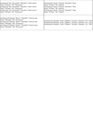 [email protected],"Jan","Kowalski","Dyrektor","Jaka? nazwa firmy","B?otna","20","Warszawa" [email protected],"Jan","Kowalski","Dyrektor","Jaka? nazwa firmy","B?otna","20","Warszawa" [email protected],"Jan","Kowalski","Dyrektor","Jaka? nazwa firmy","B?otna","20","Warszawa" [email protected],"Jacek","Nowak","Dyrektor","Inna firma","Pi?kna","30","Gda?sk" [email protected],"Jacek","Nowak","Dyrektor","Inna firma","Pi?kna","30","Gda?sk" [email protected],"Jacek","Nowak","Dyrektor","Inna firma","Pi?kna","30","Gda?sk" [email protected],"Maciej","Kuro?","Dyrektor","Jeszcze inne firma","Brzydka","40","Warszawa" [email protected],"Maciej","Kuro?","Dyrektor","Jeszcze inne firma","Brzydka","40","Warszawa" [email protected],"Maciej","Kuro?","Dyrektor","Jeszcze inne firma","Brzydka","40","Warszawa" [email protected],"Donald","Tusk","Obibok","Terefere","Smutna","54","?ód?" [email protected],"Donald","Tusk","Obibok","Terefere","Smutna","54","?ód?" [email protected],"Donald","Tusk","Obibok","Terefere","Smutna","54","?ód?"