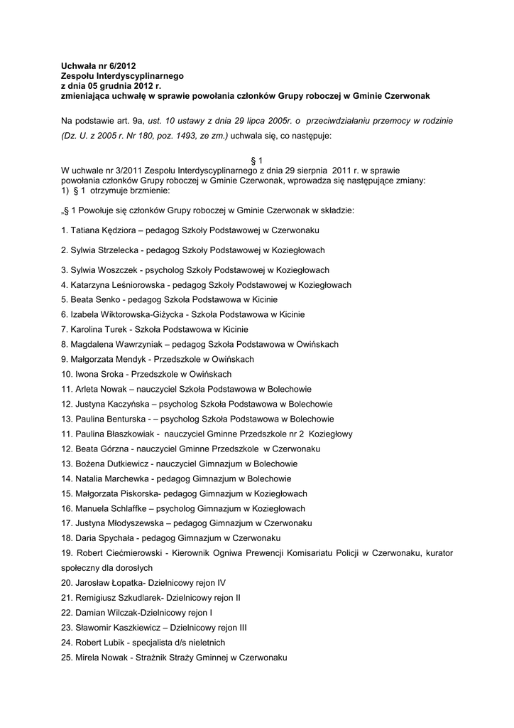 Uchwała nr 6/2012 Zespołu Interdyscyplinarnego z dnia 05 grudnia 2012 r. zmieniająca uchwałę w sprawie powołania członków Grupy roboczej w Gminie Czerwonak Na podstawie art. 9a, ust. 10 ustawy z dnia 29 lipca 2005r. o przeciwdziałaniu przemocy w rodzinie (Dz. U. z 2005 r. Nr 180, poz. 1493, ze zm.) uchwala się, co następuje: §1 W uchwale nr 3/2011 Zespołu Interdyscyplinarnego z dnia 29 sierpnia 2011 r. w sprawie powołania członków Grupy roboczej w Gminie Czerwonak, wprowadza się następujące zmiany: 1) § 1 otrzymuje brzmienie: „§ 1 Powołuje się członków Grupy roboczej w Gminie Czerwonak w składzie: 1. Tatiana Kędziora – pedagog Szkoły Podstawowej w Czerwonaku 2. Sylwia Strzelecka - pedagog Szkoły Podstawowej w Koziegłowach 3. Sylwia Woszczek - psycholog Szkoły Podstawowej w Koziegłowach 4. Katarzyna Leśniorowska - pedagog Szkoły Podstawowej w Koziegłowach 5. Beata Senko - pedagog Szkoła Podstawowa w Kicinie 6. Izabela Wiktorowska-GiŜycka - Szkoła Podstawowa w Kicinie 7. Karolina Turek - Szkoła Podstawowa w Kicinie 8. Magdalena Wawrzyniak – pedagog Szkoła Podstawowa w Owińskach 9. Małgorzata Mendyk - Przedszkole w Owińskach 10. Iwona Sroka - Przedszkole w Owińskach 11. Arleta Nowak – nauczyciel Szkoła Podstawowa w Bolechowie 12. Justyna Kaczyńska – psycholog Szkoła Podstawowa w Bolechowie 13. Paulina Benturska - – psycholog Szkoła Podstawowa w Bolechowie 11. Paulina Błaszkowiak - nauczyciel Gminne Przedszkole nr 2 Koziegłowy 12. Beata Górzna - nauczyciel Gminne Przedszkole w Czerwonaku 13. BoŜena Dutkiewicz - nauczyciel Gimnazjum w Bolechowie 14. Natalia Marchewka - pedagog Gimnazjum w Bolechowie 15. Małgorzata Piskorska- pedagog Gimnazjum w Koziegłowach 16. Manuela Schlaffke – psycholog Gimnazjum w Koziegłowach 17. Justyna Młodyszewska – pedagog Gimnazjum w Czerwonaku 18. Daria Spychała - pedagog Gimnazjum w Czerwonaku 19. Robert Ciećmierowski - Kierownik Ogniwa Prewencji Komisariatu Policji w Czerwonaku, kurator społeczny dla dorosłych 20. Jarosław Łopatka- Dzielnicowy rejon IV 21. Remigiusz Szkudlarek- Dzielnicowy rejon II 22. Damian Wilczak-Dzielnicowy rejon I 23. Sławomir Kaszkiewicz – Dzielnicowy rejon III 24. Robert Lubik - specjalista d/s nieletnich 25. Mirela Nowak - StraŜnik StraŜy Gminnej w Czerwonaku 26. Paulina Otworowska –Marek - Kurator dla dorosłych Sąd Karny 27. Roland Staniek- Starszy Kurator dla dorosłych Sąd Karny 28. Zofia Przybysz- Kurator społeczny dla dorosłych 29. Maria Rębała- Kurator społeczny dla dorosłych 30. Łukasz Dobrzycki- Kurator Sądowy Wydział Rodzinny i Nieletnich 31. Agnieszka Ugorek-Macka- Kurator Społeczny Sądu Rodzinnego i Nieletnich 32. Jakub Dłubała- Kurator Społeczny Sądu Rodzinnego i Nieletnich 33. Ewa Wiśniewska- Kurator Społeczny Sądu Rodzinnego i Nieletnich 34. Karina Rybak- Kurator Społeczny Sądu Rodzinnego i Nieletnich 35. Maria Fortuniak – pielęgniarka ,, Pomoc’’ 36. Dorota Fraszewska- pielęgniarka ,, Pomoc’’ 37. Małgorzata Zielińska - pielęgniarka środowiskowa „Pro Familia w Koziegłowach 38. GraŜyna Lisiecka- pielęgniarka połoŜna Pro Familia w Koziegłowach 39. Ewa Gnalicka- pielęgniarka środowiskowa Pro Familia w Czerwonaku 40. Mariola Kurzawa- pielęgniarka połoŜna Pro Familia w Czerwonaku, Owińskach 41.Danuta Fabiańska- pielęgniarka środowiskowa Pro Familia w Owińskach 42. ElŜbieta Nowak- pielęgniarka środowiskowa Pro Familia w Owińskach 43. GraŜyna Sikora- pielęgniarka środowiskowa „VENA” Koziegłowy 44. Halina Hołoga- pielęgniarka środowiskowa „VENA” Koziegłowy 45. Ewa Niestarta – Poradnia Psychologiczno-Pedagogiczna Czerwonak 46. ElŜbieta Szutowicz-Rozwadowska - Poradnia Psych – Pedag. Czerwonak 47. Anna Szafrańska - Gminna Komisja Rozwiązywania Problemów Alkoholowych 48. Izabela Frohlich- Starszy pracownik socjalny GOPS w Czerwonaku 49. Joanna Adamska – Kurach - Pracownik socjalny GOPS w Czerwonaku 50. Agnieszka Smolińska- Pracownik socjalny GOPS w Czerwonaku 51. Maria Jankowska- Pracownik socjalny GOPS w Czerwonaku 52. Inga Rybicka- Specjalista pracy socjalnej GOPS w Czerwonaku 53. Hanna Zawadka- Starszy pracownik socjalny GOPS w Czerwonaku 54. Bernadeta Szulczewska- Pracownik socjalny GOPS w Czerwonaku 55. Monika Maciejewska-Dłubała - Kierownik sekcji metodycznej GOPS w Czerwonaku 56. Agnieszka Grzeszak - Opiekun świetlicy opiekuńczo-wychowawczej w Czerwonaku 57. Malwina Król- Opiekun świetlicy opiekuńczo-wychowawczej w Koziegłowach 58. Lidia Wawrzyniak - Pajchrowska - Opiekun świetlicy opiekuńczo-wychowawczej w Czerwonaku 59. Dorota Stencel- Opiekun świetlicy opiekuńczo-wychowawczej w Czerwonaku” §2 Uchwała wchodzi w Ŝycie z dniem podjęcia.