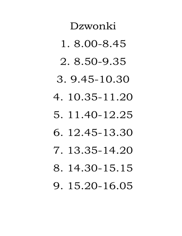 Dzwonki 1. 8.00-8.45 2. 8.50-9.35 3. 9.45-10.30 4. 10.35-11.20 5. 11.40-12.25 6. 12.45-13.30 7. 13.35-14.20 8. 14.30-15.15 9. 15.20-16.05