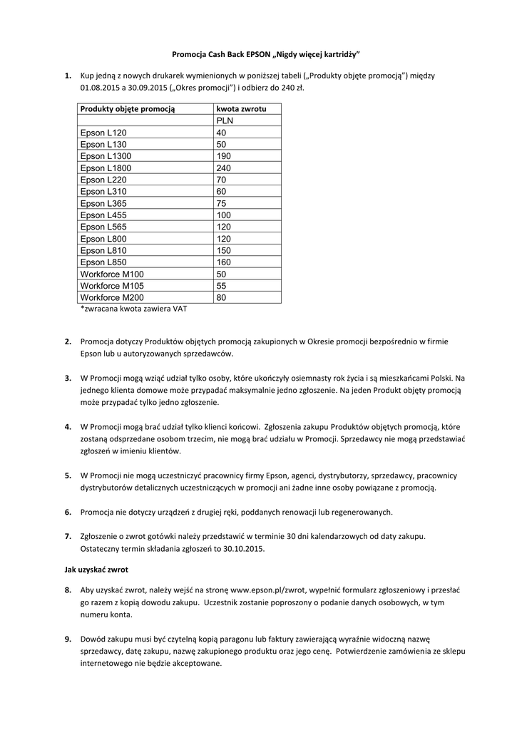 Promocja Cash Back EPSON „Nigdy więcej kartridży” 1. Kup jedną z nowych drukarek wymienionych w poniższej tabeli („Produkty objęte promocją”) między 01.08.2015 a 30.09.2015 („Okres promocji”) i odbierz do 240 zł. Produkty objęte promocją Epson L120 Epson L130 Epson L1300 Epson L1800 Epson L220 Epson L310 Epson L365 Epson L455 Epson L565 Epson L800 Epson L810 Epson L850 Workforce M100 Workforce M105 Workforce M200 *zwracana kwota zawiera VAT kwota zwrotu PLN 40 50 190 240 70 60 75 100 120 120 150 160 50 55 80 2. Promocja dotyczy Produktów objętych promocją zakupionych w Okresie promocji bezpośrednio w firmie Epson lub u autoryzowanych sprzedawców. 3. W Promocji mogą wziąd udział tylko osoby, które ukooczyły osiemnasty rok życia i są mieszkaocami Polski. Na jednego klienta domowe może przypadad maksymalnie jedno zgłoszenie. Na jeden Produkt objęty promocją może przypadad tylko jedno zgłoszenie. 4. W Promocji mogą brad udział tylko klienci koocowi. Zgłoszenia zakupu Produktów objętych promocją, które zostaną odsprzedane osobom trzecim, nie mogą brad udziału w Promocji. Sprzedawcy nie mogą przedstawiad zgłoszeo w imieniu klientów. 5. W Promocji nie mogą uczestniczyd pracownicy firmy Epson, agenci, dystrybutorzy, sprzedawcy, pracownicy dystrybutorów detalicznych uczestniczących w promocji ani żadne inne osoby powiązane z promocją. 6. Promocja nie dotyczy urządzeo z drugiej ręki, poddanych renowacji lub regenerowanych. 7. Zgłoszenie o zwrot gotówki należy przedstawid w terminie 30 dni kalendarzowych od daty zakupu. Ostateczny termin składania zgłoszeo to 30.10.2015. Jak uzyskad zwrot 8. Aby uzyskad zwrot, należy wejśd na stronę www.epson.pl/zwrot, wypełnid formularz zgłoszeniowy i przesład go razem z kopią dowodu zakupu. Uczestnik zostanie poproszony o podanie danych osobowych, w tym numeru konta. 9. Dowód zakupu musi byd czytelną kopią paragonu lub faktury zawierającą wyraźnie widoczną nazwę sprzedawcy, datę zakupu, nazwę zakupionego produktu oraz jego cenę. Potwierdzenie zamówienia ze sklepu internetowego nie będzie akceptowane. 10. Po otrzymaniu zgłoszenia zostanie wysłana wiadomośd e-mail z potwierdzeniem. 11. Zwrot pieniędzy zostanie dokonany w formie przelewu bankowego w terminie 30 dni od daty potwierdzenia zgłoszenia. Organizator wykona przelew bankowy tylko na konto bankowe założone w kraju, w którym dokonano zakupu produktu firmy Epson. Organizator nie ponosi odpowiedzialności za koszty przelewów bankowych poniesione w związku ze zwrotem pieniędzy. 12. Osoba rejestrująca zgłoszenie ponosi odpowiedzialnośd za zarejestrowanie prawidłowych danych konta bankowego. Jeśli podano nieprawidłowe dane i Organizator dokona płatności, która zostanie odrzucona lub nie zostanie otrzymana przez uczestnika, Organizator nie będzie ponosił odpowiedzialności za ponowne dokonanie takiej płatności. Ograniczenia 13. W przypadku, gdy zwrot pieniędzy oznacza otrzymanie korzyści podlegającej opodatkowaniu, obowiązek opłacenia podatku spoczywa na odbiorcy. 14. Jeśli Produkt objęty promocją, który jest przedmiotem zgłoszenia, zostanie z jakiegokolwiek powodu zwrócony sprzedawcy, uprawnienie klienta do ubiegania się o zwrot pieniędzy przestanie obowiązywad, a pieniądze już wypłacone należy zwrócid Organizatorowi. 15. Organizator zastrzega sobie prawo do żądania dodatkowych dowodów, które pomogą zweryfikowad zgłoszenie, jeżeli uzna, że może ono nie byd uzasadnione. 16. Zgłoszenie nie zostanie przyjęte jeśli: a. Produkt objęty promocją nie został zakupiony w Okresie promocji b. Zgłoszenie nie zostało wypełnione w sposób kompletny c. Dowód zakupu nie został dostarczony lub był nieczytelny d. Zgłoszenie nie zostało przesłane w wymaganym terminie 30 dni kalendarzowych od daty zakupu e. Uczestnik nie zaakceptował regulaminu Dane osobowe 17. Dane osobowe zebrane podczas tej Promocji będą przetwarzane zgodnie z krajowymi Przepisami Prawa Ochrony Danych oraz przyjętymi przez Organizatora zasadami ochrony prywatności. W każdej chwili można zwrócid się do Organizatora promocji z prośbą o zmianę, objaśnienie lub usunięcie danych osobowych, wysyłając pismo na adres korespondencyjny Organizatora. 18. Dane osobowe mogą byd wykorzystywane przez Organizatora do informowania o produktach, usługach i wydarzeniach lub o innych elementach oferty Organizatora, które mogą interesowad Uczestnika, o ile Uczestnik udzielił zgody na takie wykorzystanie jego danych osobowych w momencie rejestracji na stronie internetowej Organizatora. Każdy otrzymany przez Uczestnika elektroniczny komunikat promocyjny będzie umożliwiad rezygnację z otrzymywania ofert promocyjnych. Informacje ogólne 19. Organizator nie ponosi odpowiedzialności za zagubione zgłoszenia. Organizator odrzuci zgłoszenia otrzymane po upływie ostatecznego terminu oraz zgłoszenia uznane za niekompletne, nieczytelne lub fałszywe. 20. Niniejsze warunki podlegają prawu kraju, w którym zakupiono produkt objęty promocją, a także jurysdykcji sądów właściwych w tym kraju. 21. Przez rejestrację urządzenia Uczestnik potwierdza, że zna, rozumie i zgadza się na niniejsze warunki. Organizator zastrzega sobie prawo do ich unieważnienia lub zmiany bez uprzedniego powiadomienia w przypadku zaistnienia okoliczności od niego niezależnych. Organizator: Organizatorem promocji jest firma Epson Europe B.V. z siedzibą w Amsterdamie w Holandii. Wszelką korespondencję prosimy kierowad na następujący adres: Epson Europe B.V., European Marketing Department, promocja ze zwrotem gotówki CEG PL ITS, Westside, London Road, Apsley, Hemel Hempstead, Herts HP3 9TD, Anglia